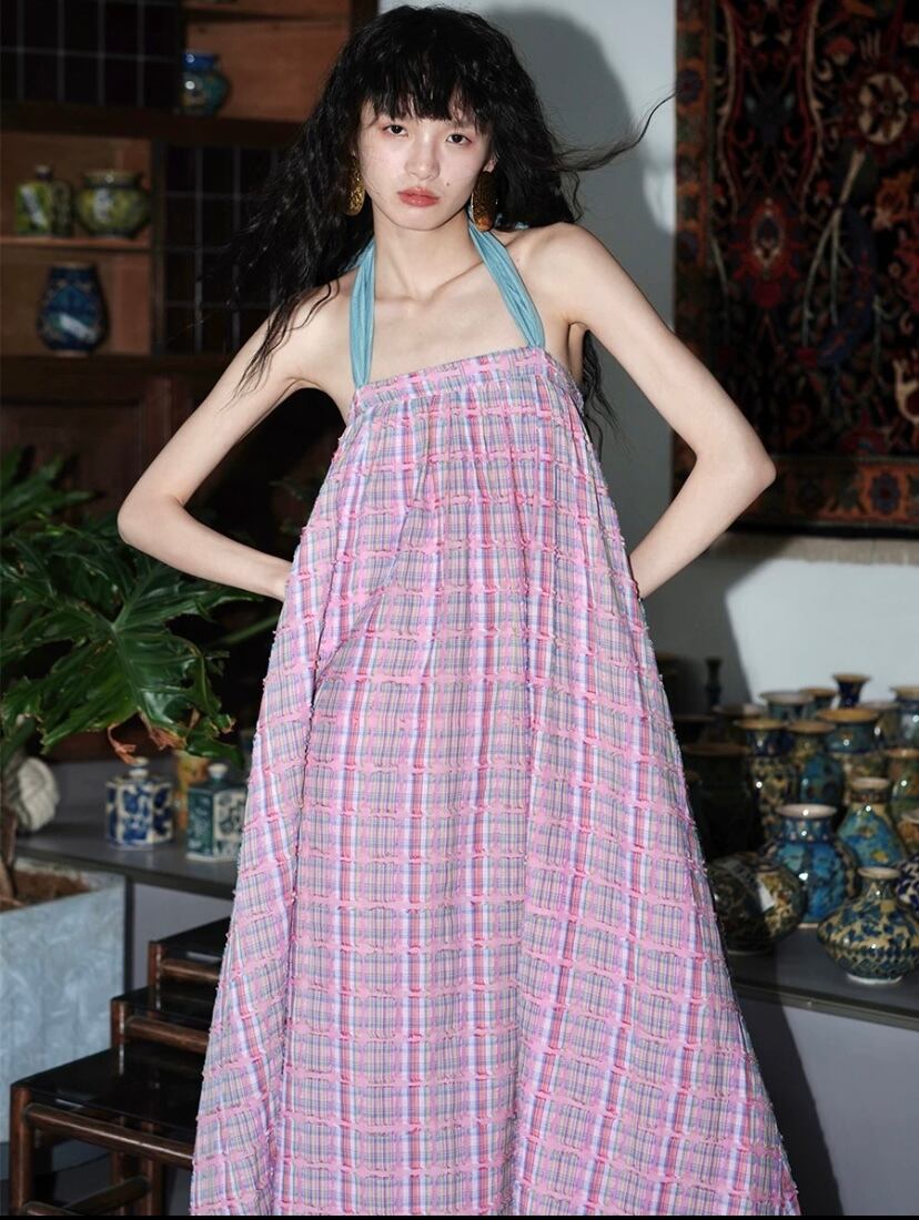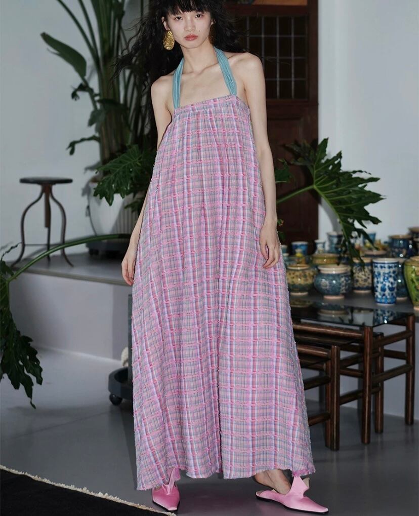 ピンク チェック ゆったり マキシ ワンピース ホルダーネック 水色 チェック