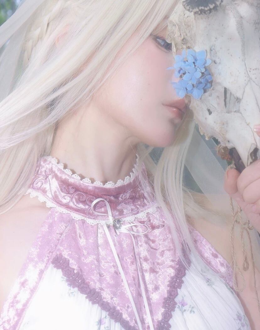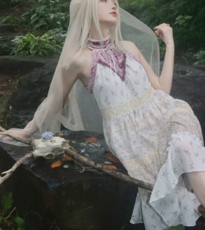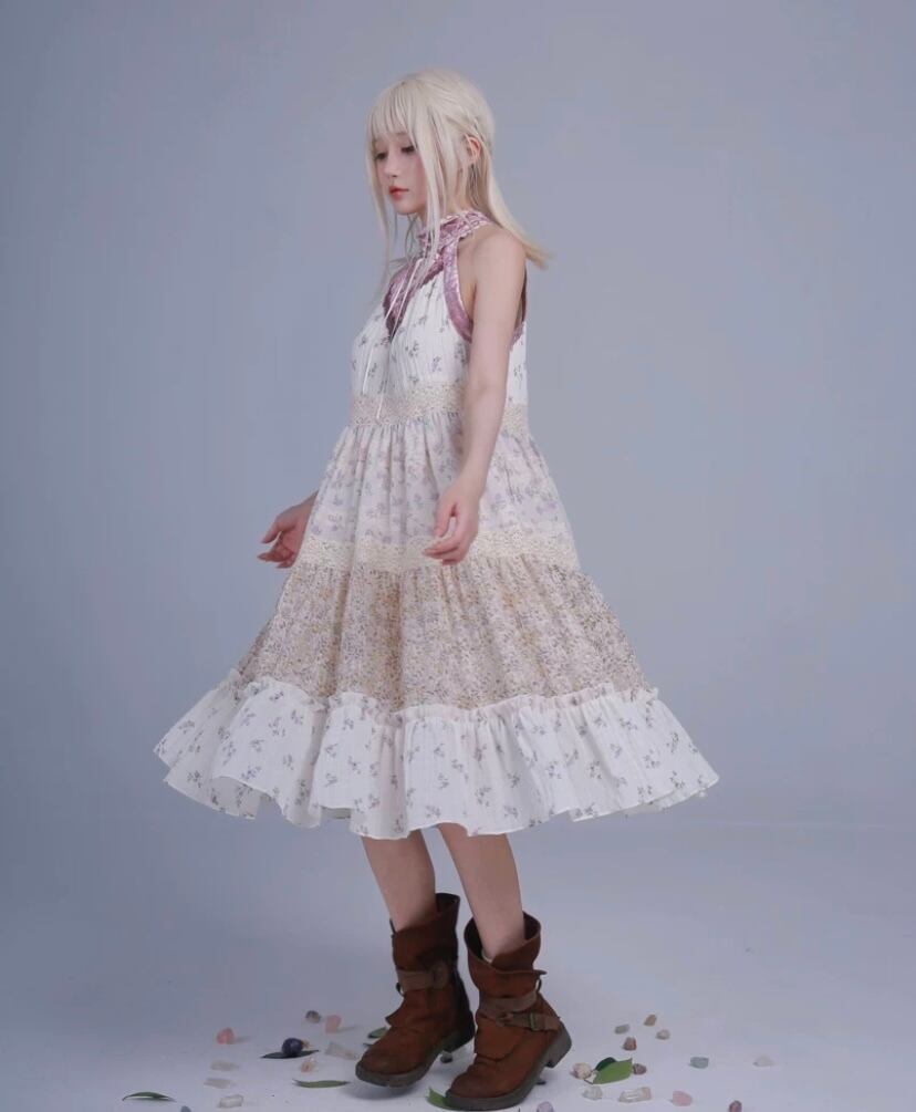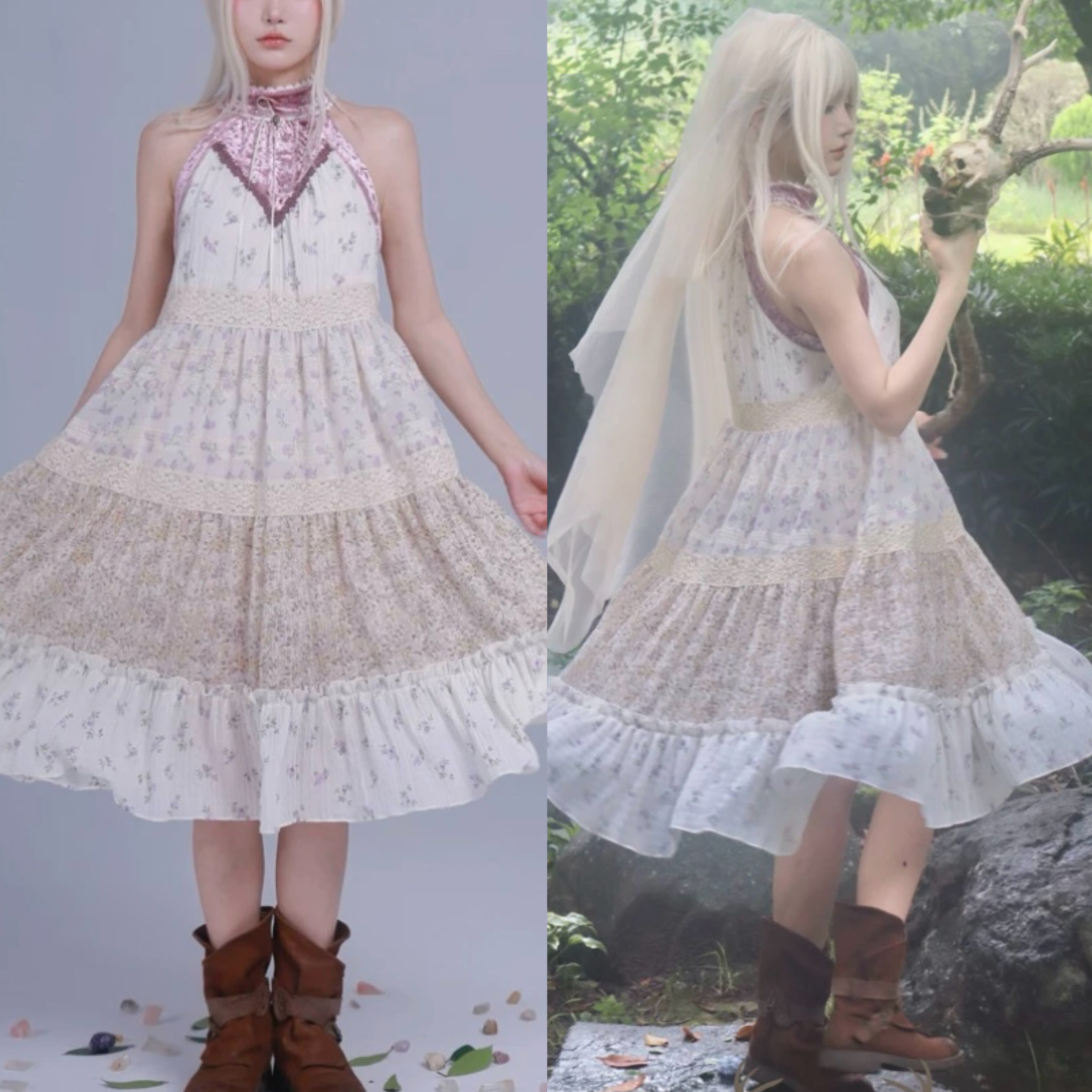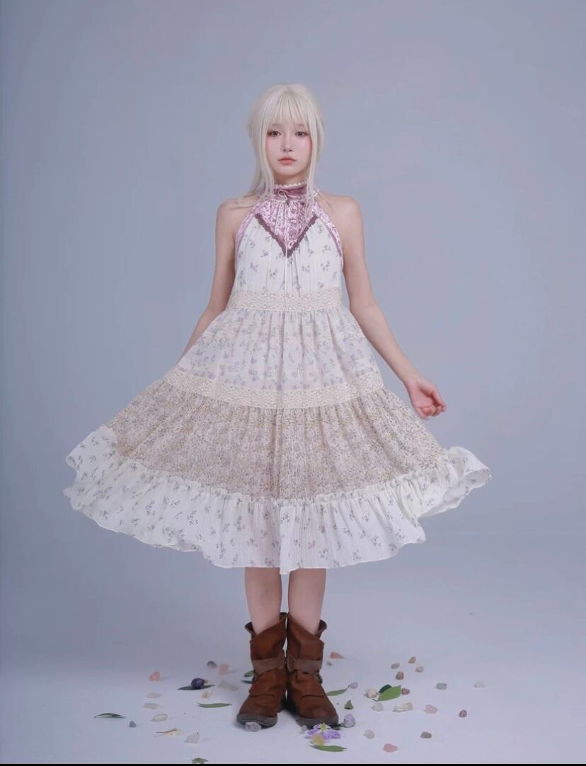 紫 花柄 フラワー ワンピース ホルダーネック チェック