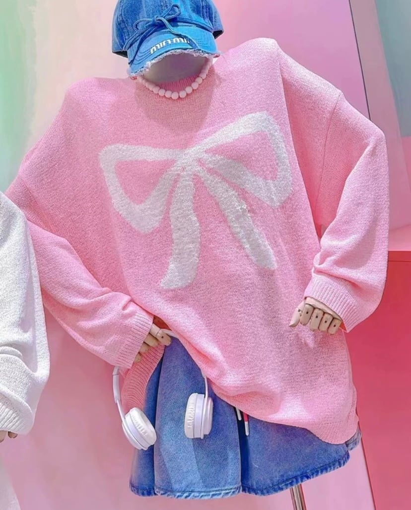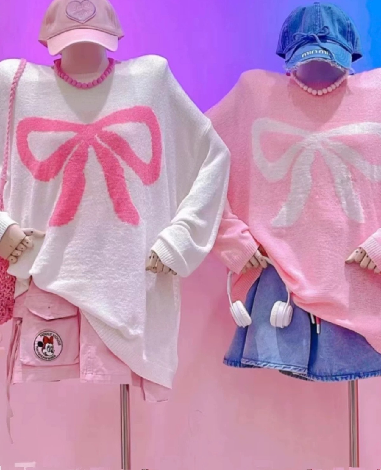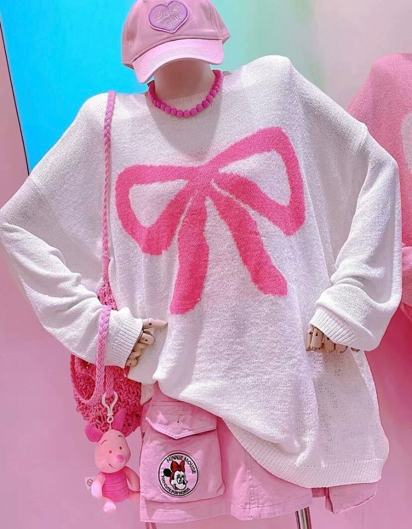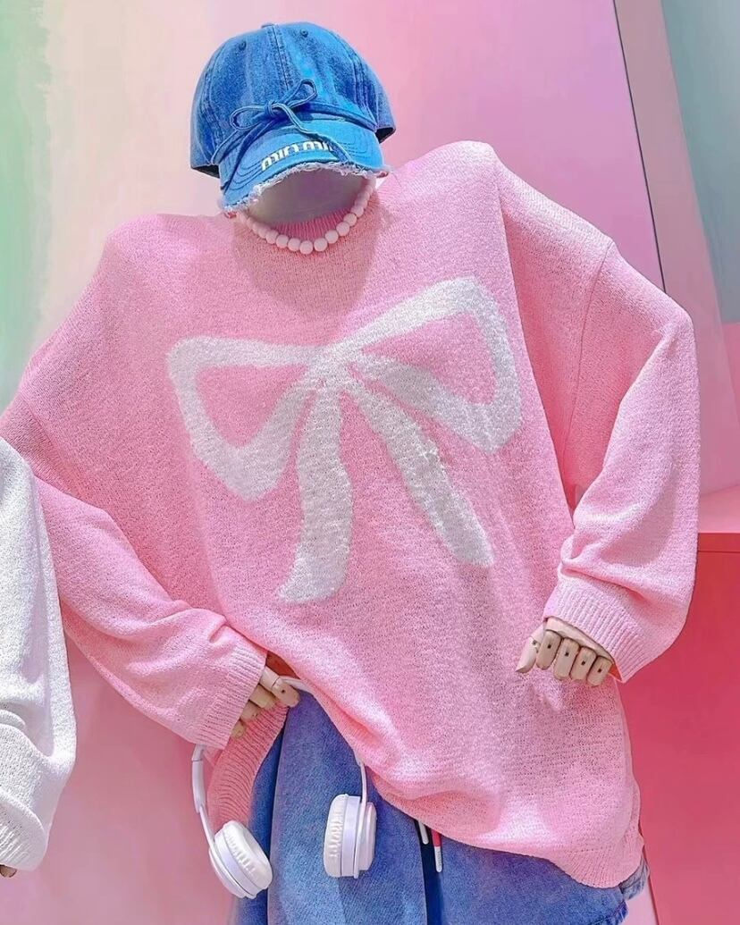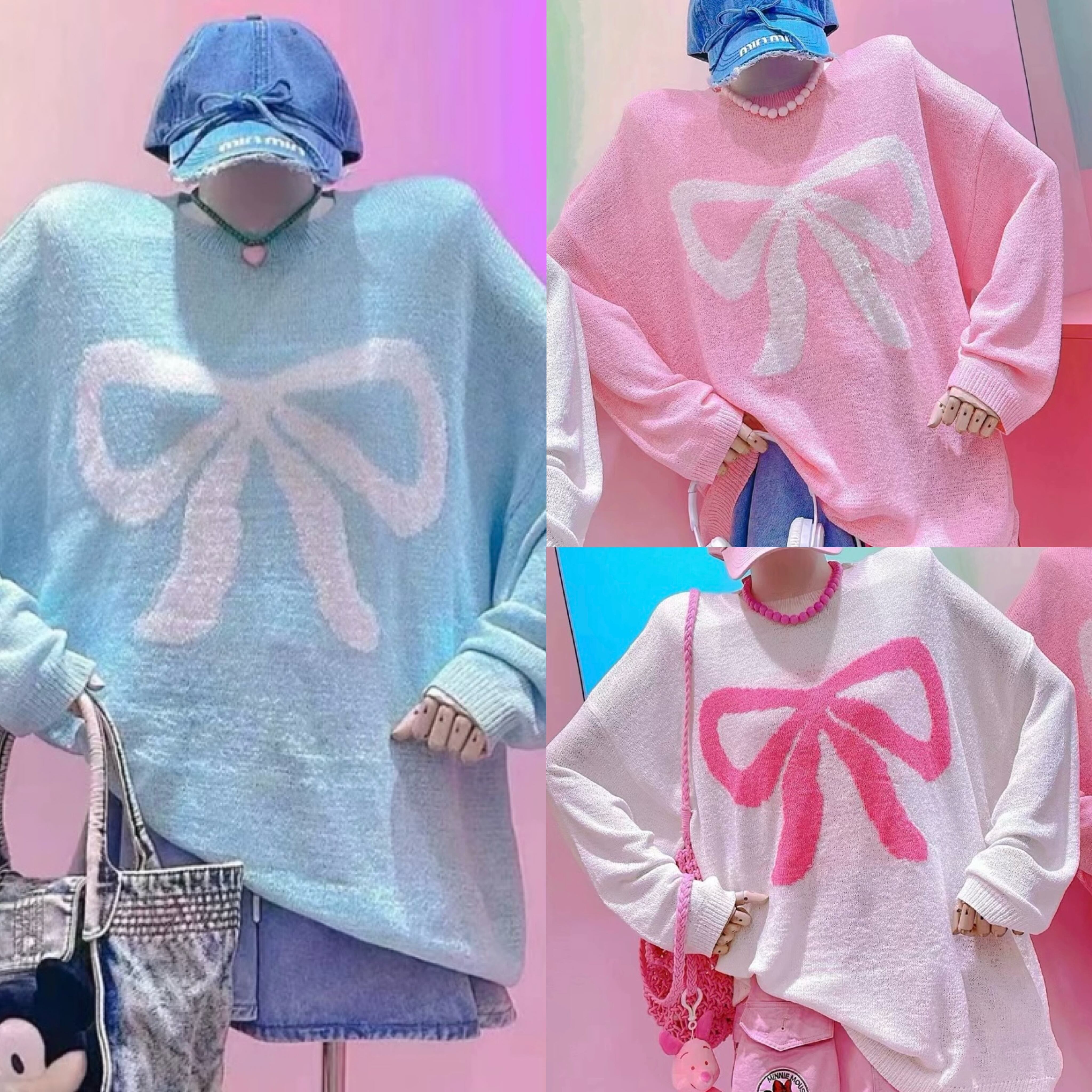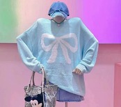 リボン トップス カーディガン 水色 ピンク 白 ゆったり ガーリー 可愛い セーター