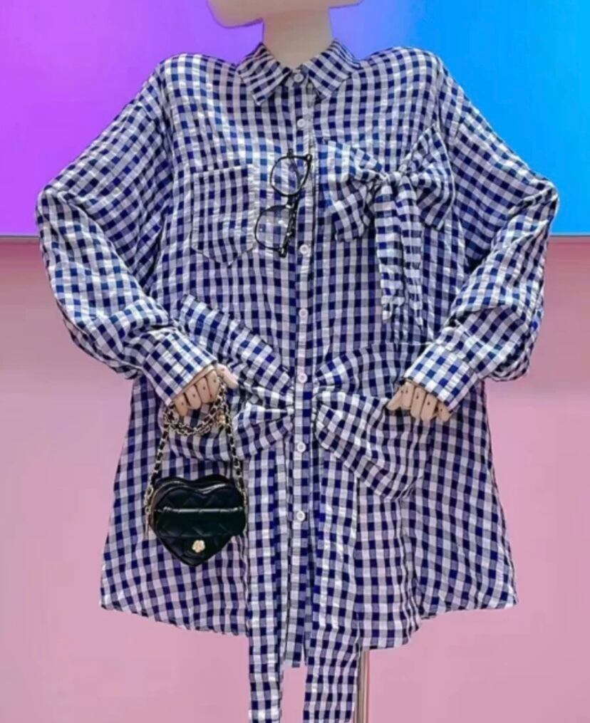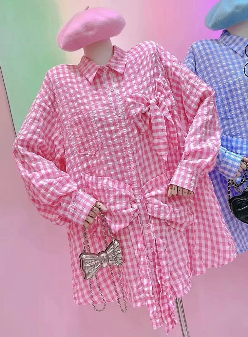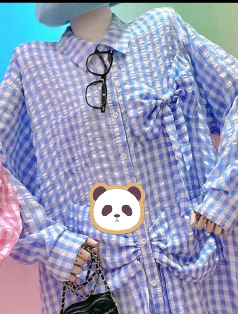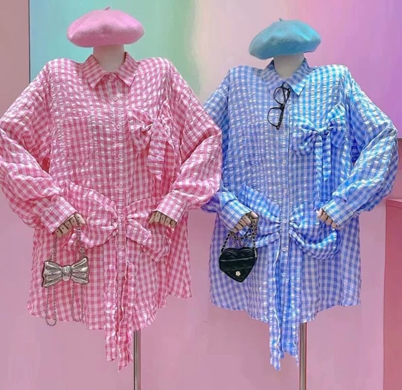水色 ネイビー ピンク リボン シャツ ワンピース チェック 可愛い リボン シャツ ガーリー 原宿