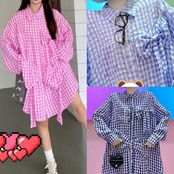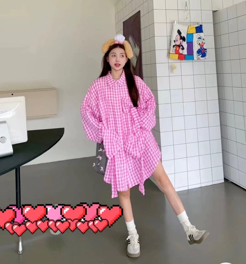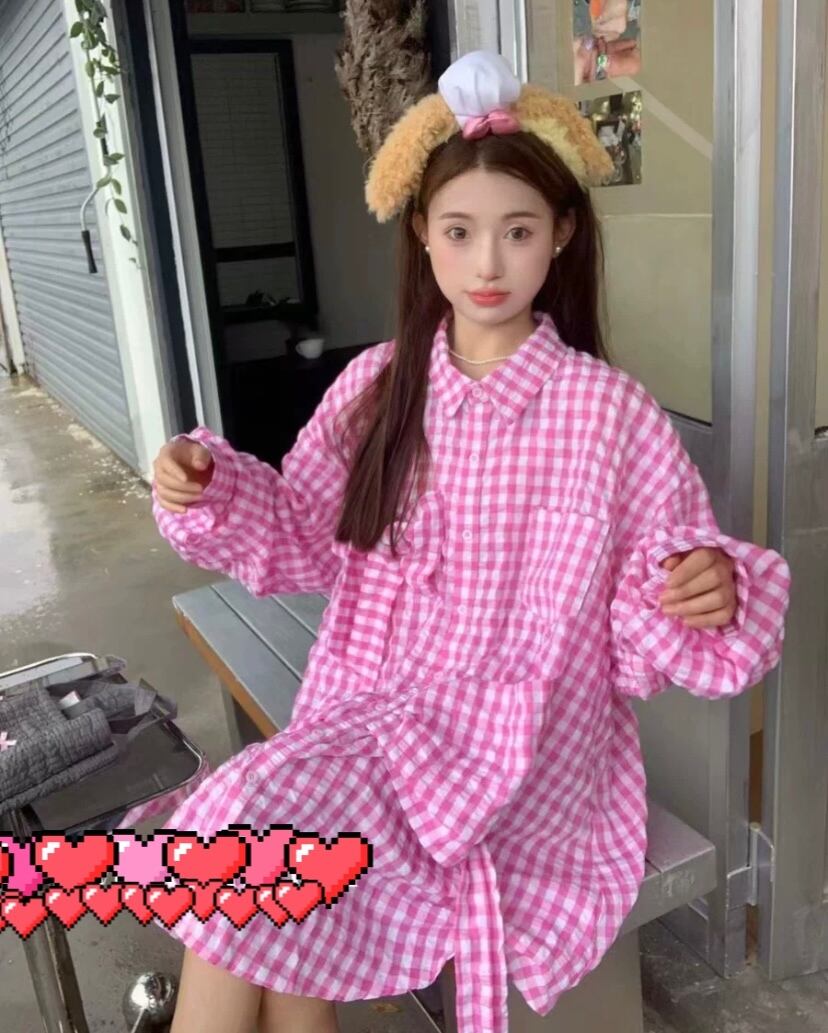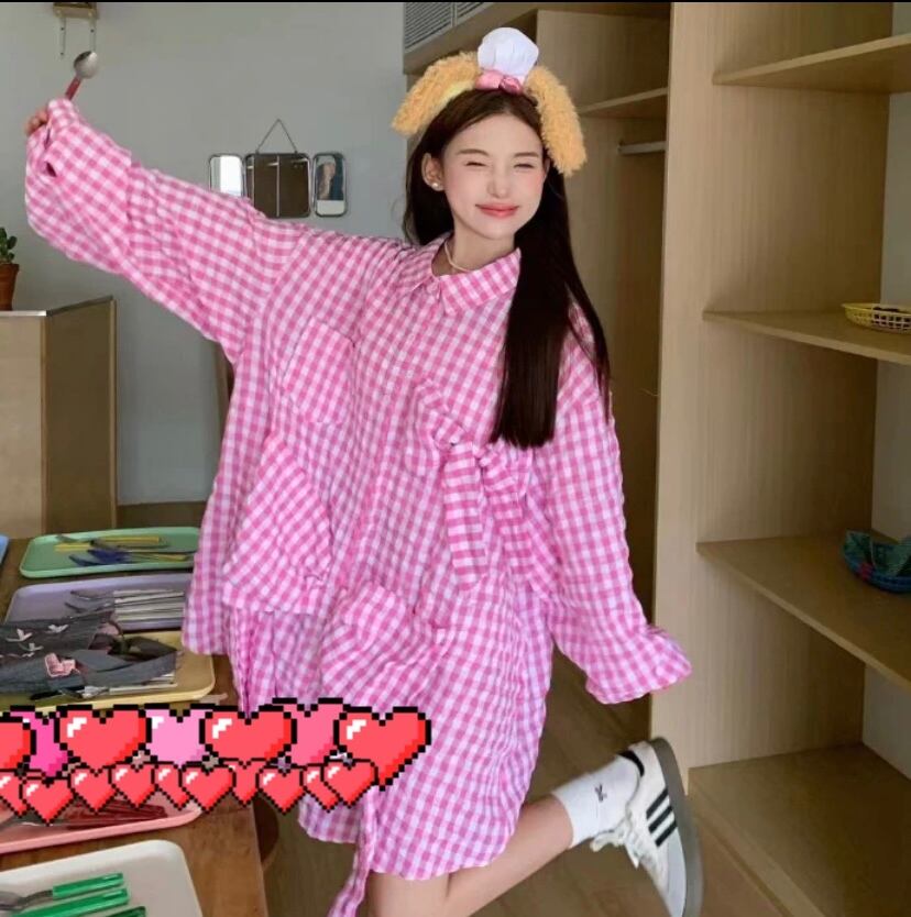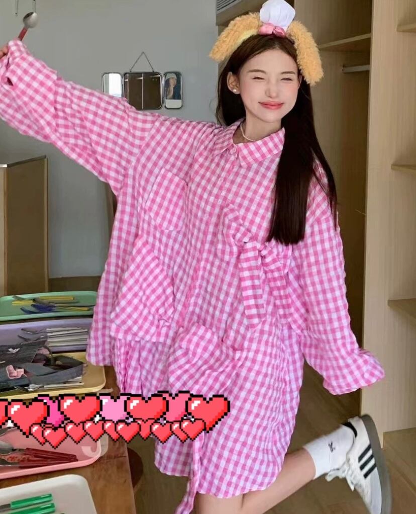 水色 ネイビー ピンク リボン シャツ ワンピース チェック 可愛い リボン シャツ ガーリー 原宿