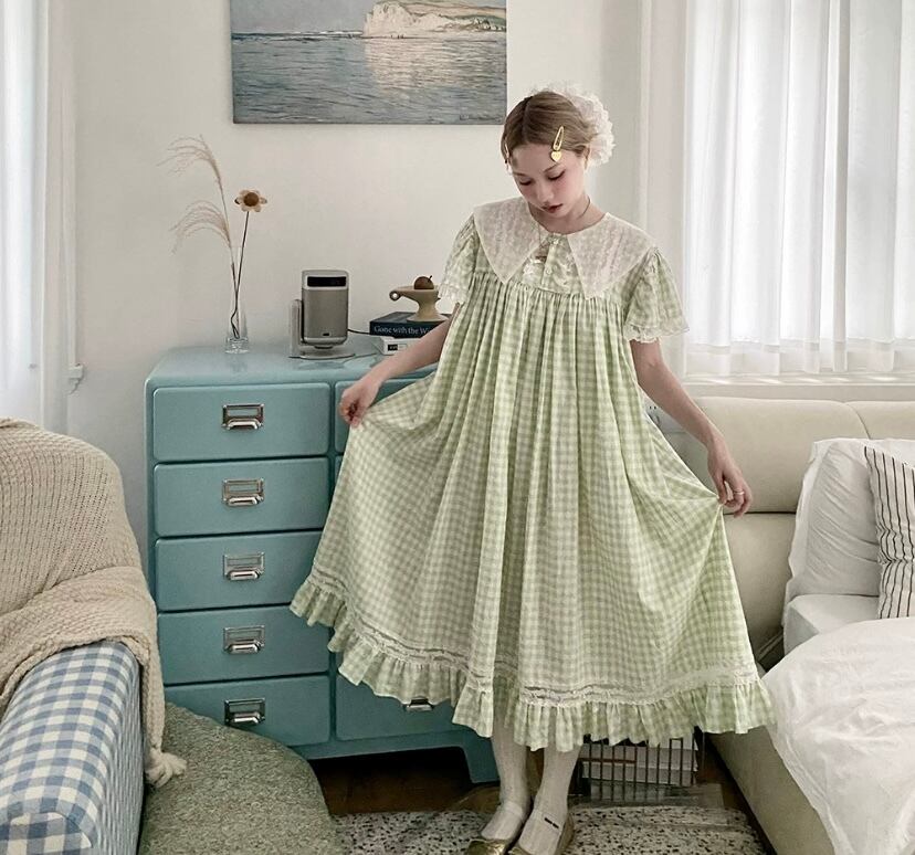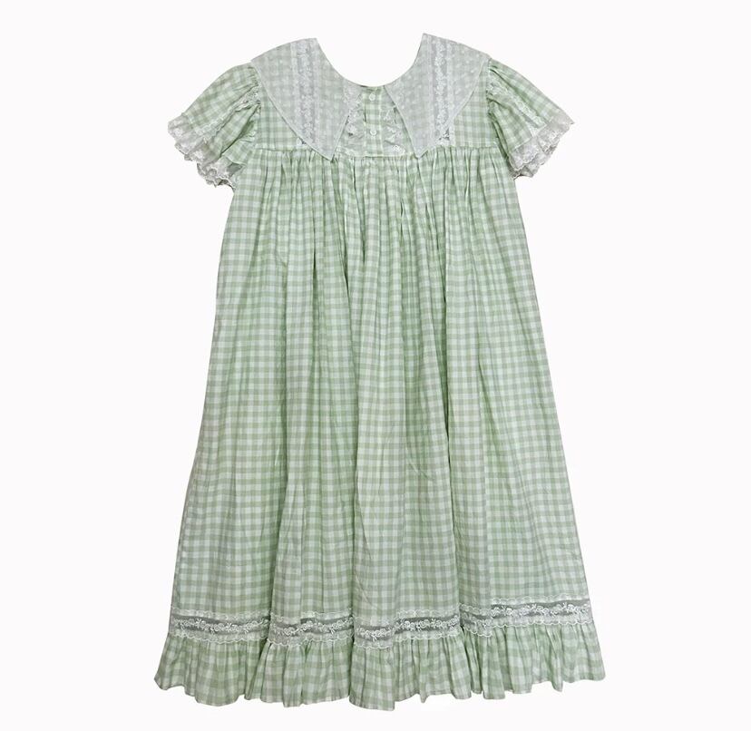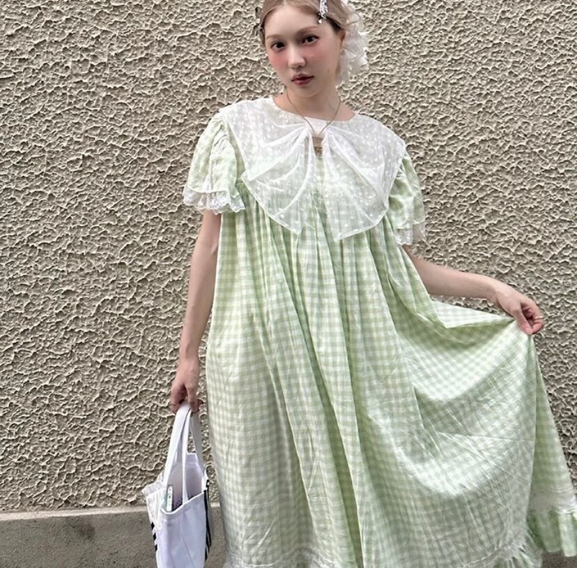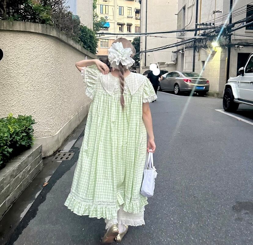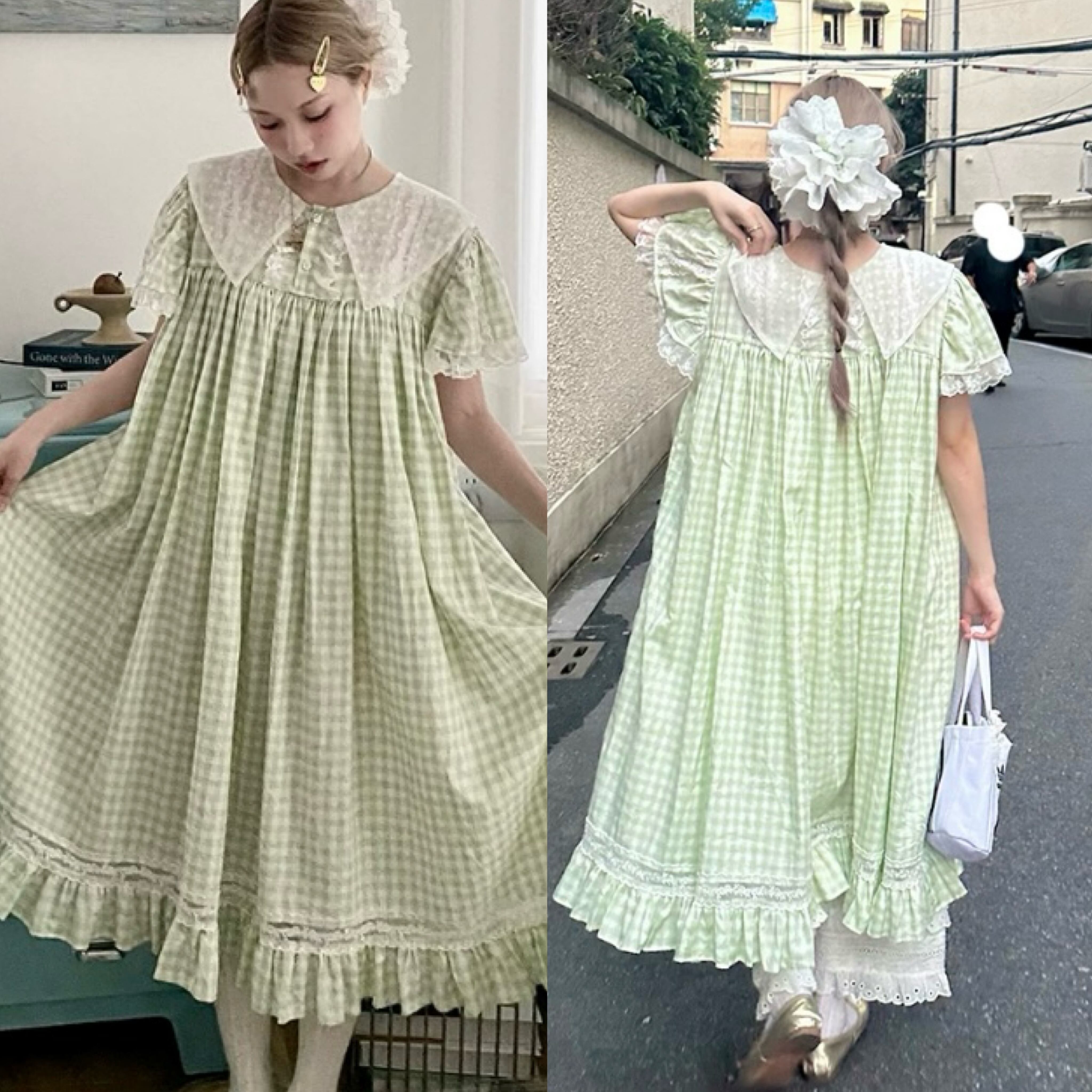 緑 ブラウス チェック 丸襟 ガーリー ゆったり 原宿 可愛い ブラウス XL