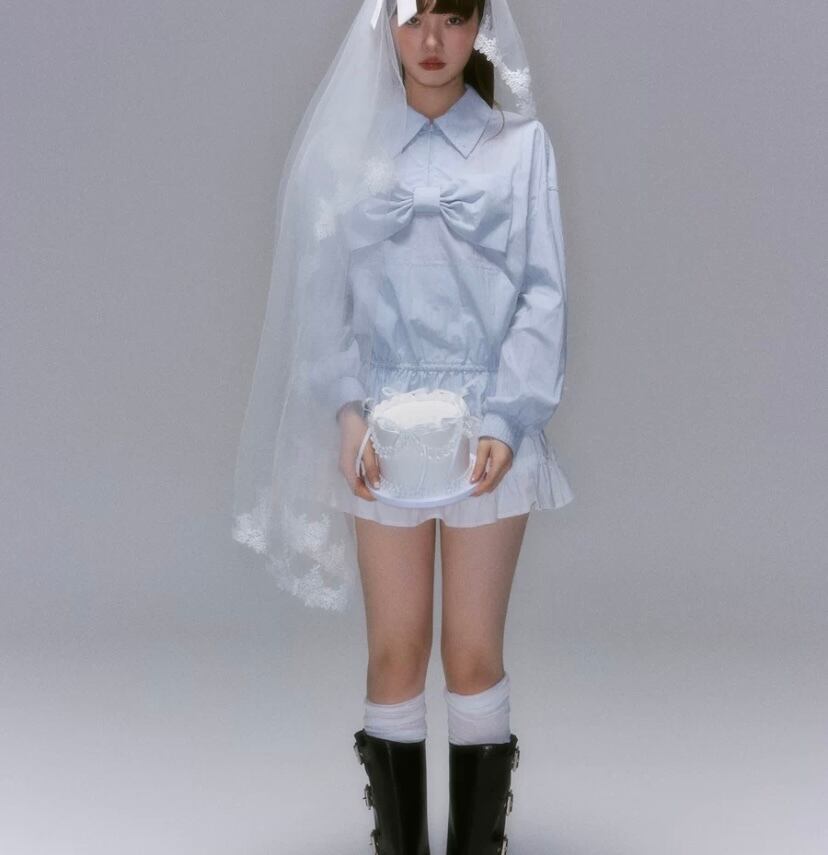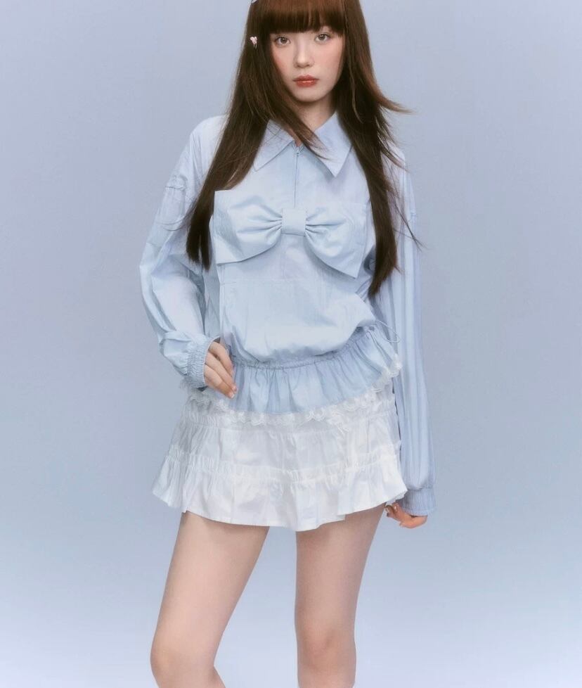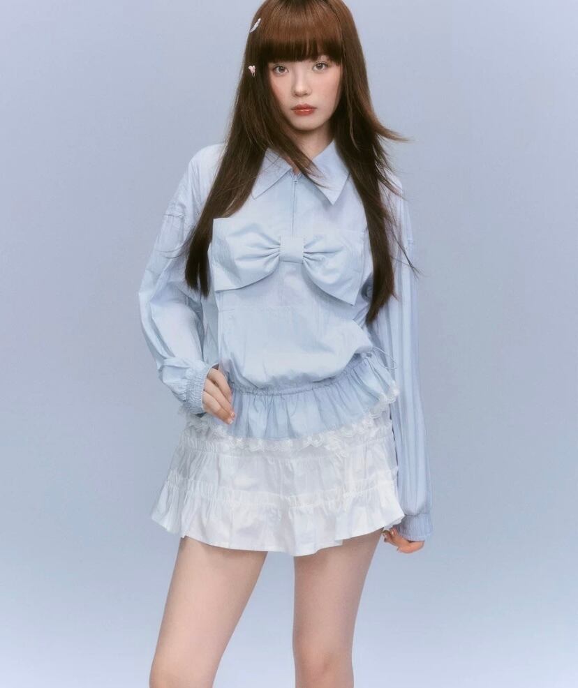 水色 リボン ガーリー 可愛い シャツ ブラウス トップス