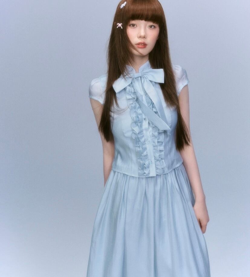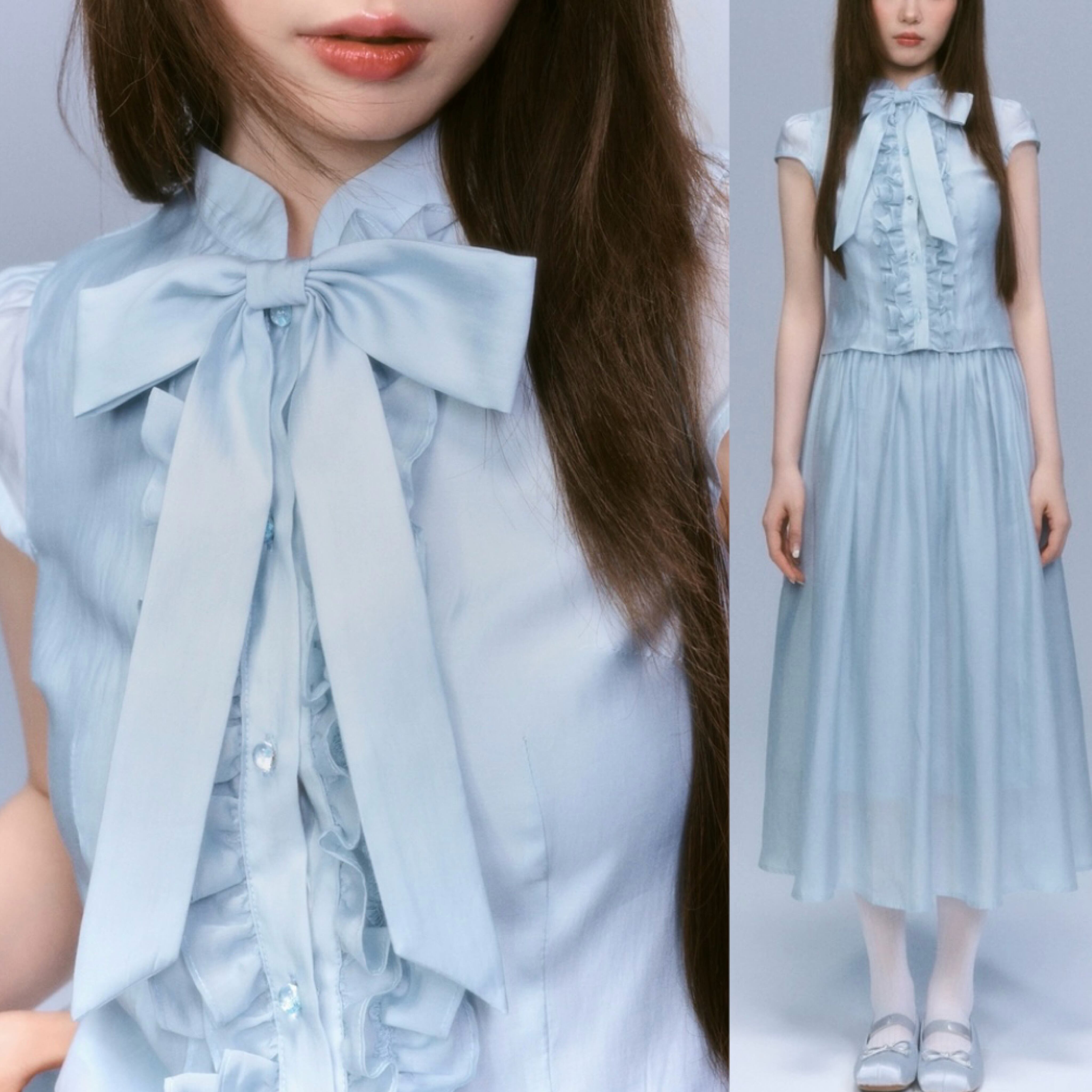【セットアップ】水色 ブラウス スカート ガーリー リボン 可愛い ワンピース お嬢様 原宿