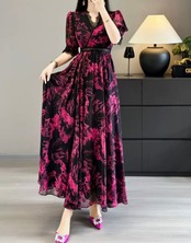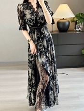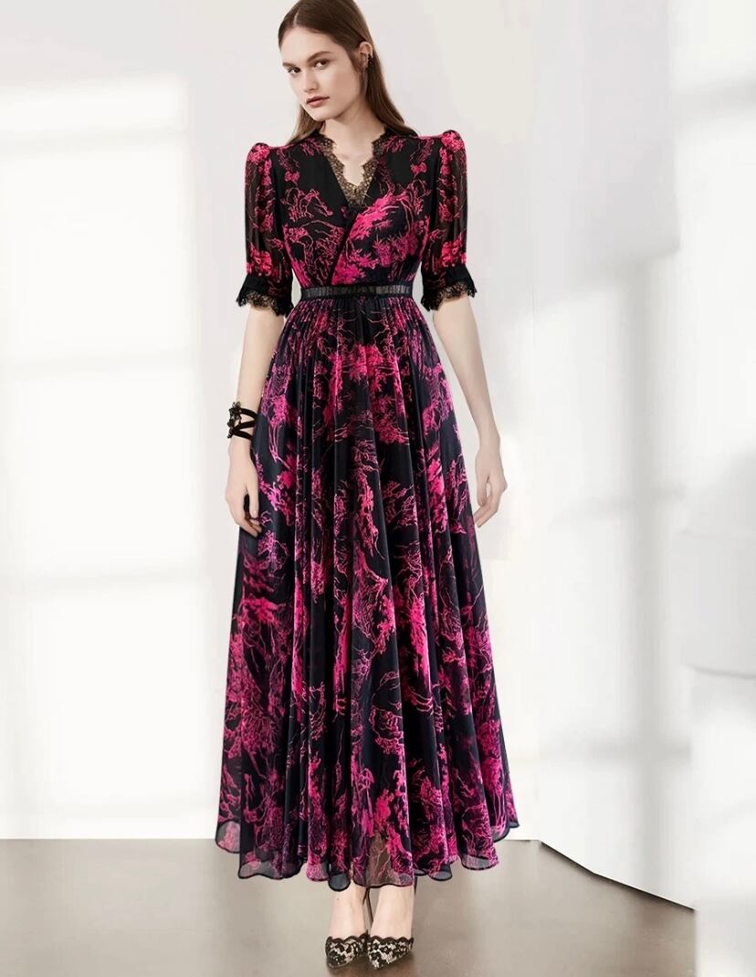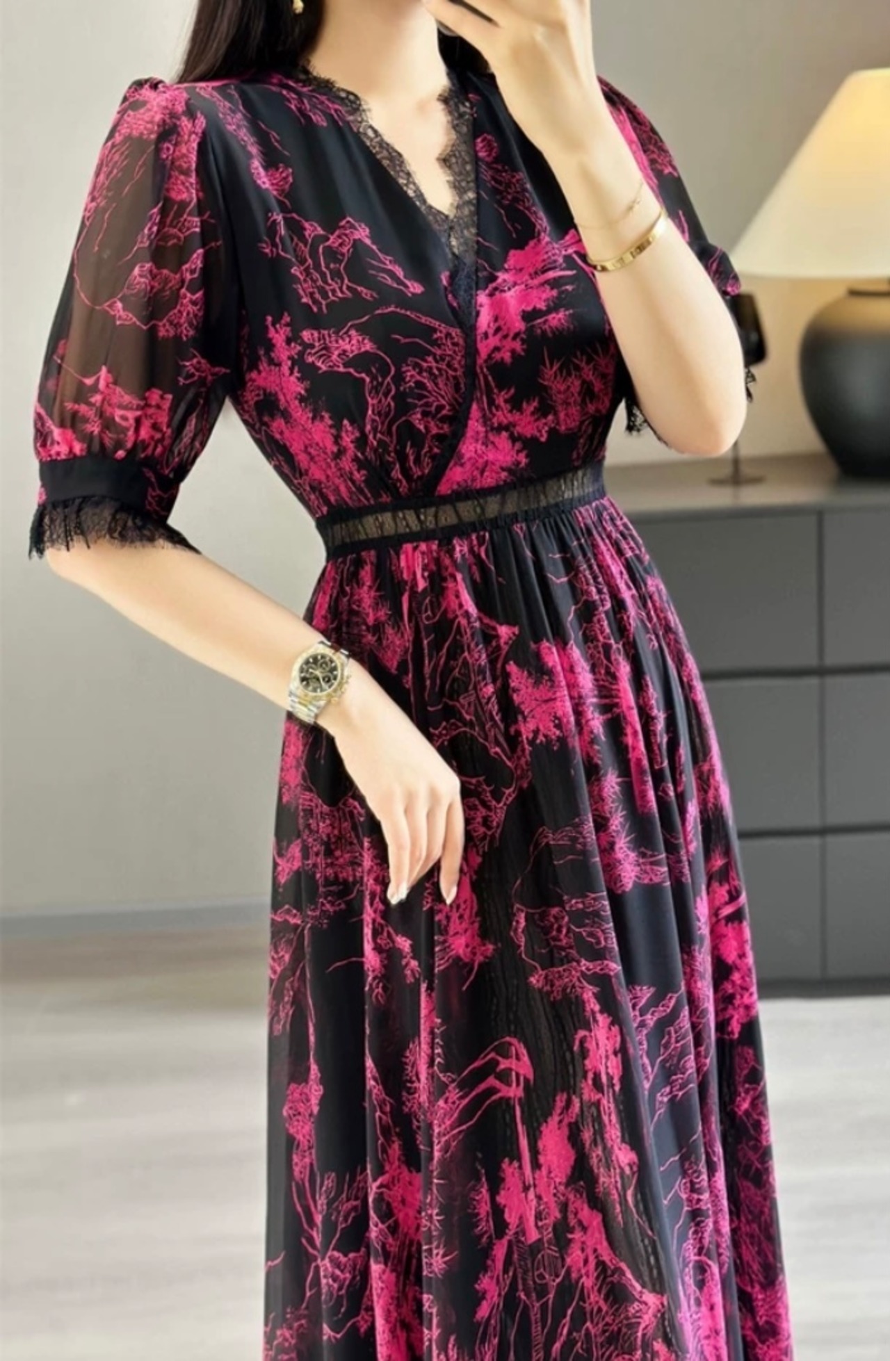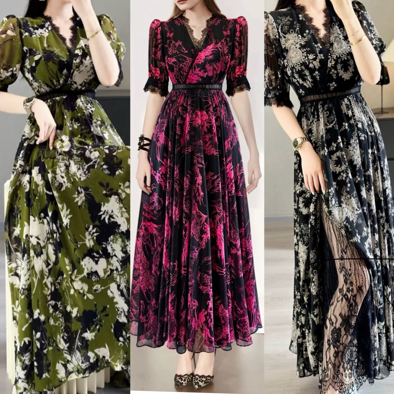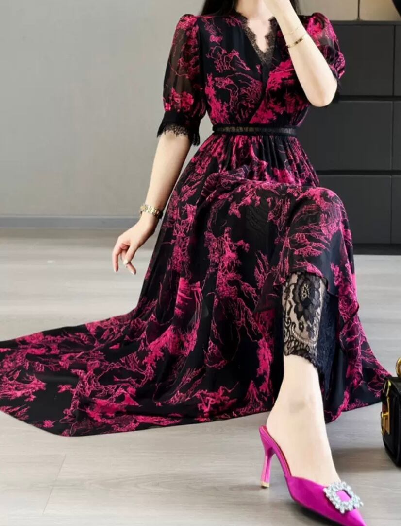 【XLまで】エレガント フリル ワンピース 花柄 ドレス 水色 紫 可愛い ブラウス ガーリー ピンク 緑 マーブル 黒 レース スリット
