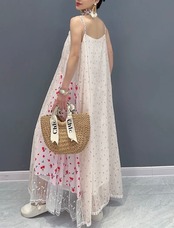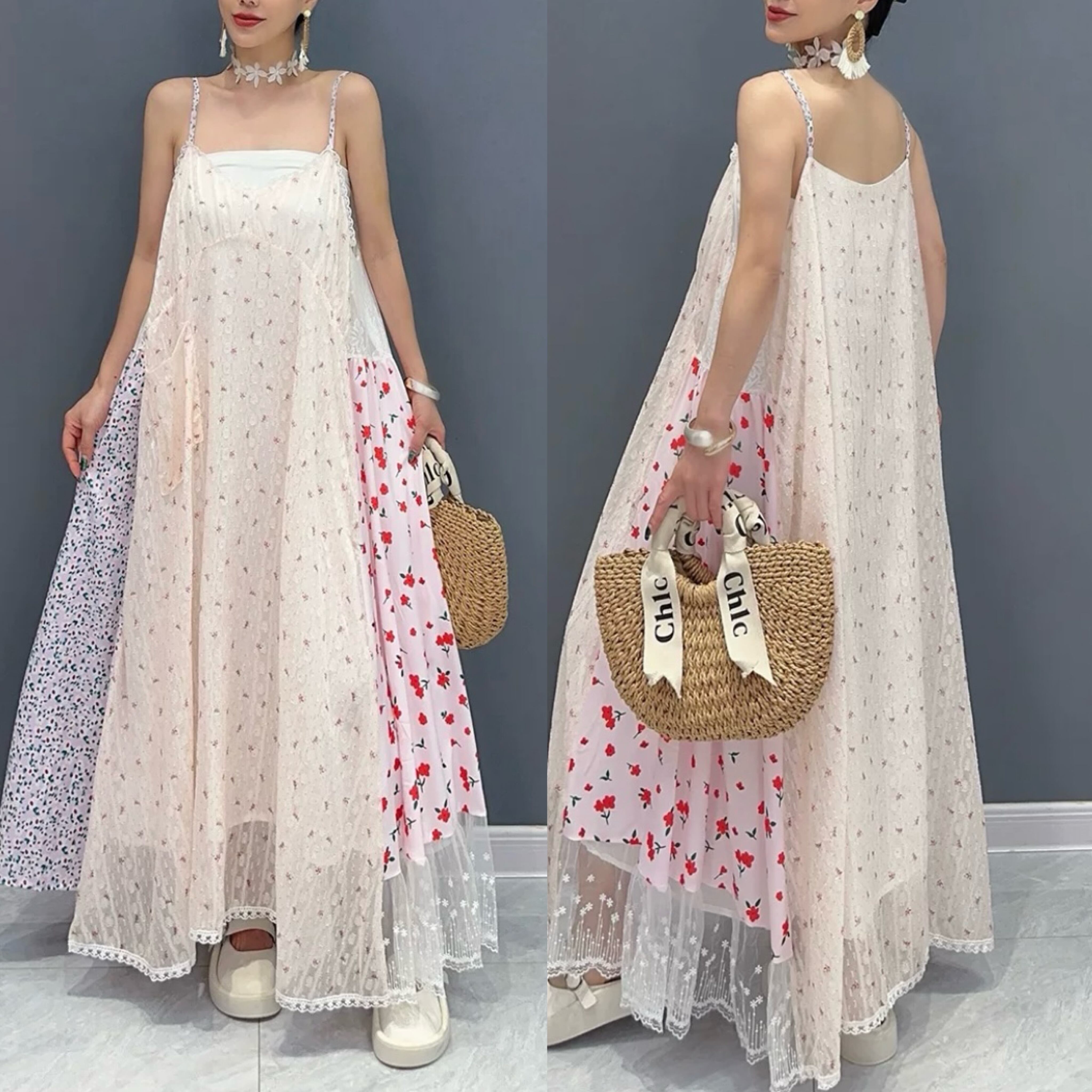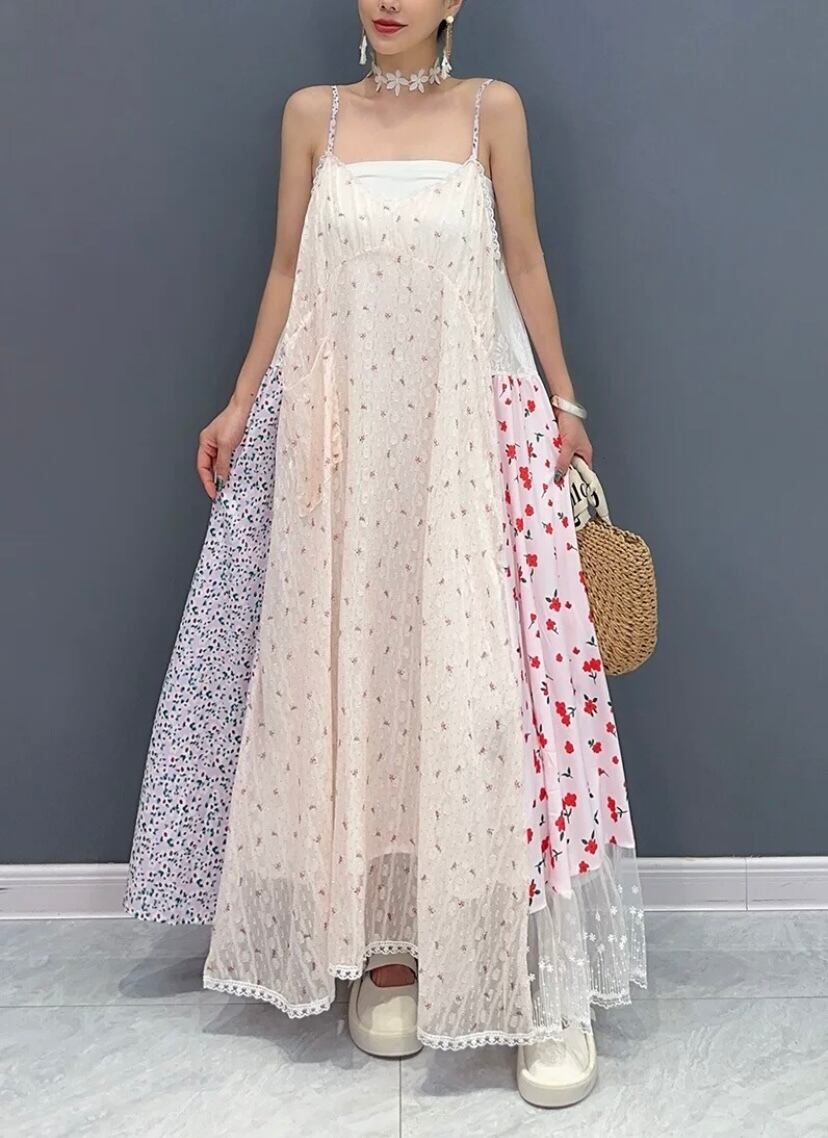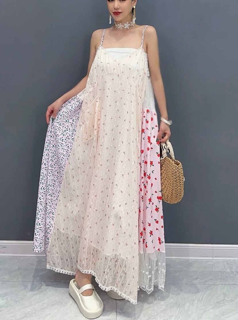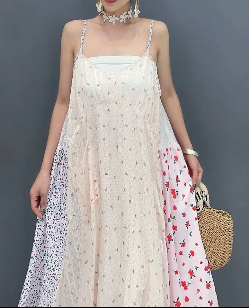 キャミソール パッチワーク 可愛い フレア ワンピース ピンク チェック