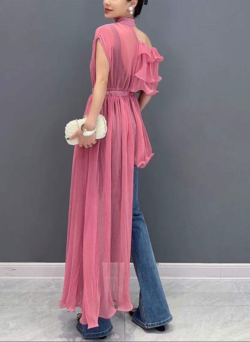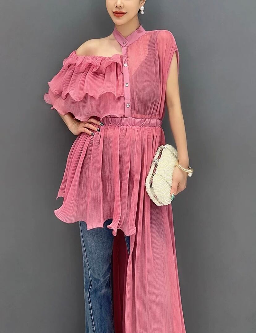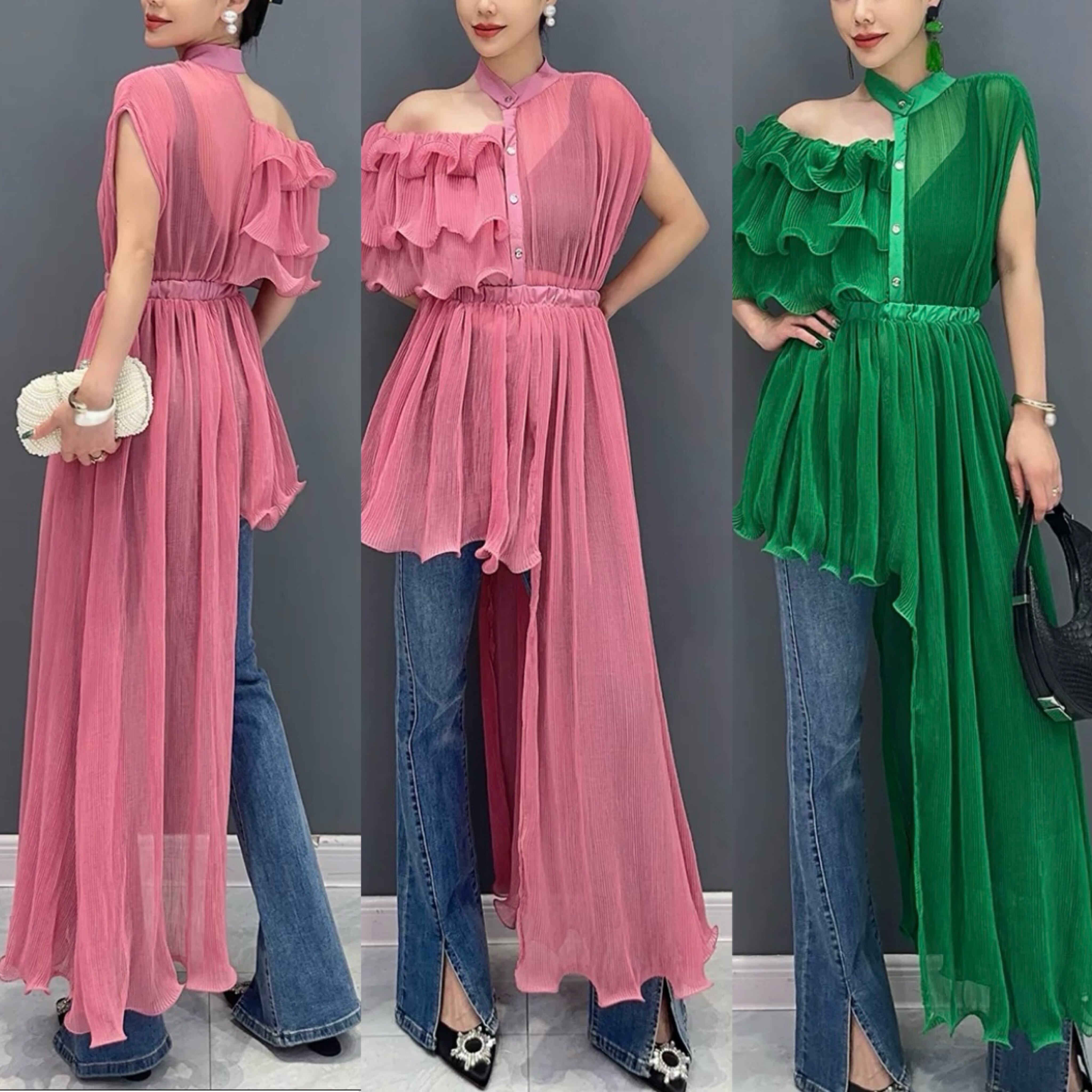 ピンク グリーン 緑 ブラウス ワンピース シースルー