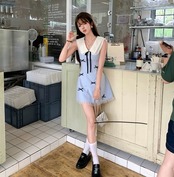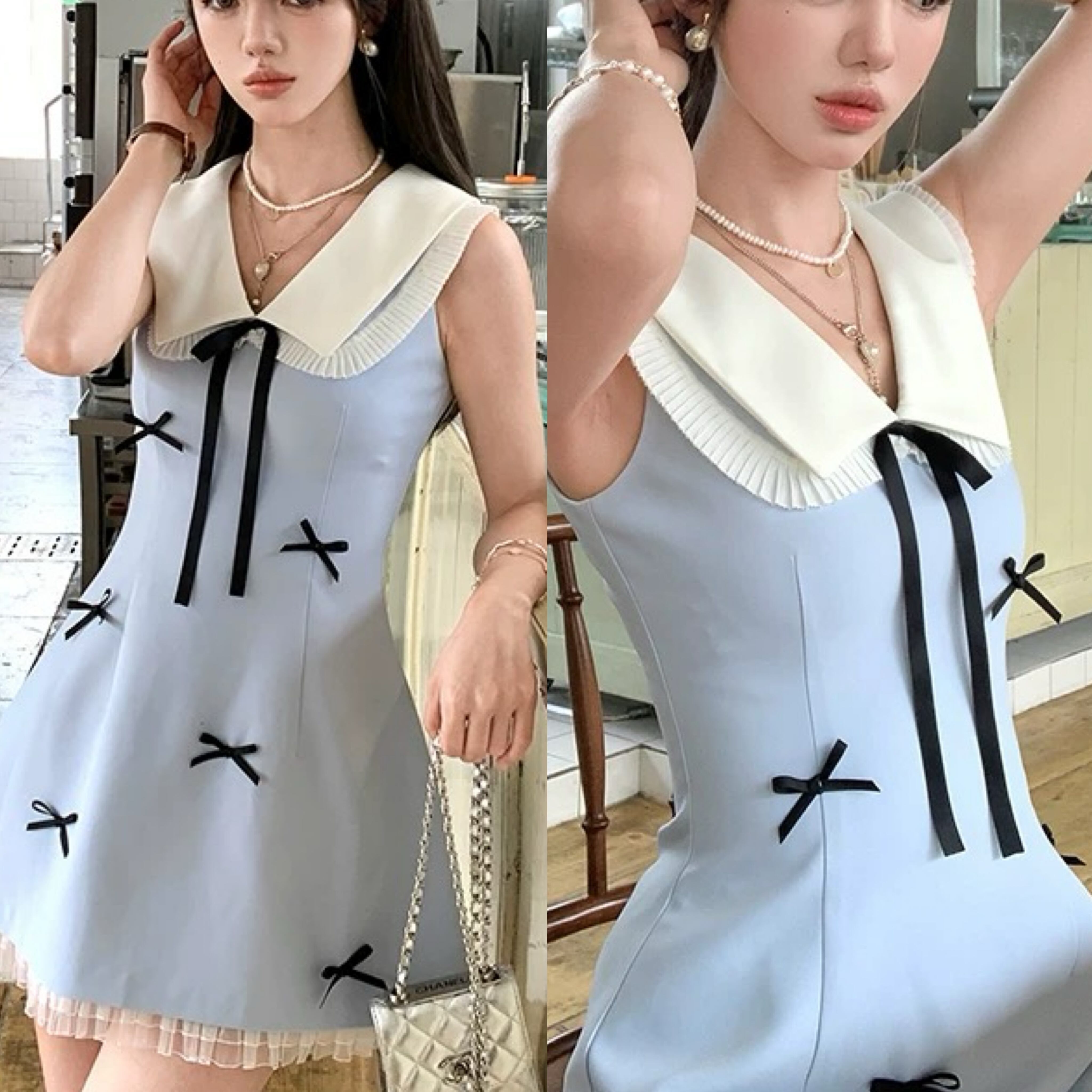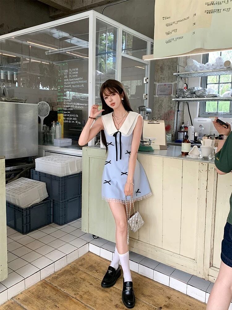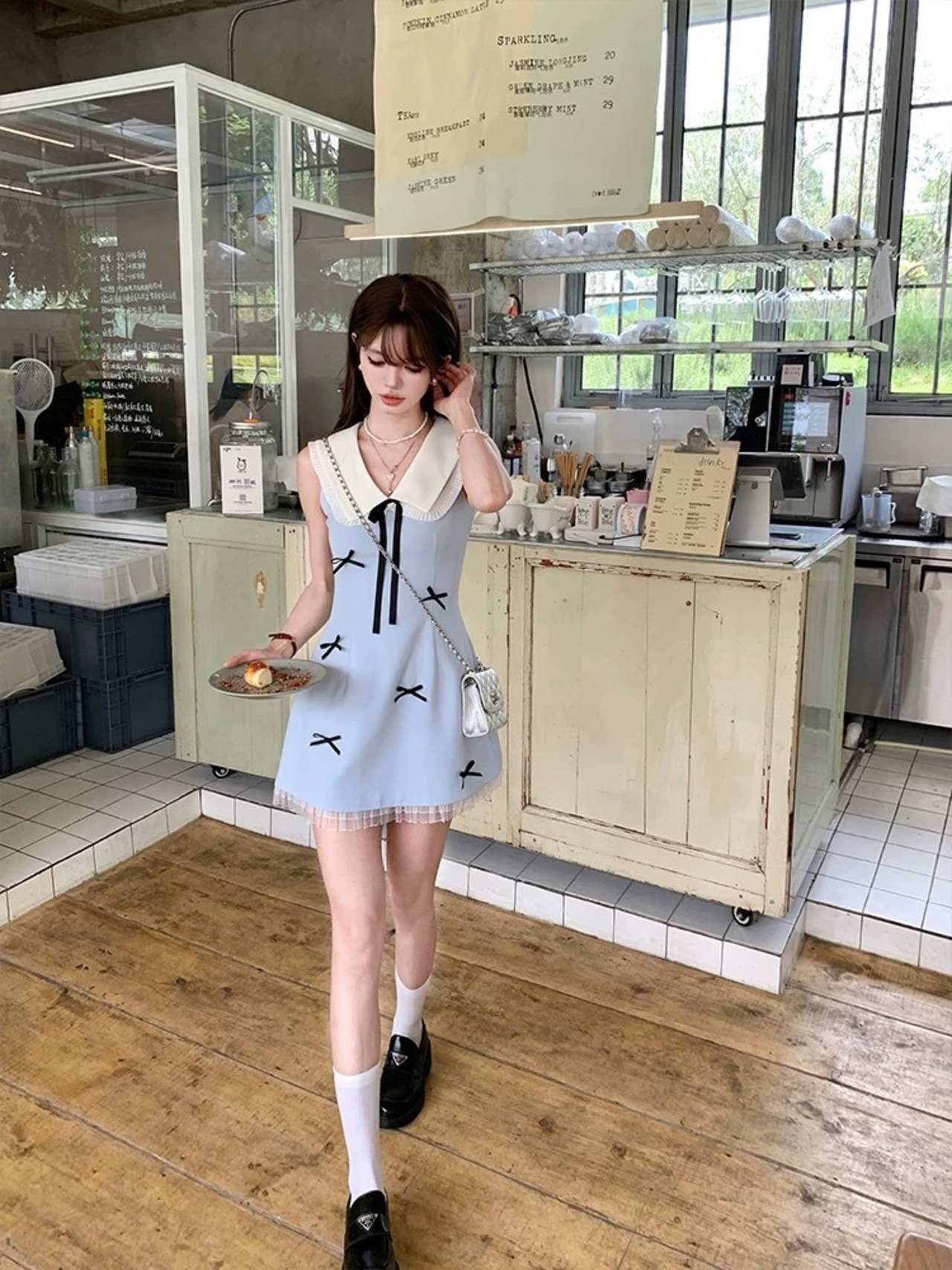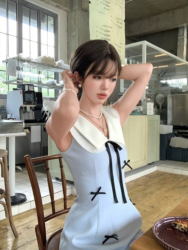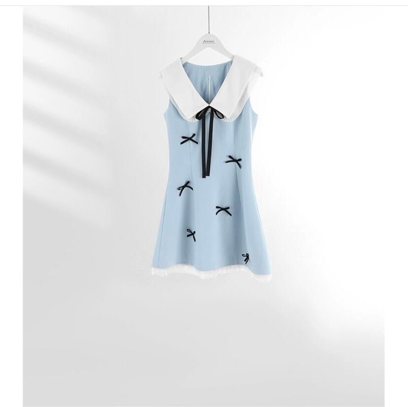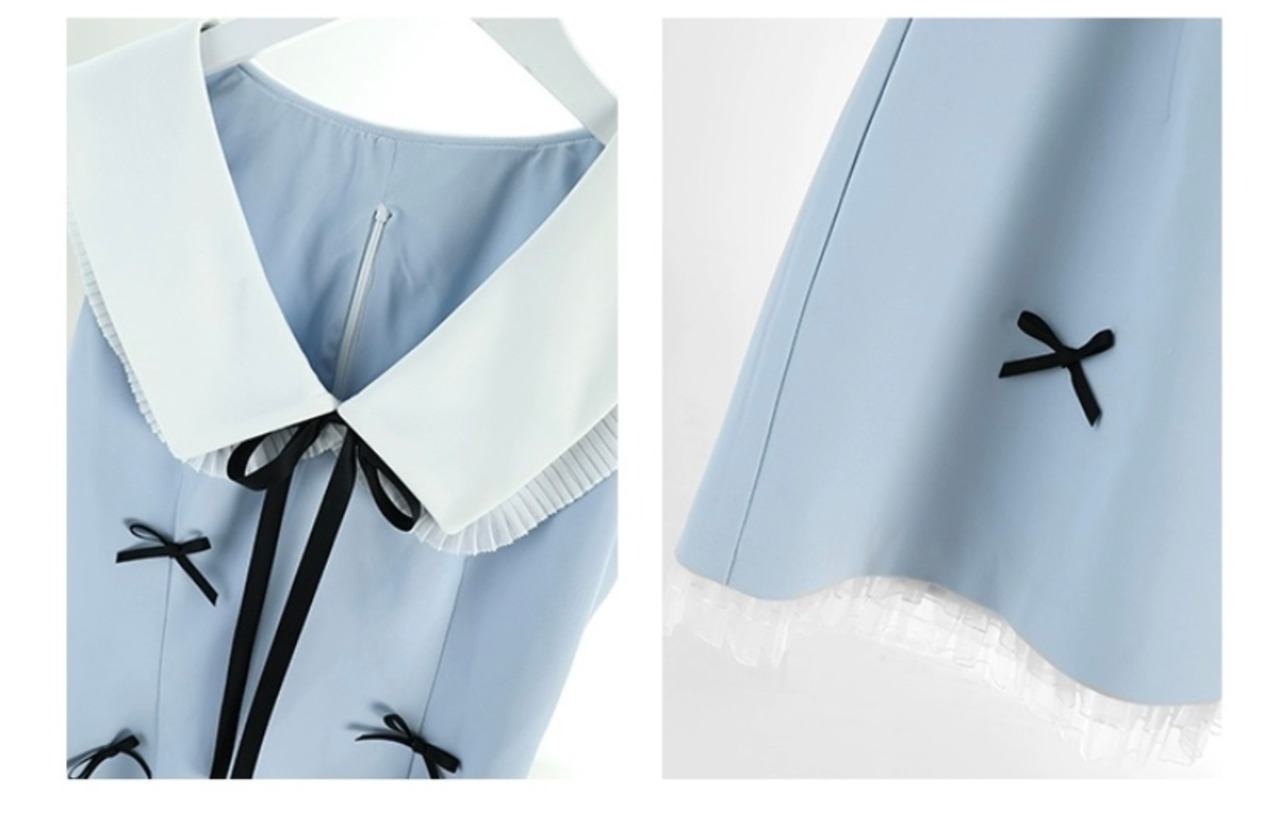 爽やか お嬢様 ワンピース 水色 可愛い リボン ブラウス ガーリー 丸襟
