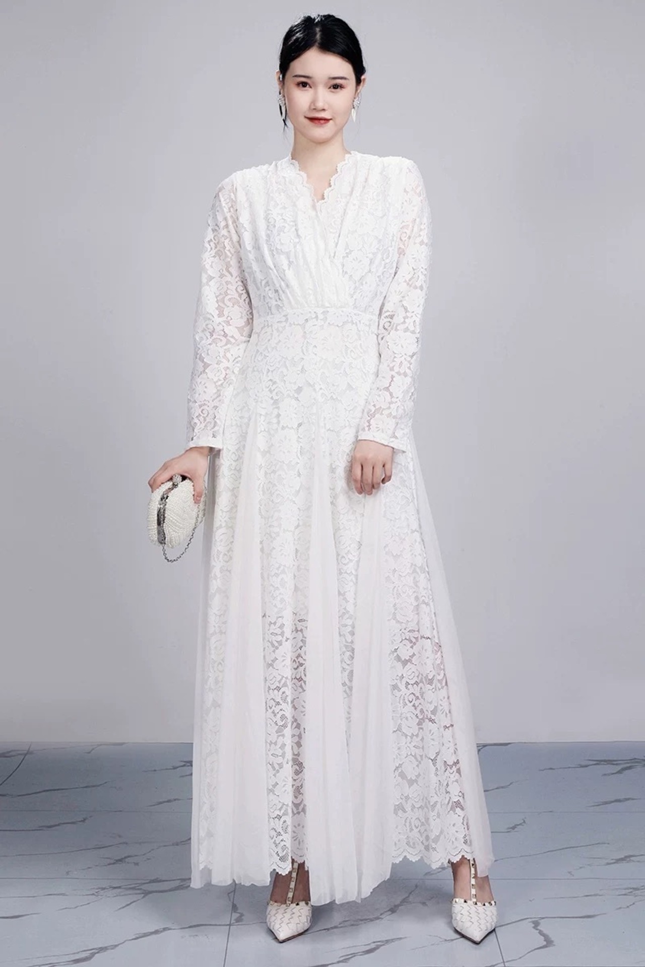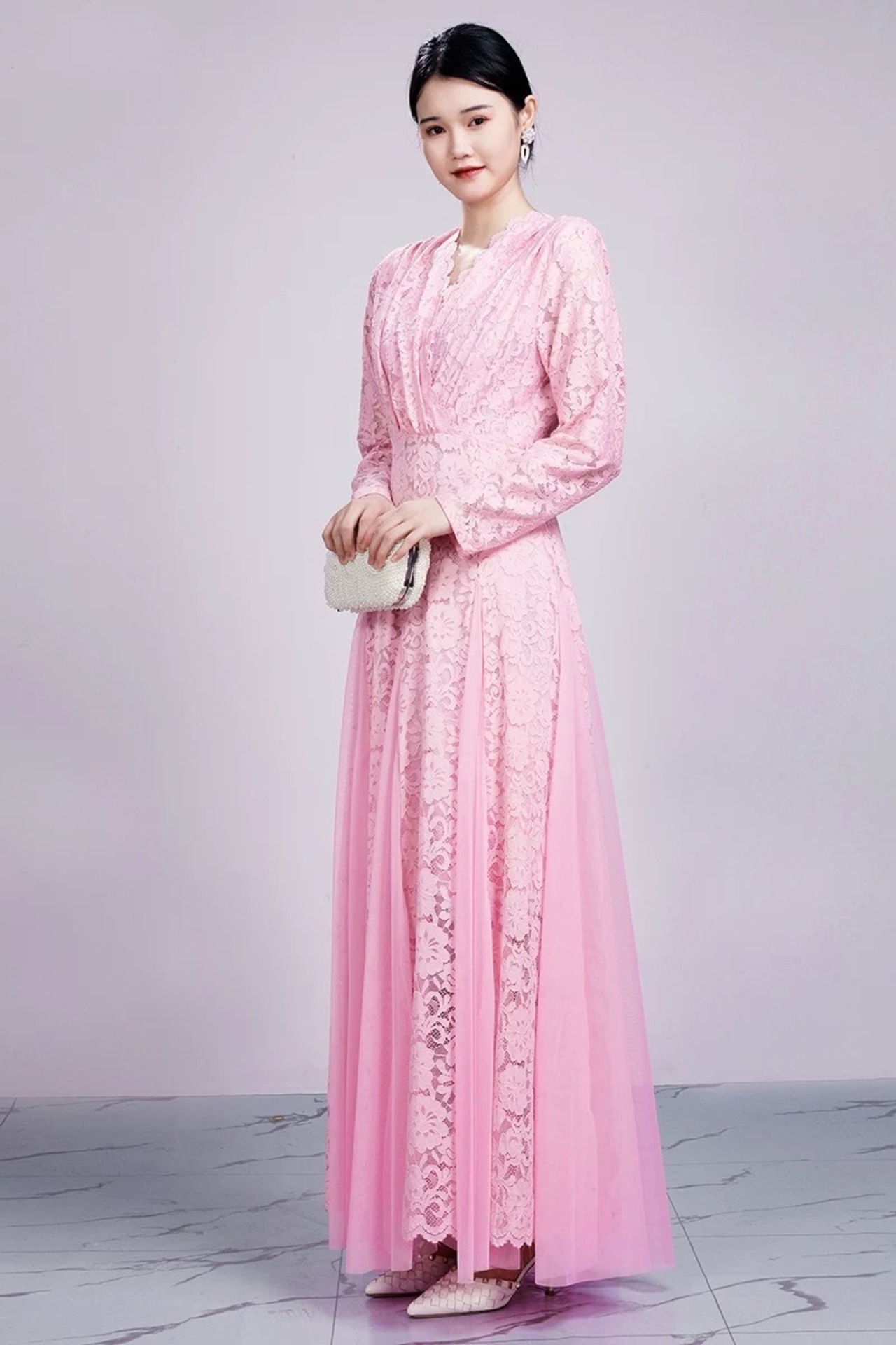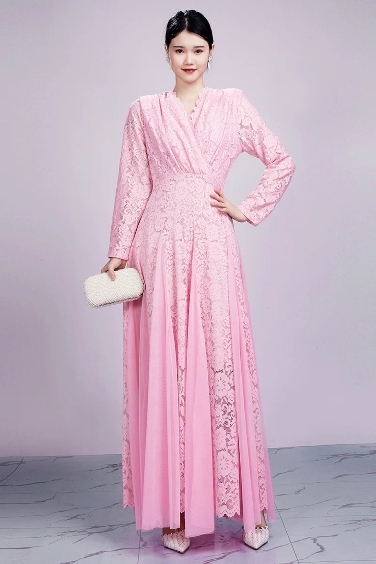 白 ピンク マキシ エレガント ドレス ワンピース ブラウス レース 花柄