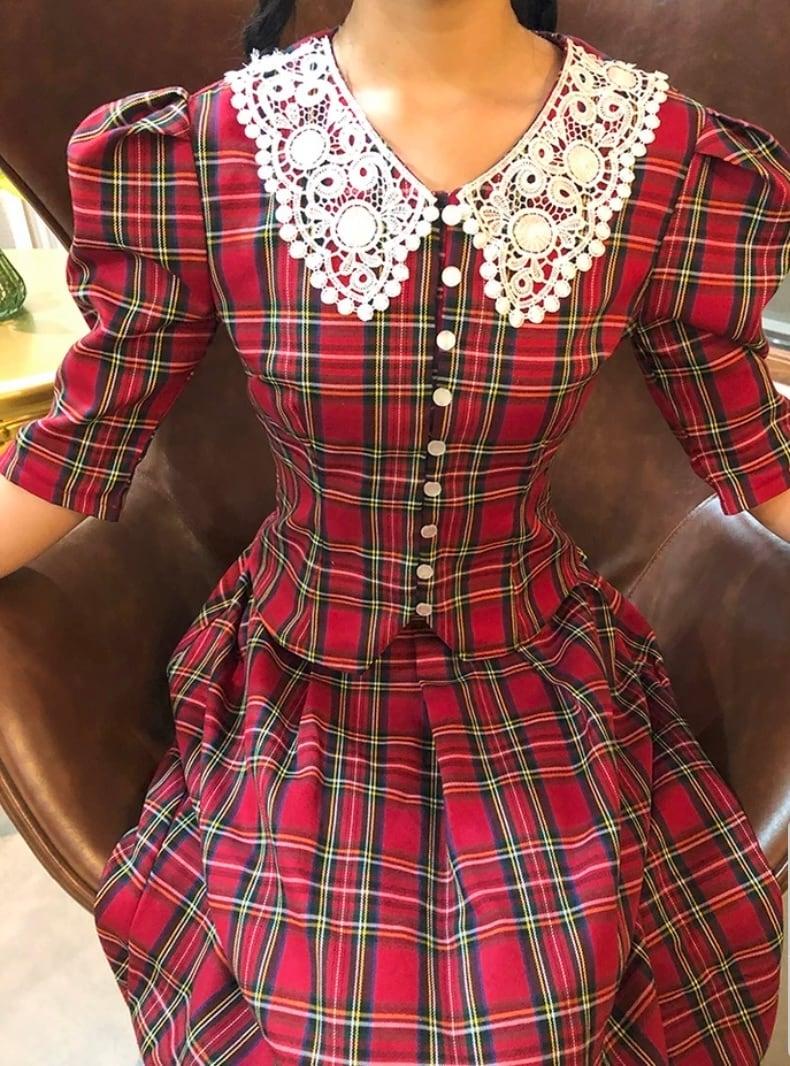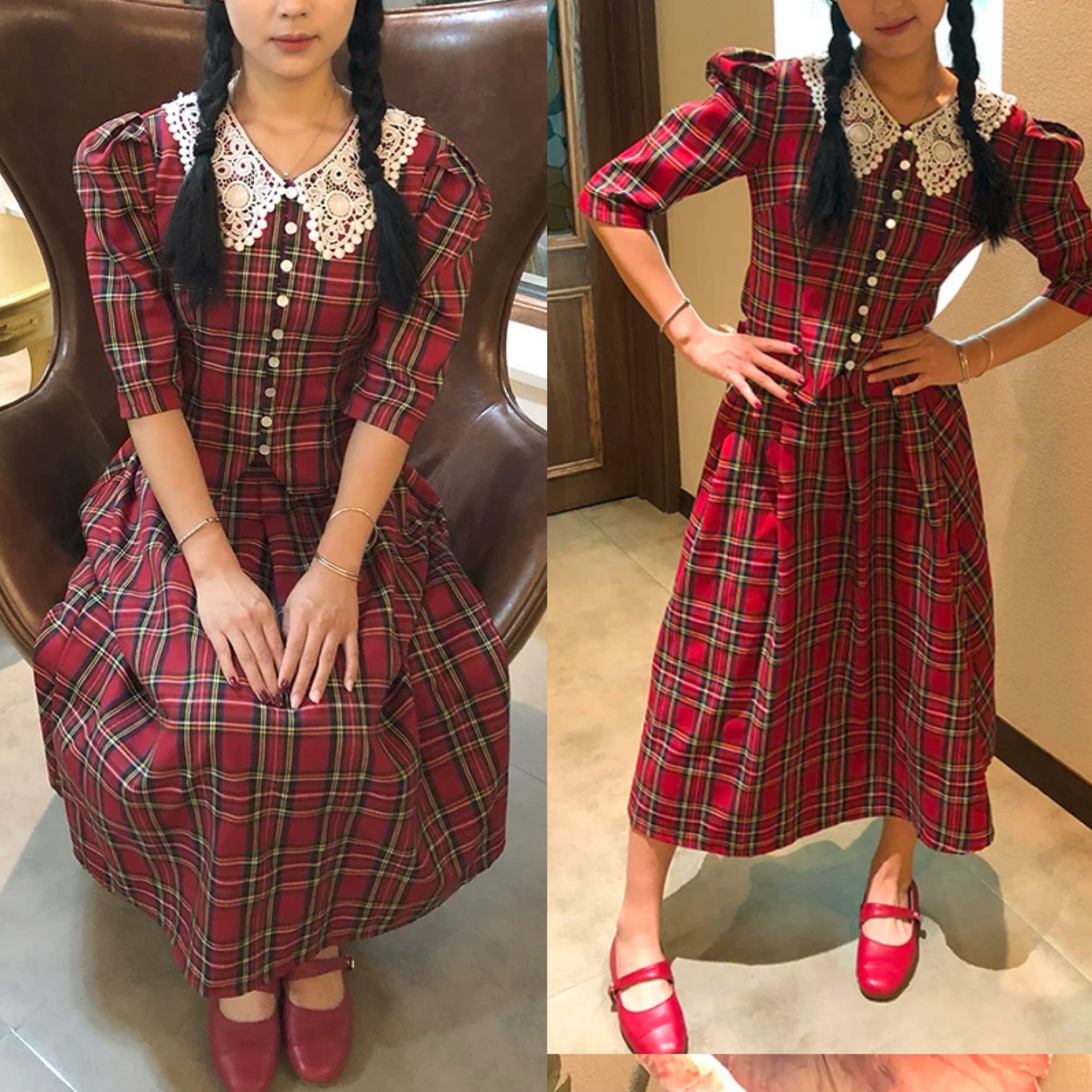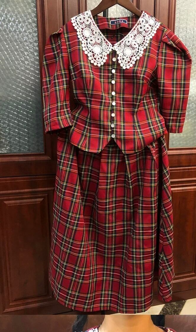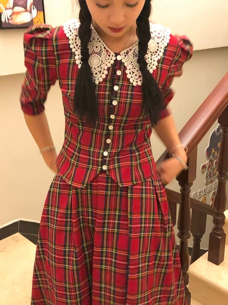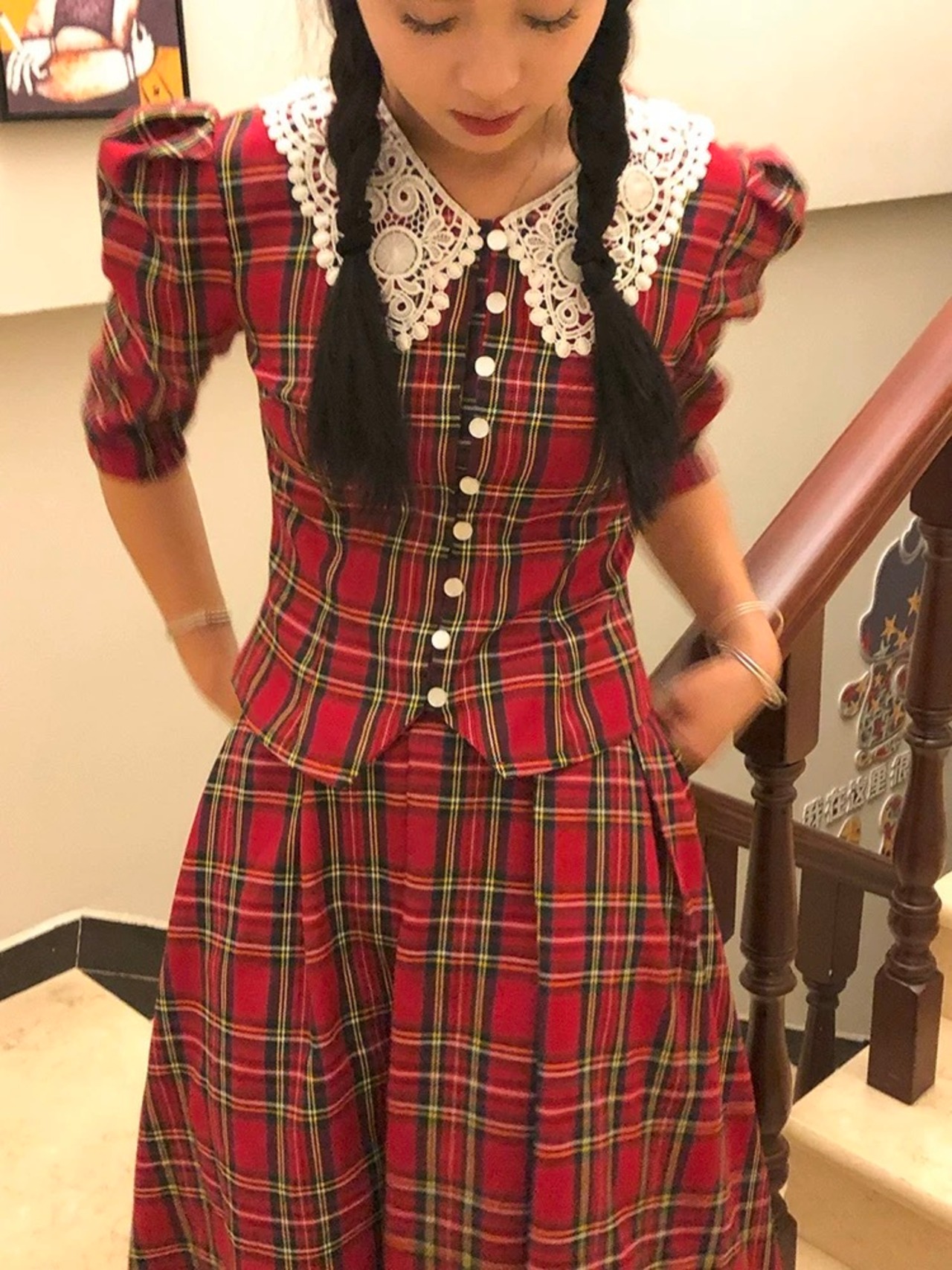 赤 チェック ブラウス スカート レトロ セットアップ スカート ワンピース