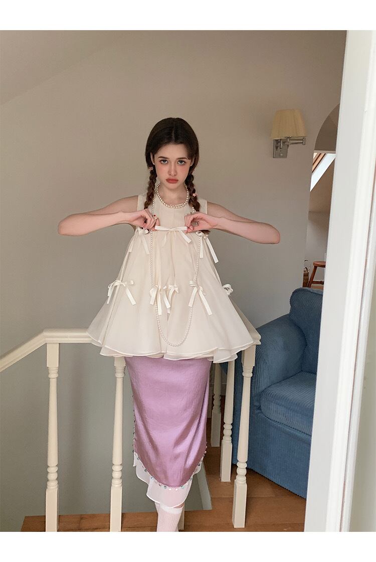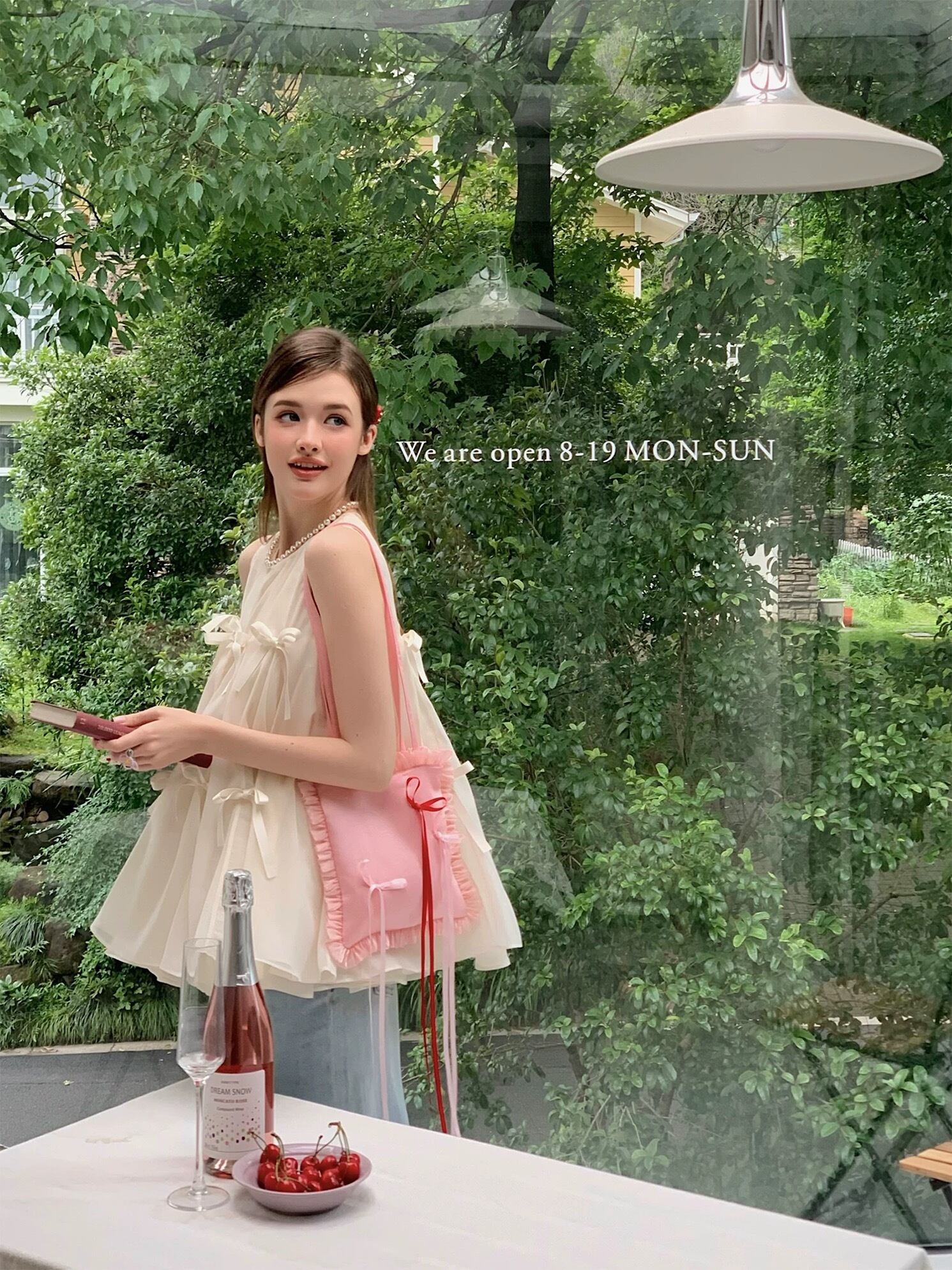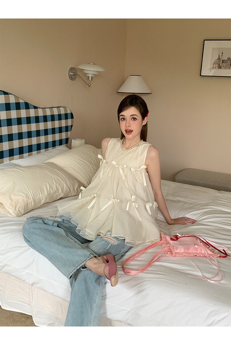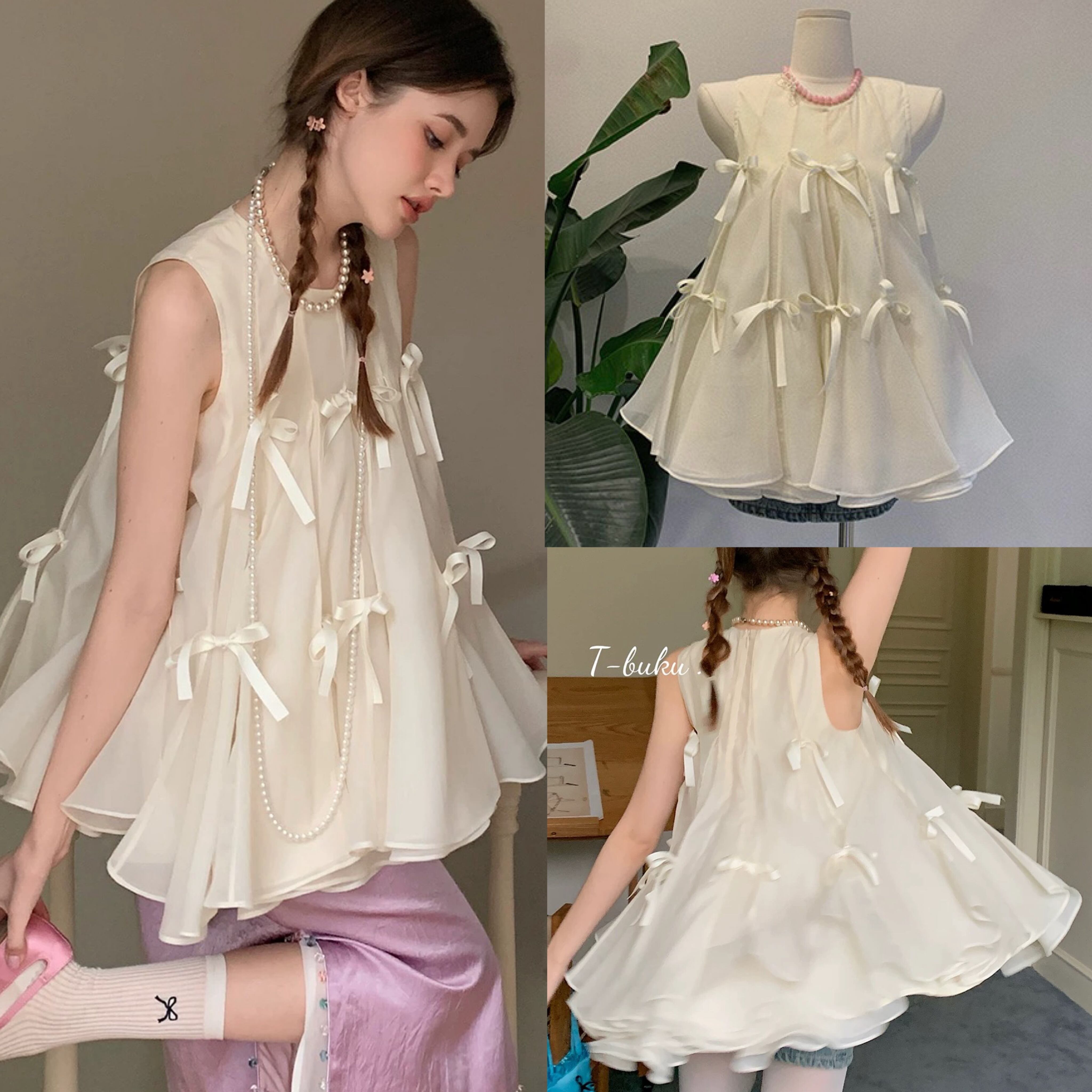 タンクトップ ブラウス リボン チュニック シャツ ガーリー ベージュ 可愛い トップス
