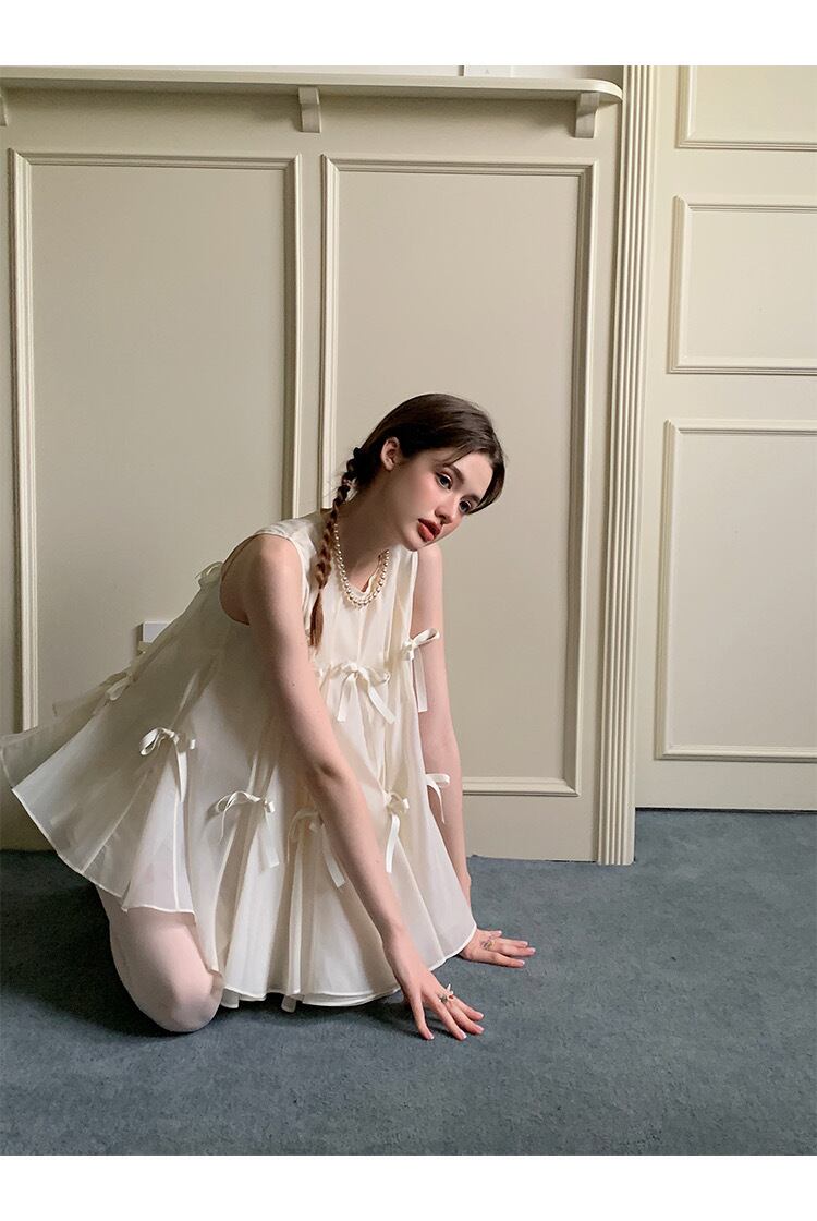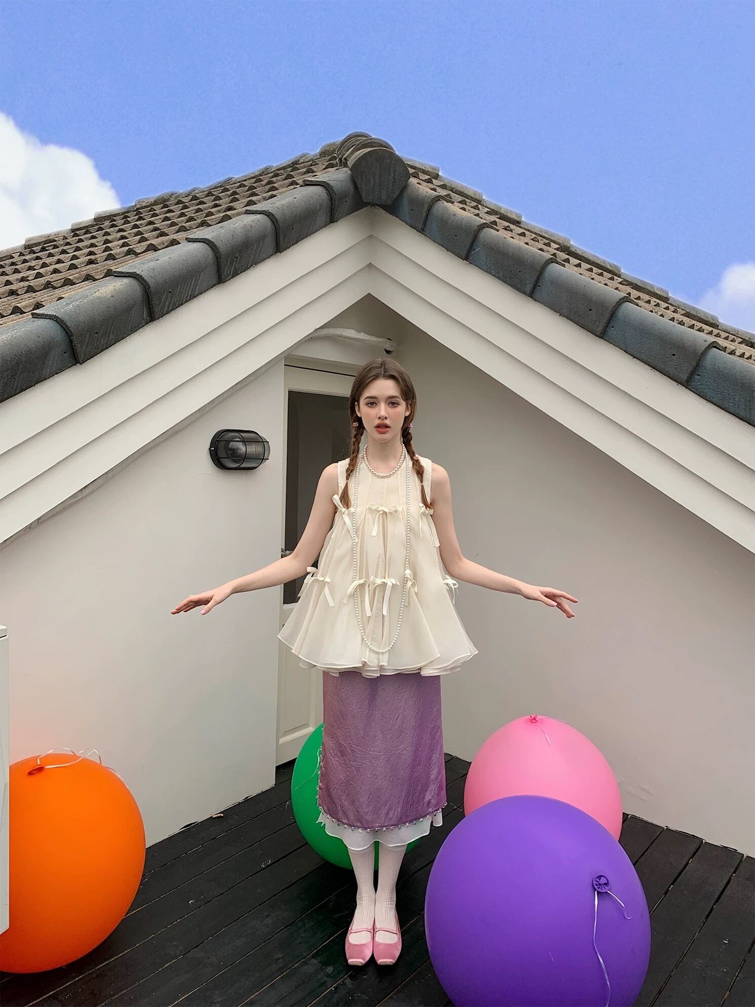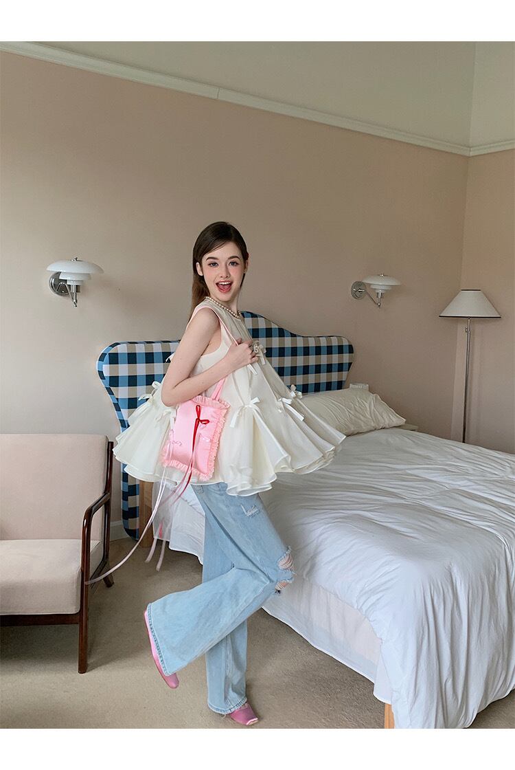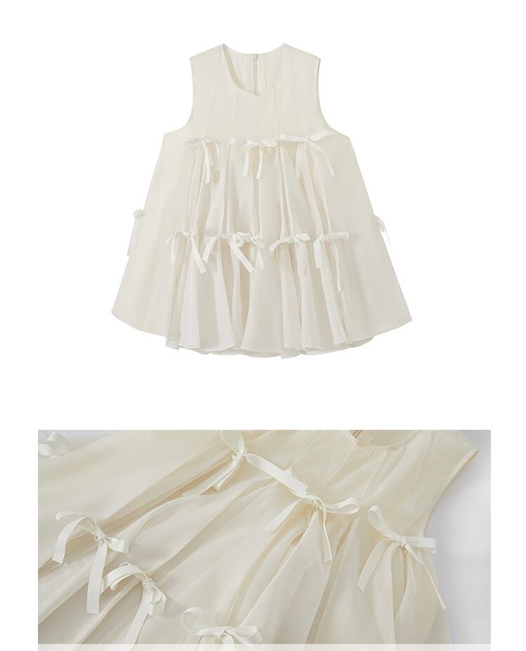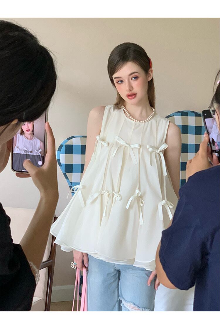 タンクトップ ブラウス リボン チュニック シャツ ガーリー ベージュ 可愛い トップス