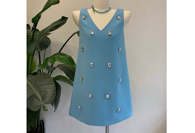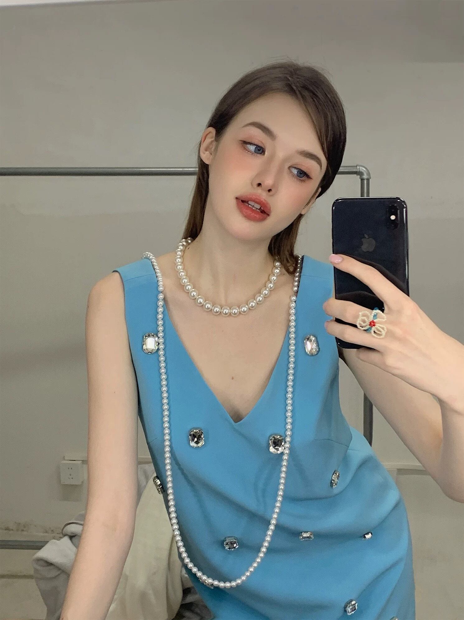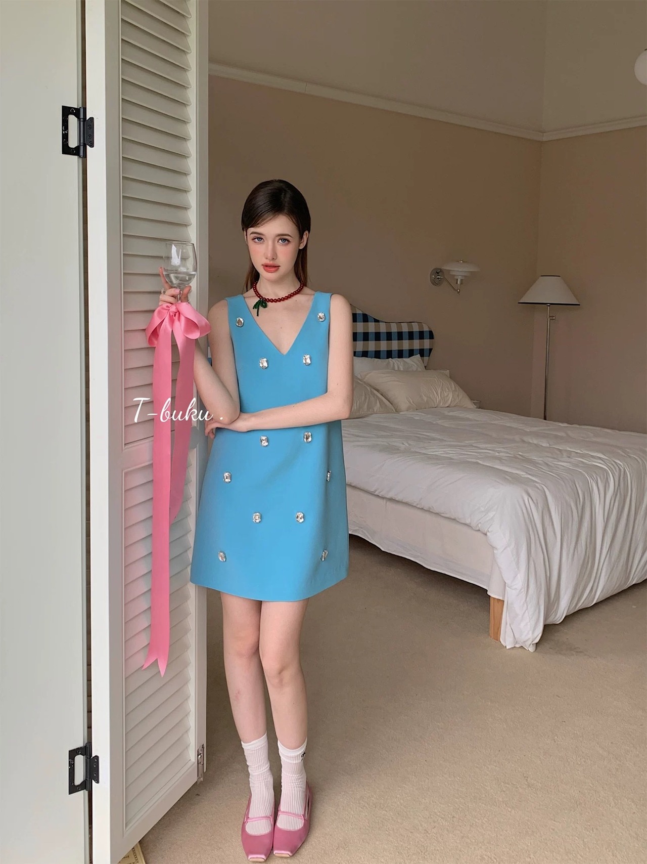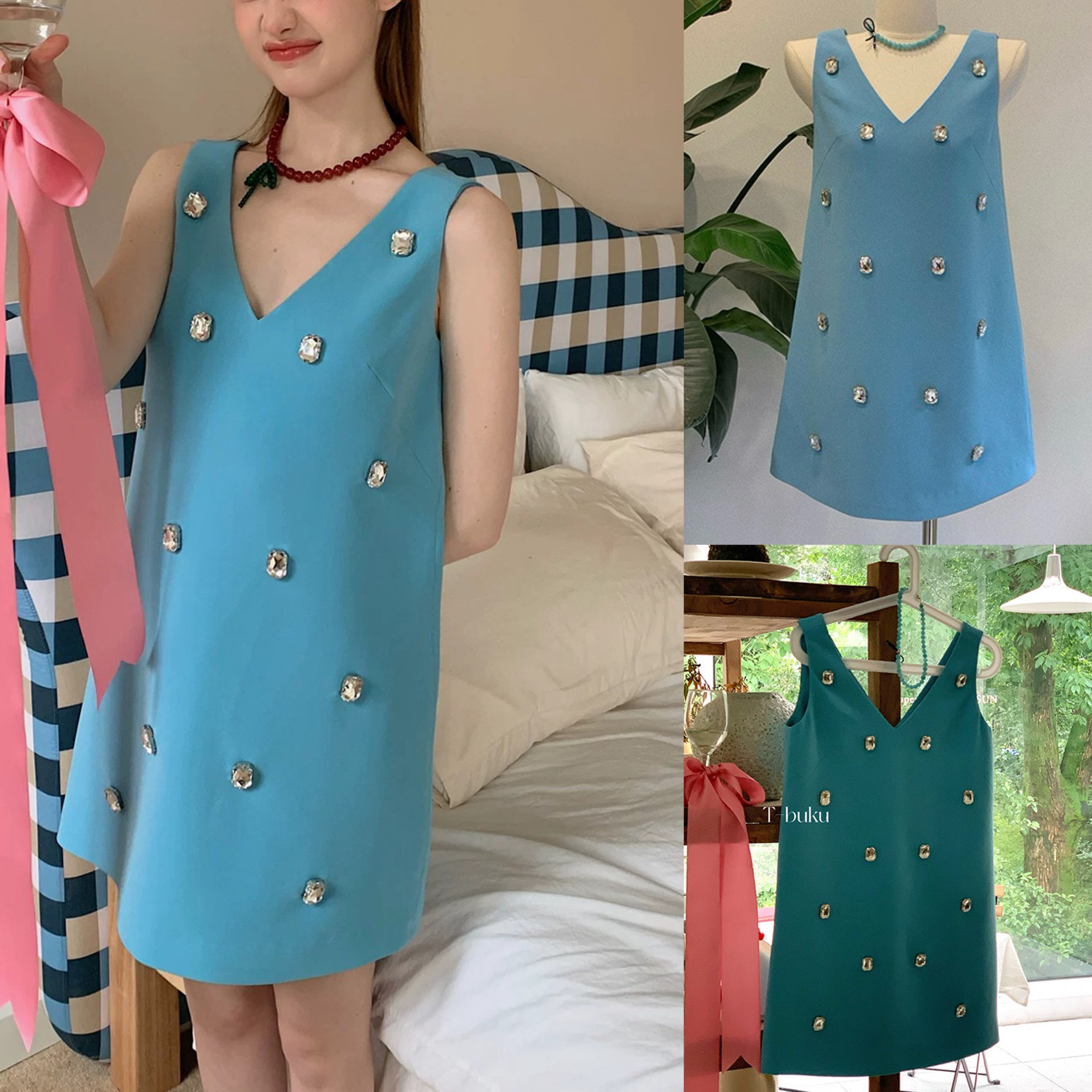水色 ラインストーン ビジュー 爽やか ワンピース ガーリー 可愛い ノースリーブ お嬢様