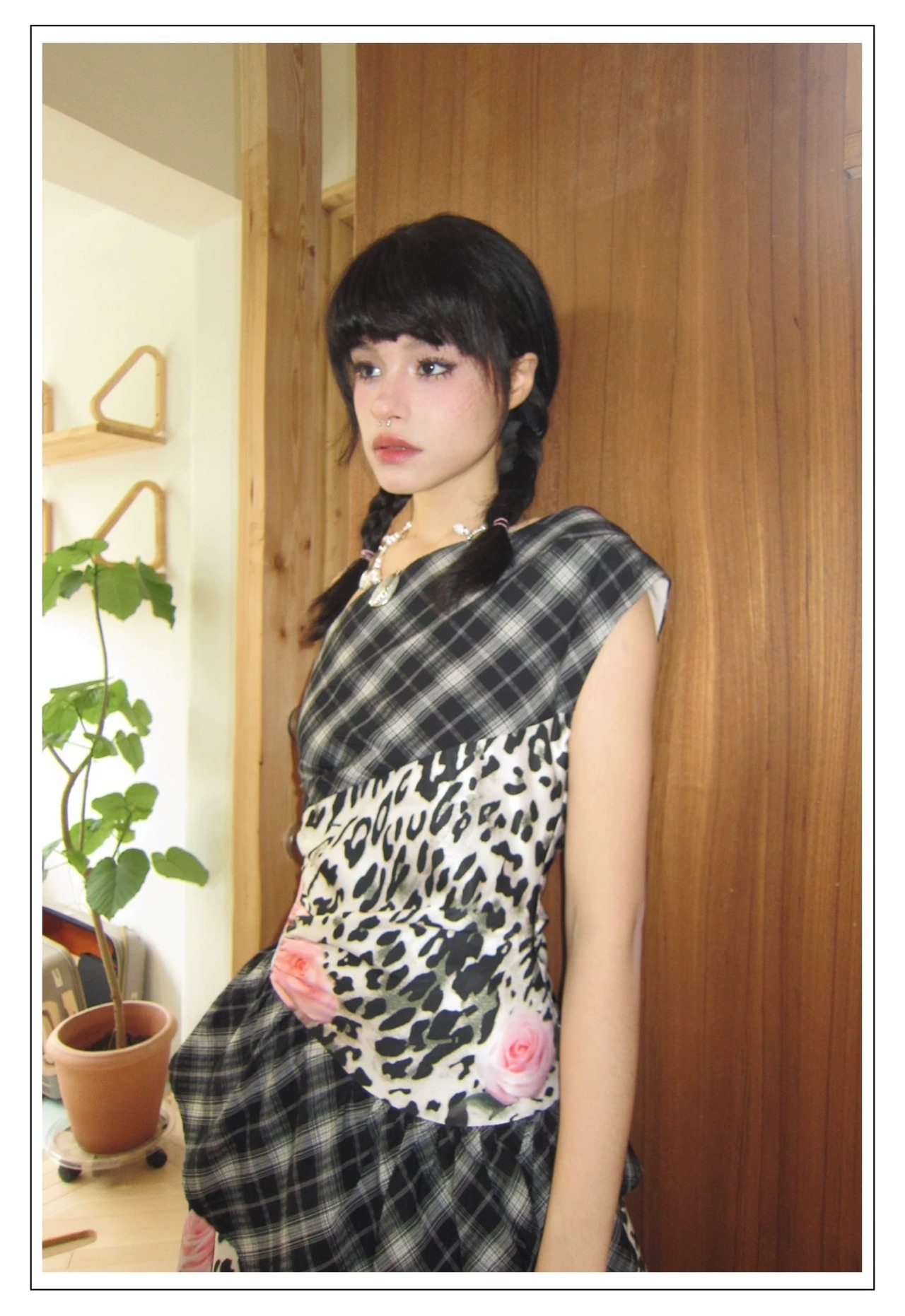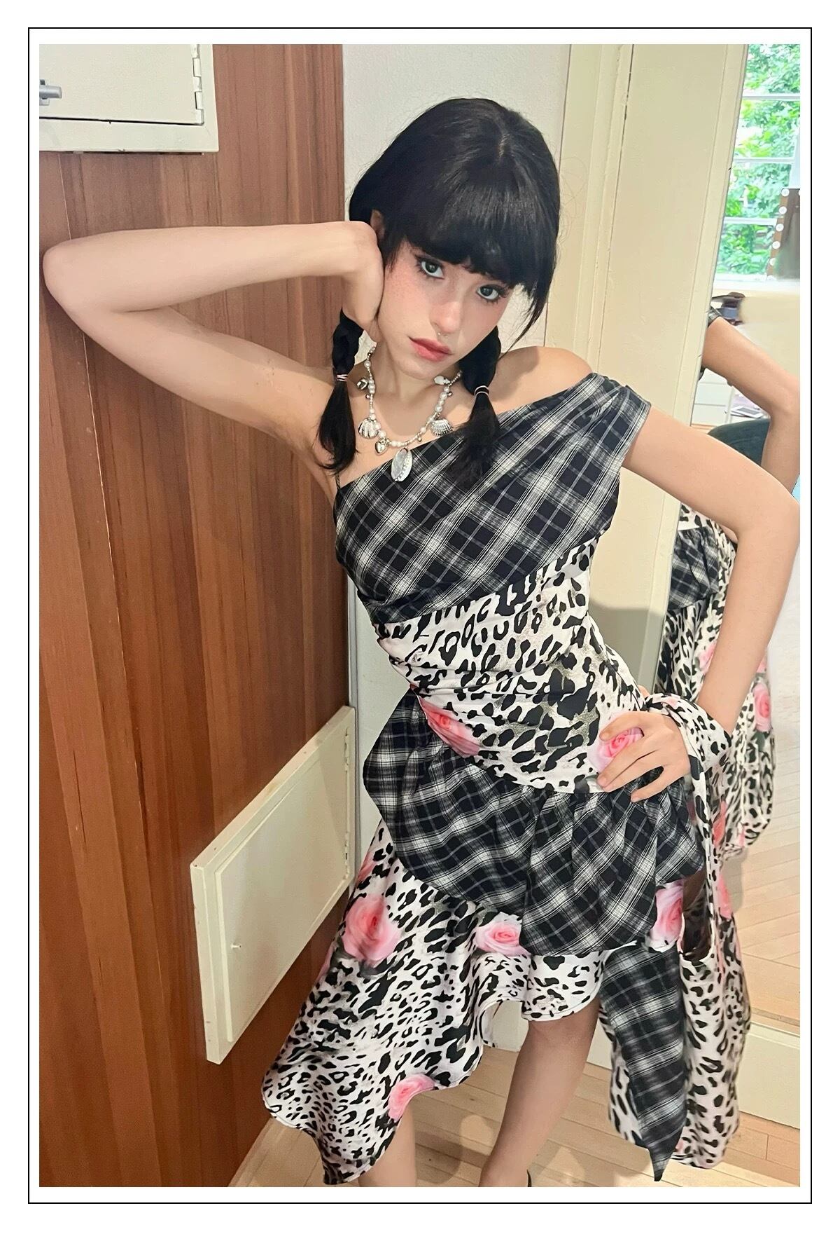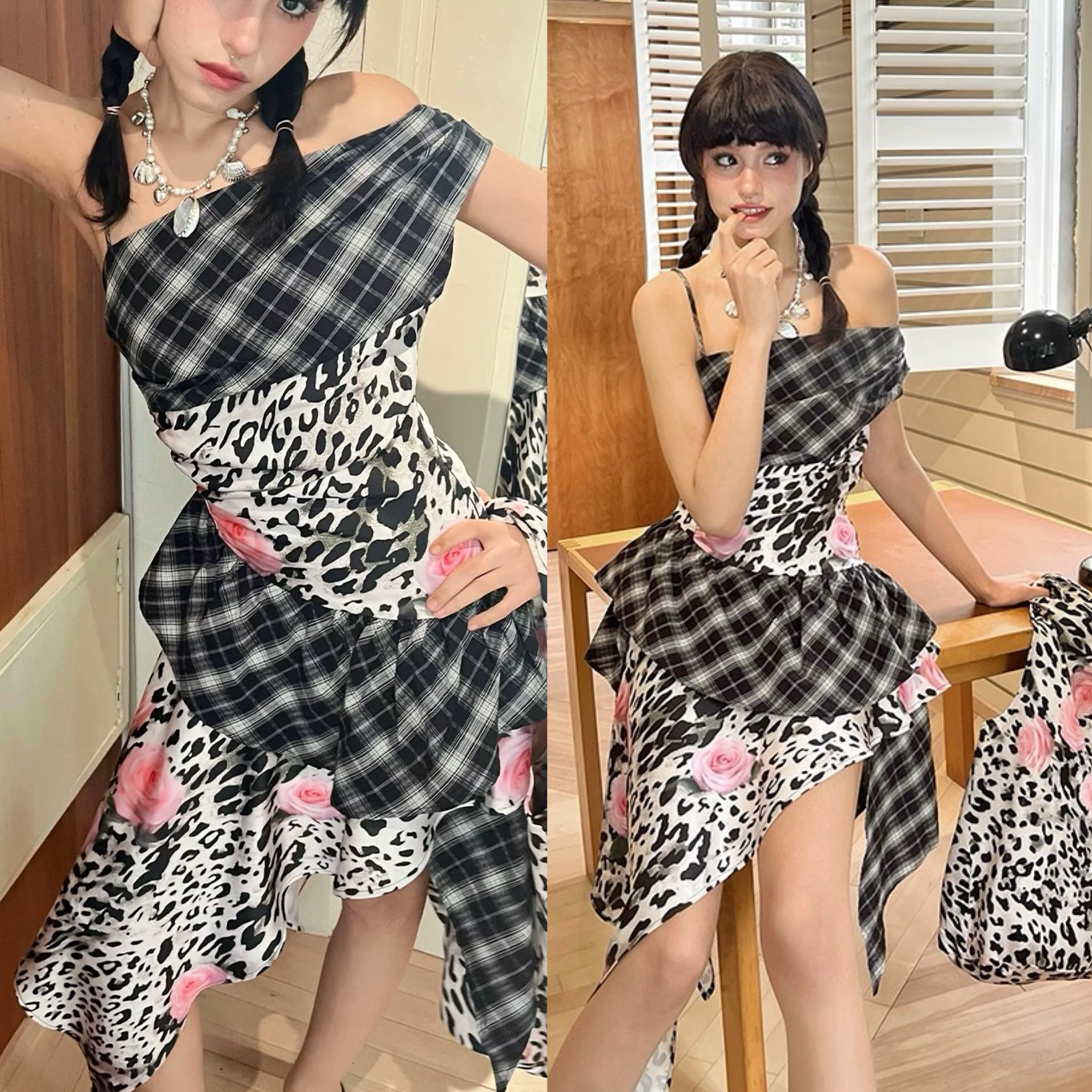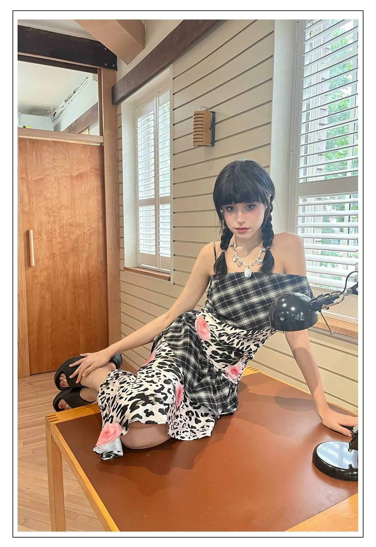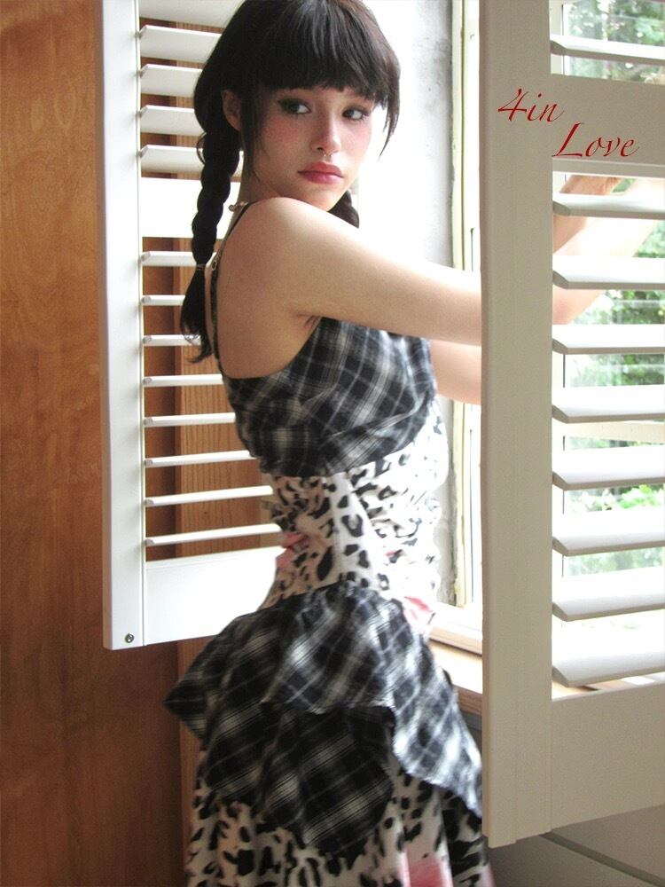 レオパード 豹柄 グレー ヒョウ柄 薔薇 花柄 ベアトップ キャミソール ワンピース チェック ドレス ガーリー 原宿