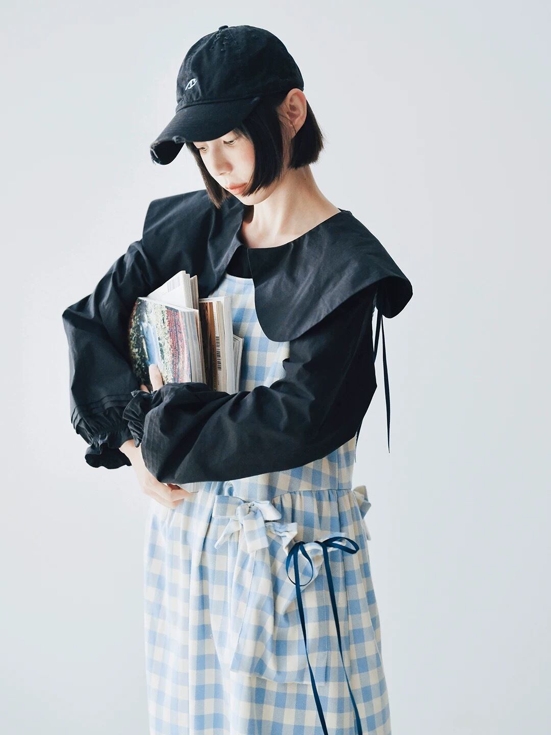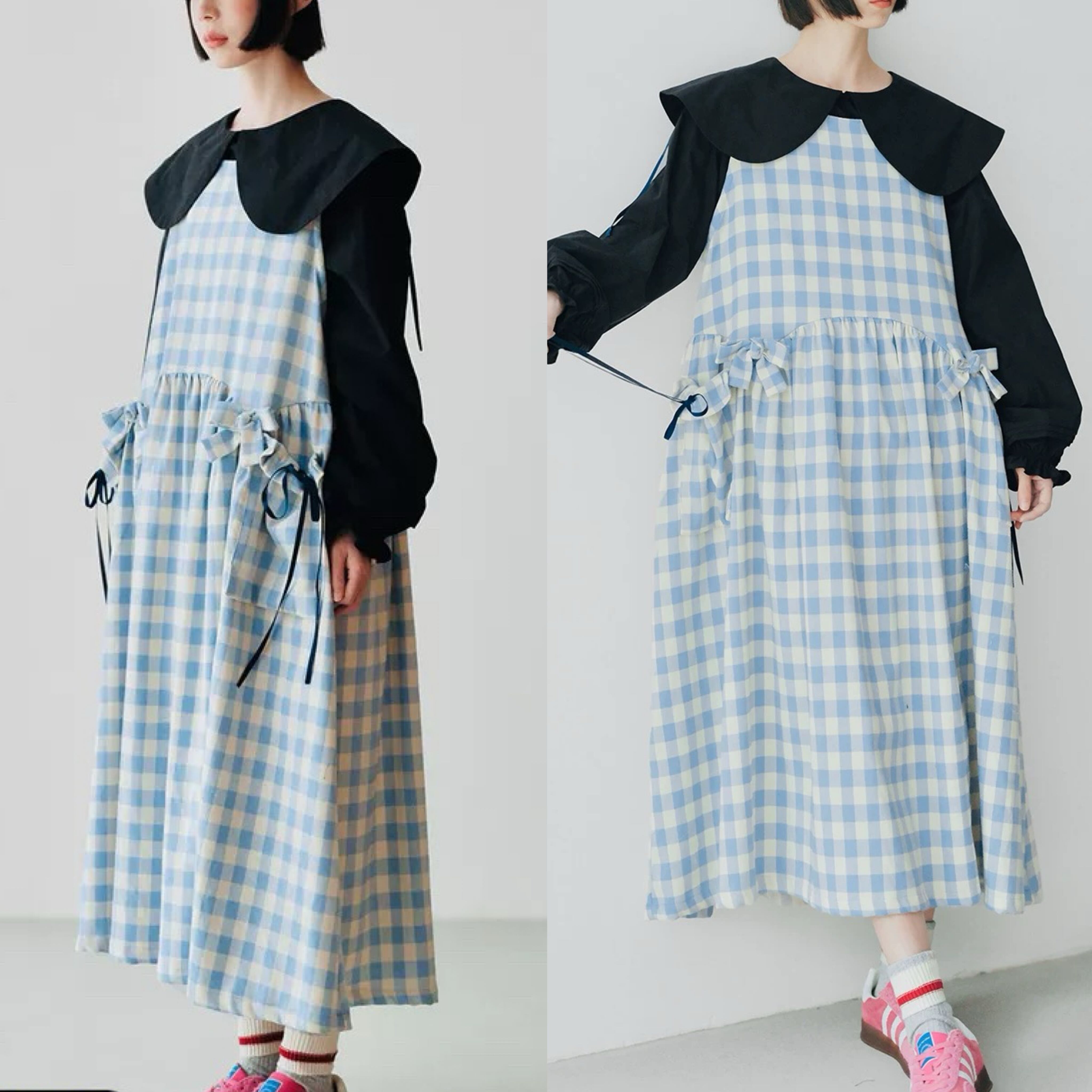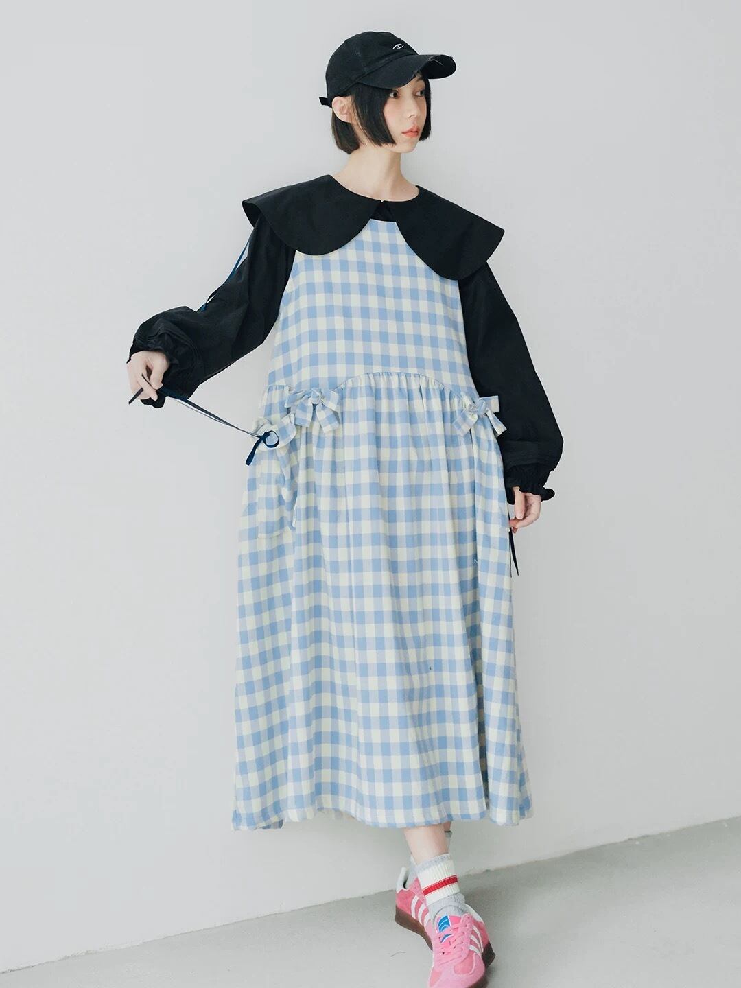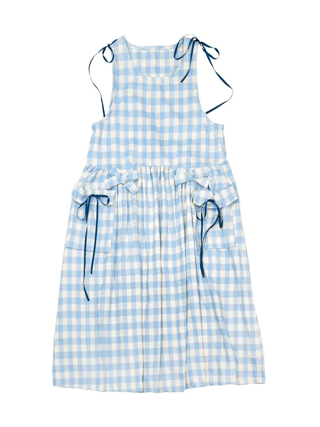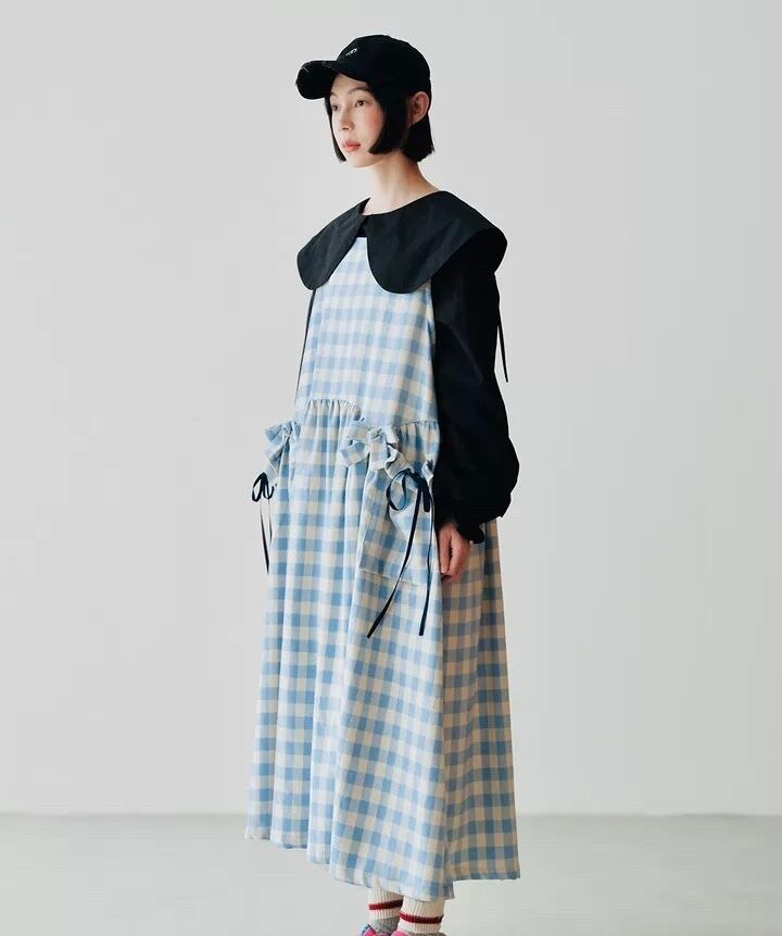 水色 チェック ゆったり リボン ガーリー ワンピース 可愛い