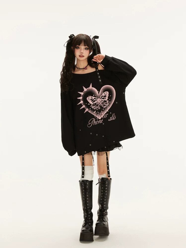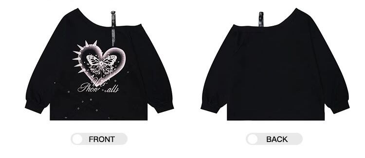 オフショルダー 黒 トレーナー ガーリー ハート スウェット 原宿 カジュアル ドップス