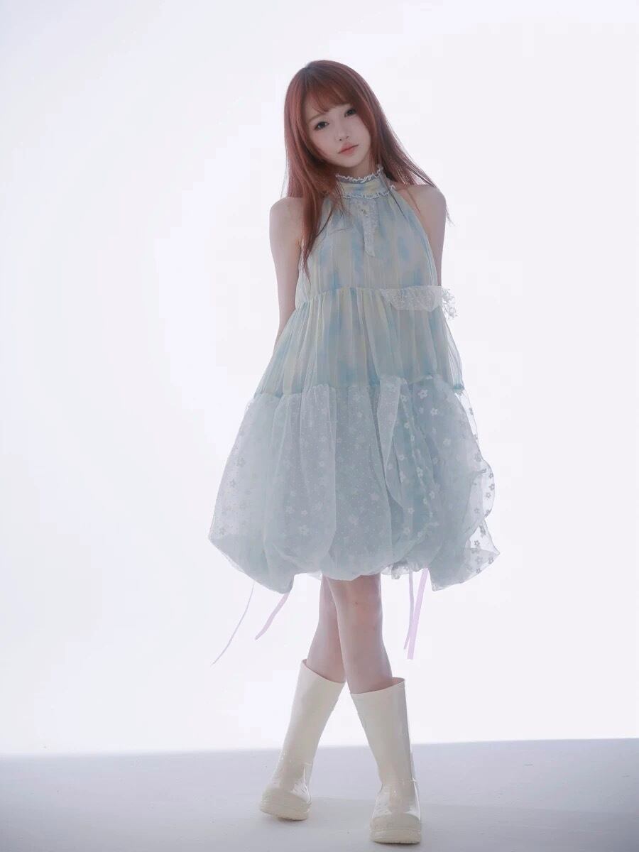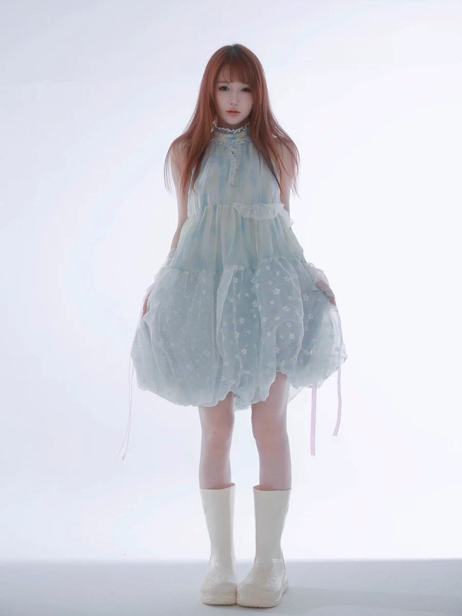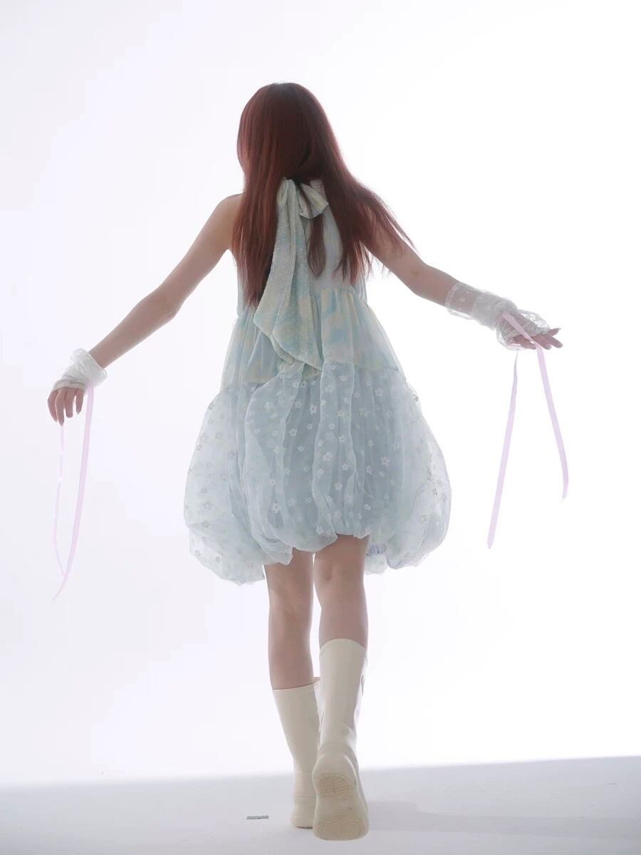 水色 花柄 フラワー ワンピース リボン ホルターネック 可愛い ドレス バルーン