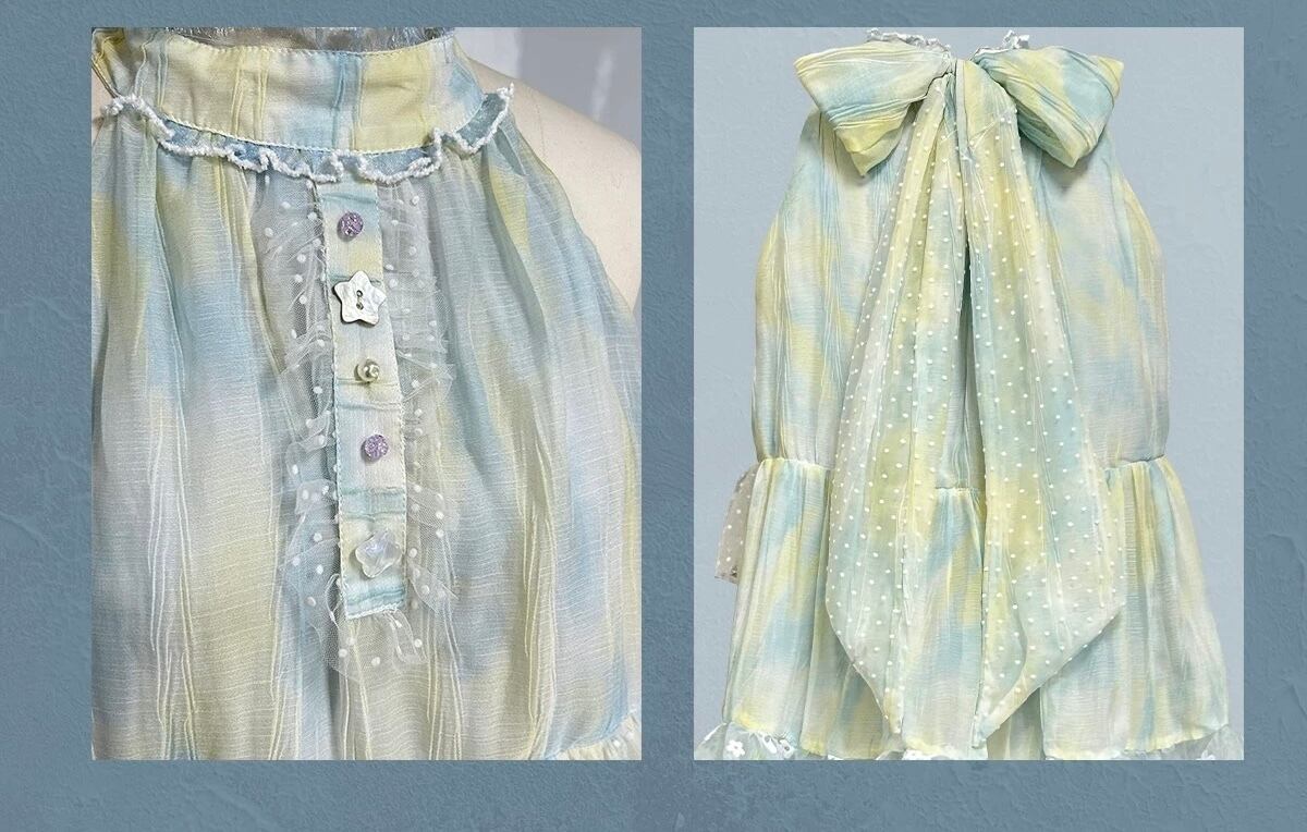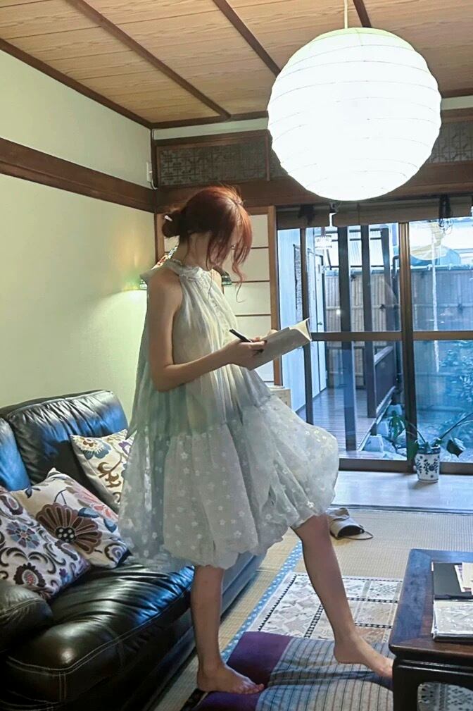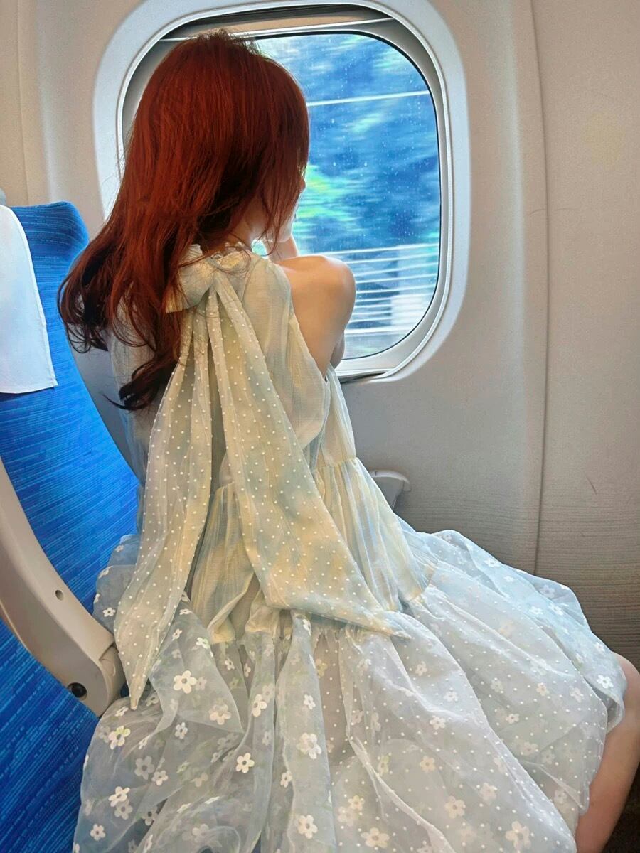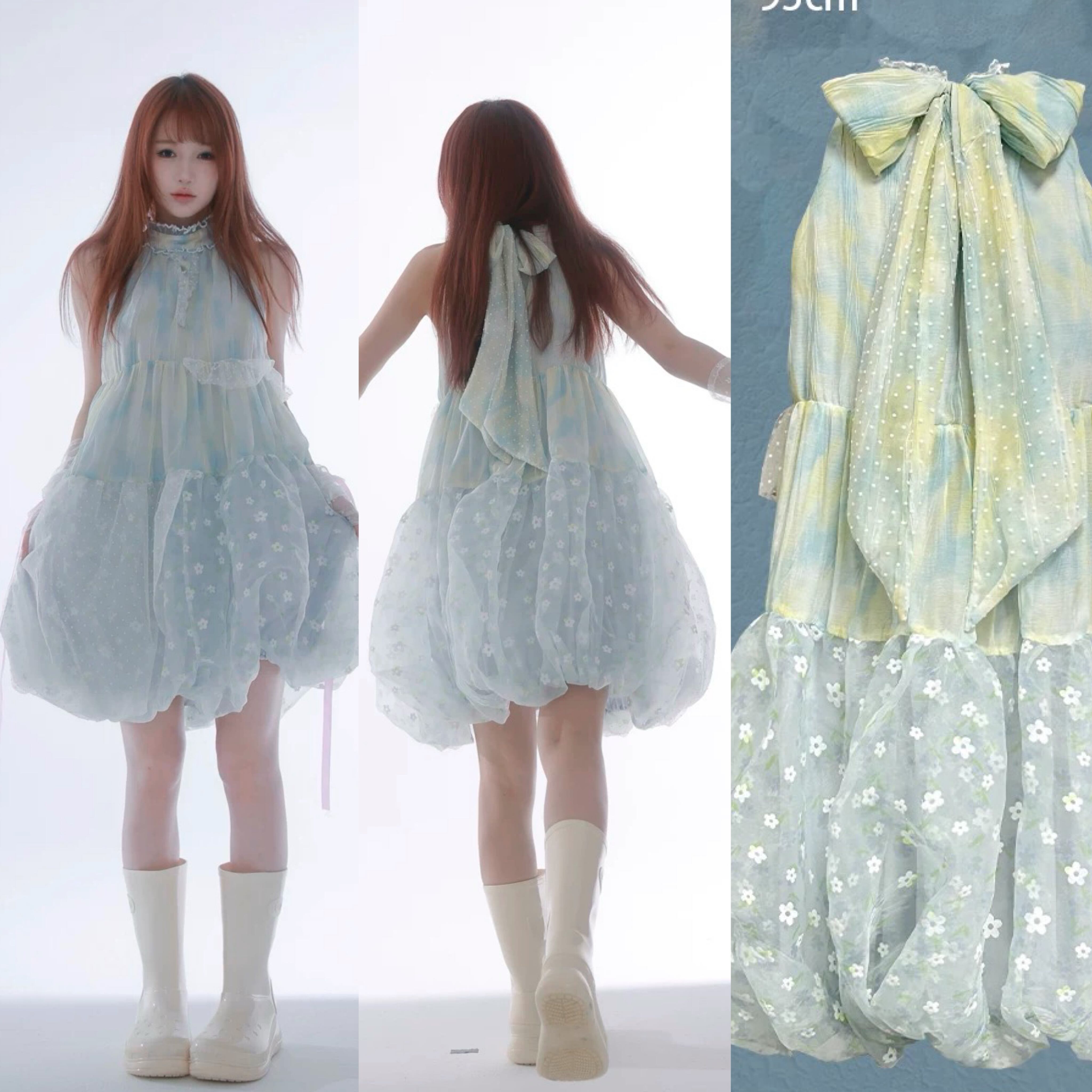 水色 花柄 フラワー ワンピース リボン ホルターネック 可愛い ドレス バルーン