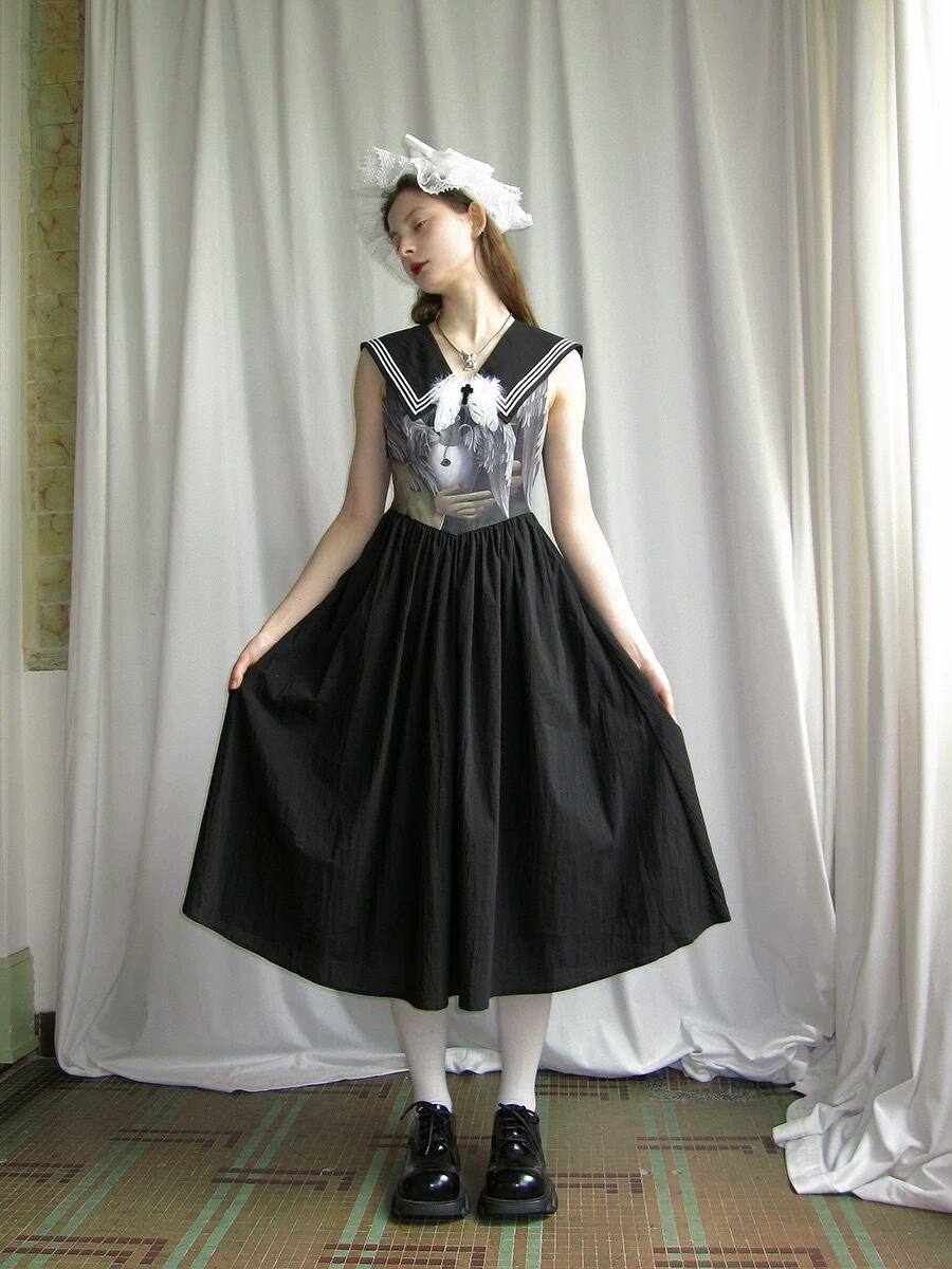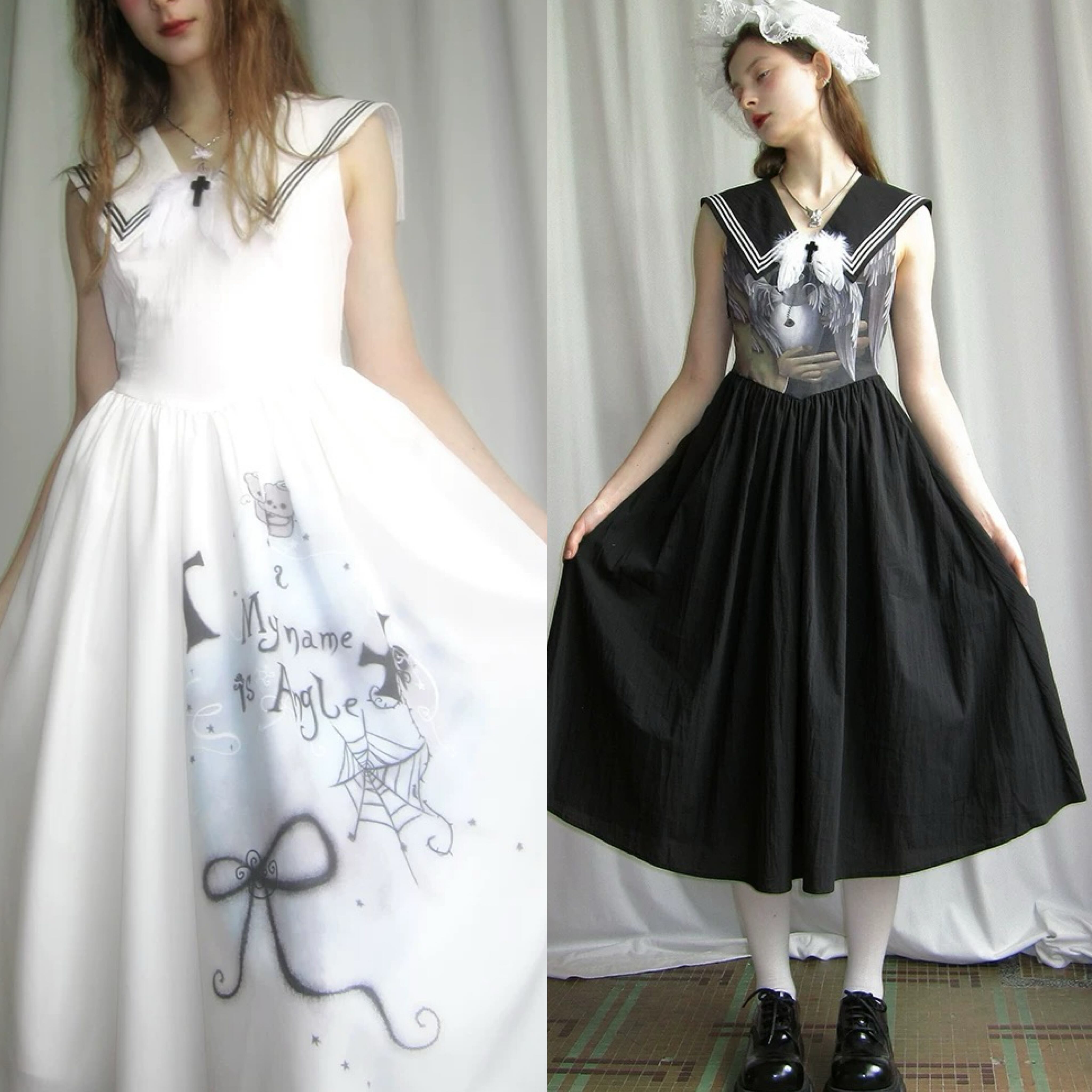 黒 白 セーラー ワンピース 可愛い ガーリー 原宿 襟 熊 スクール
