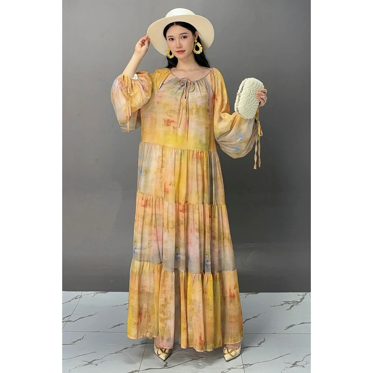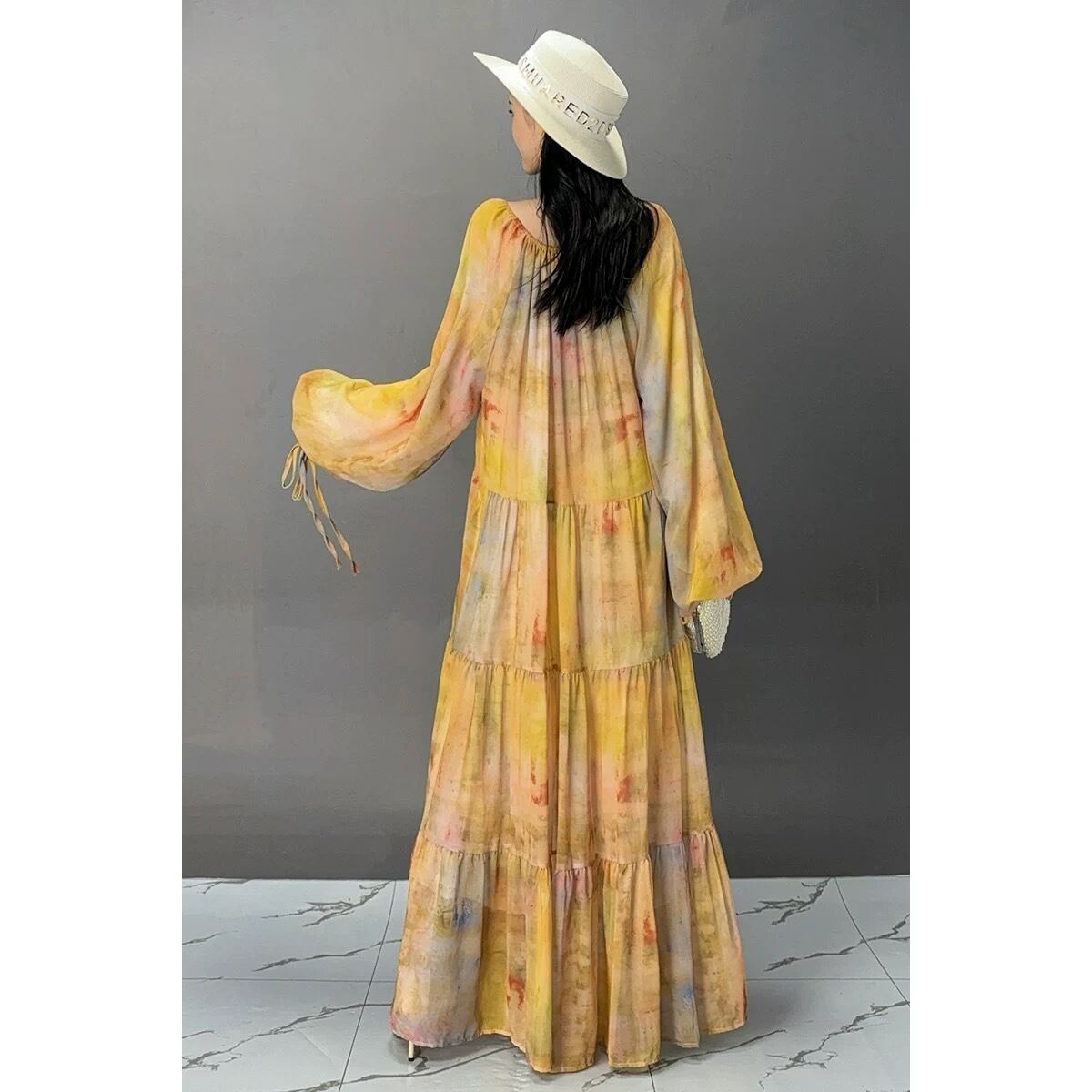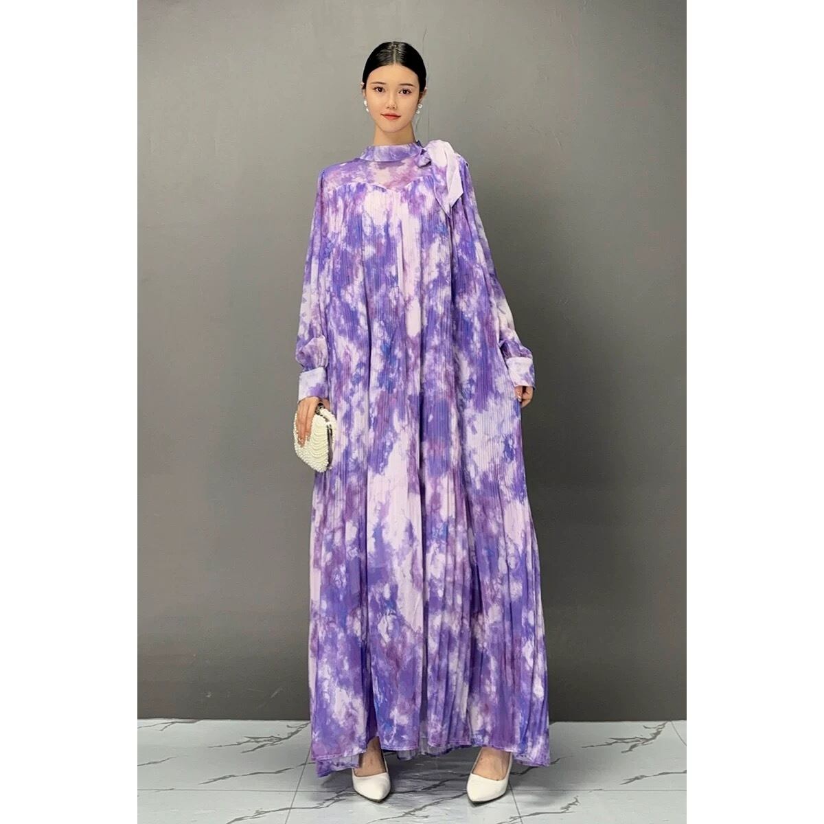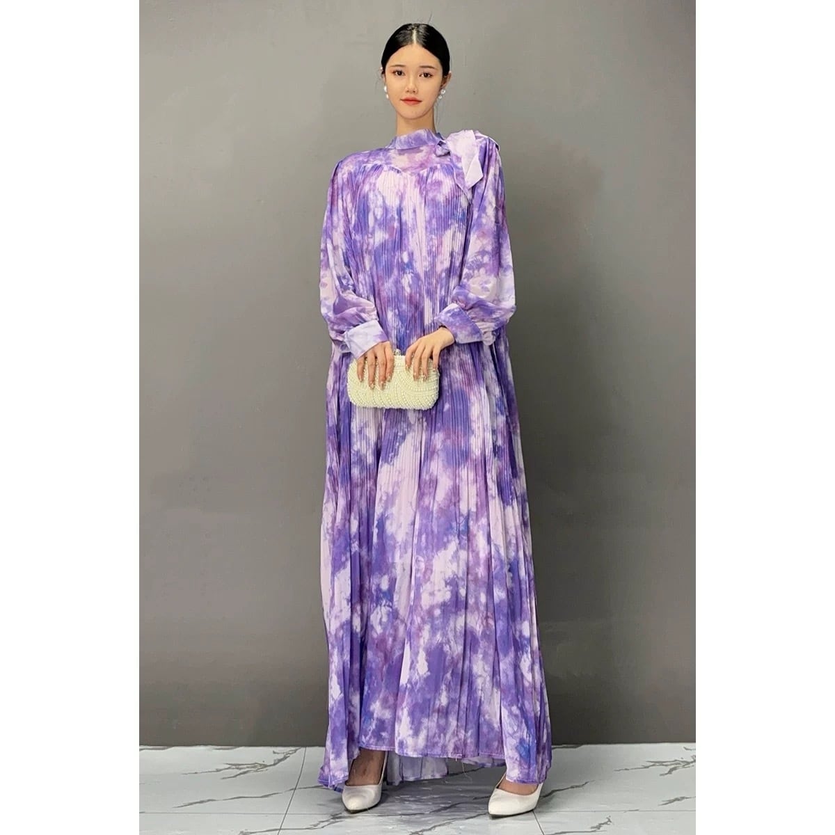 紫 黄色 水色 アジアン 花柄 マキシ ゆったり ブラウス ワンピース XL