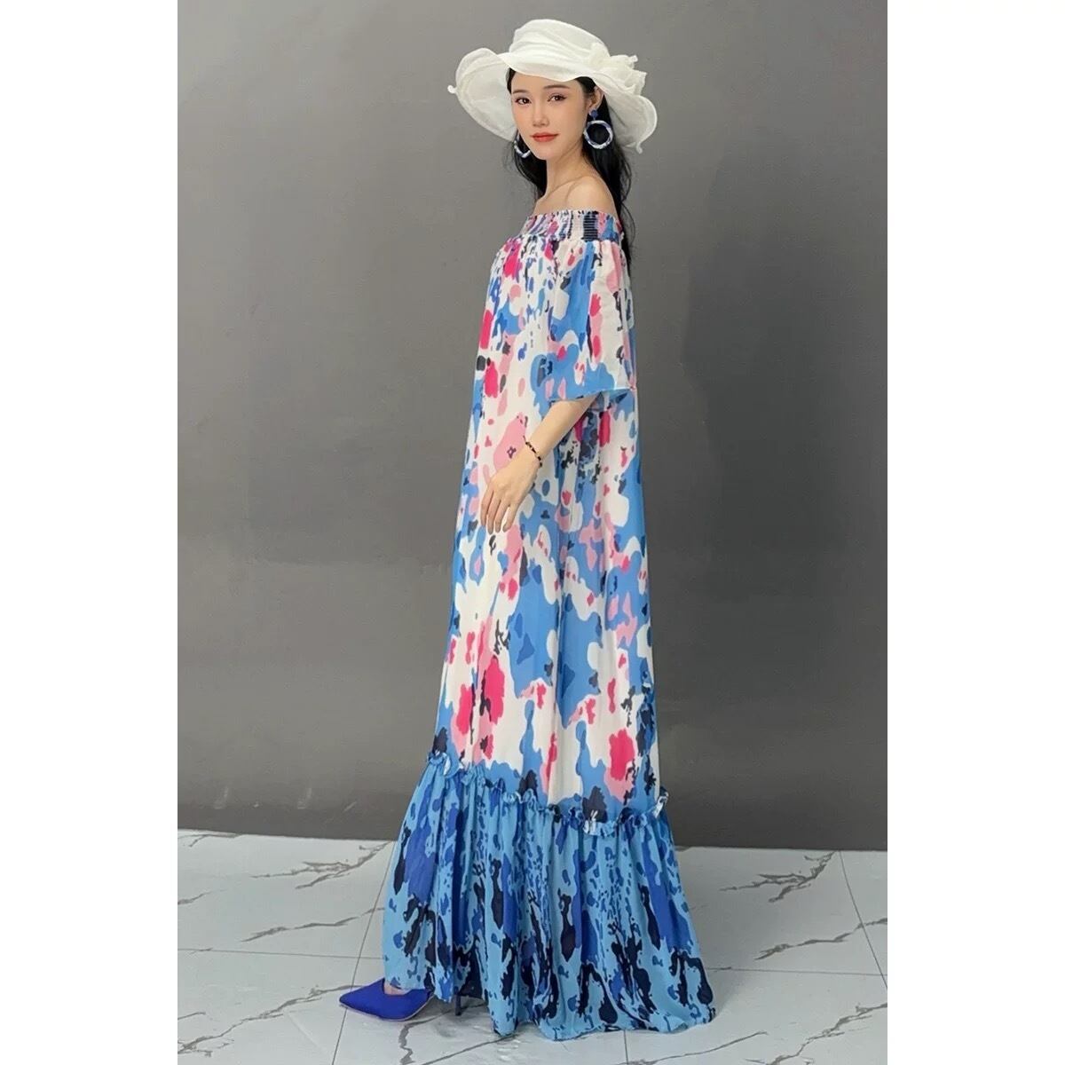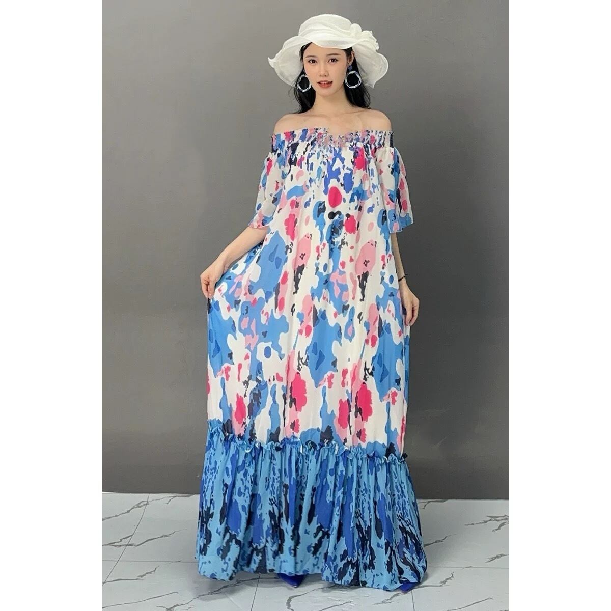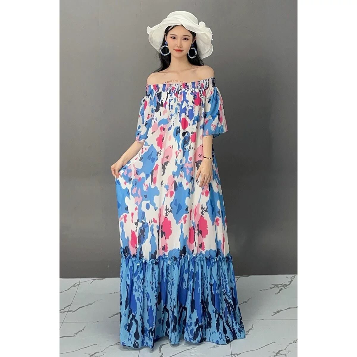 ピンク 水色 エスニック 可愛い エレガント オフショルダー ワンピース XL