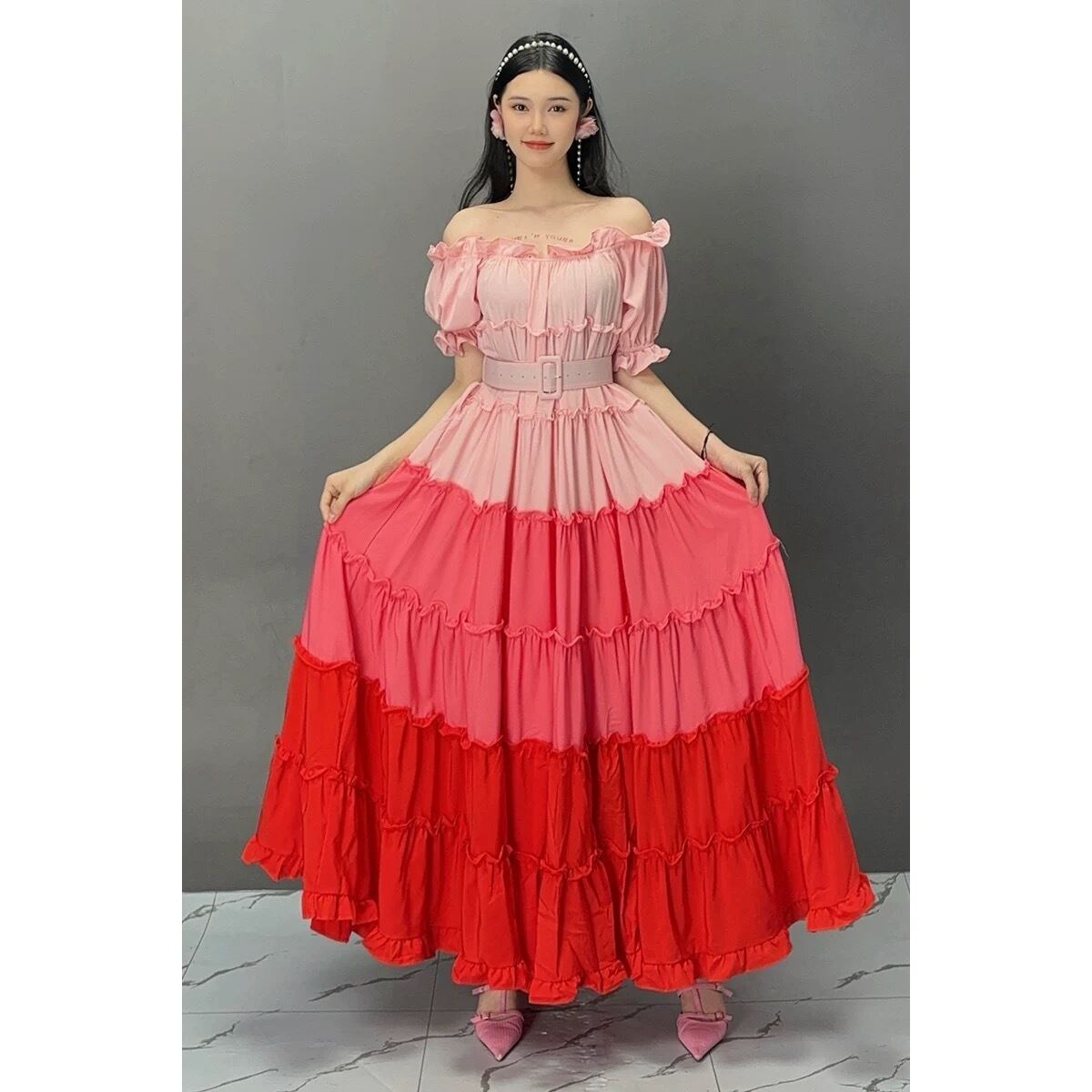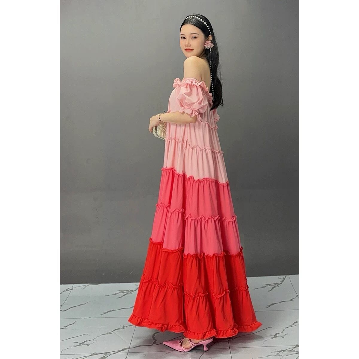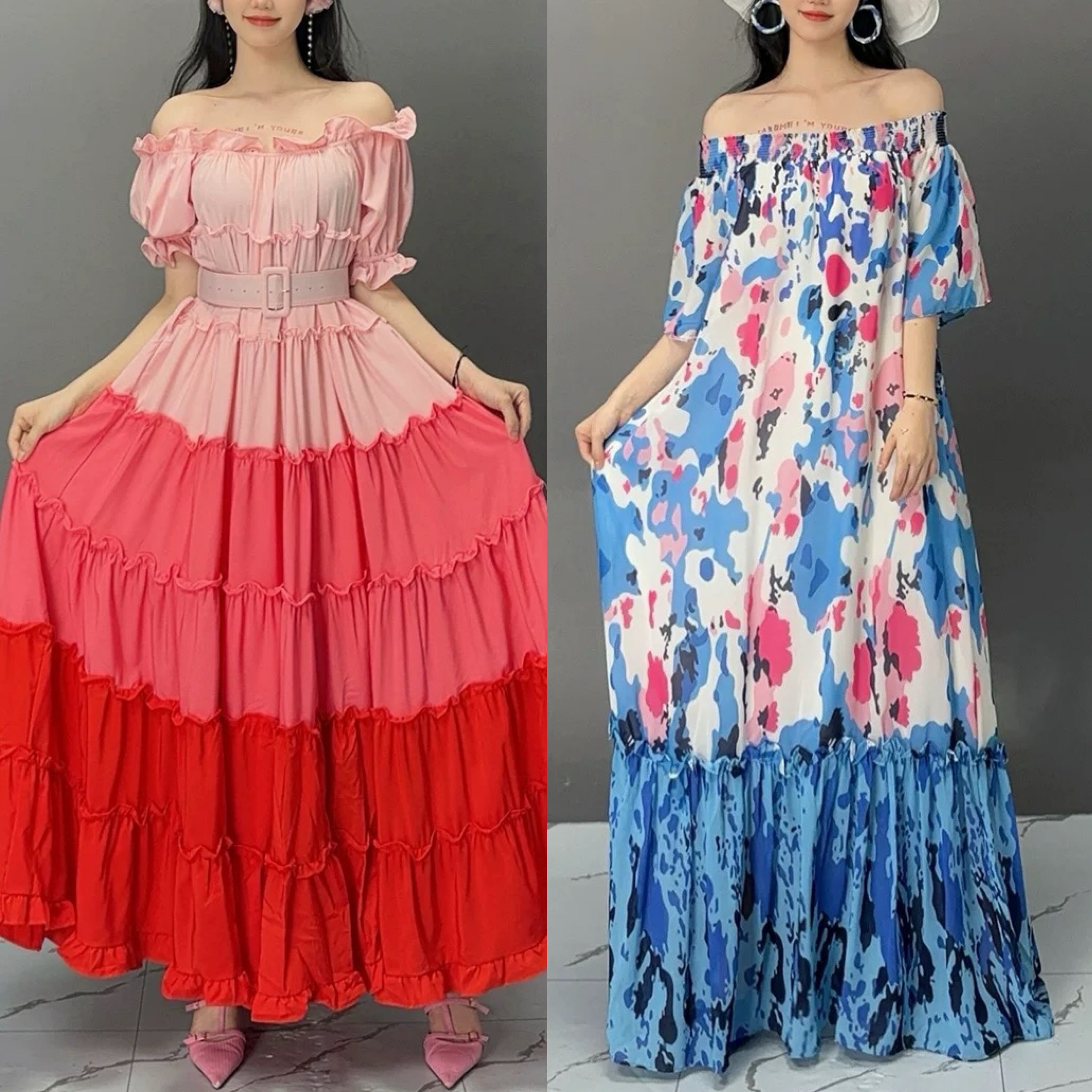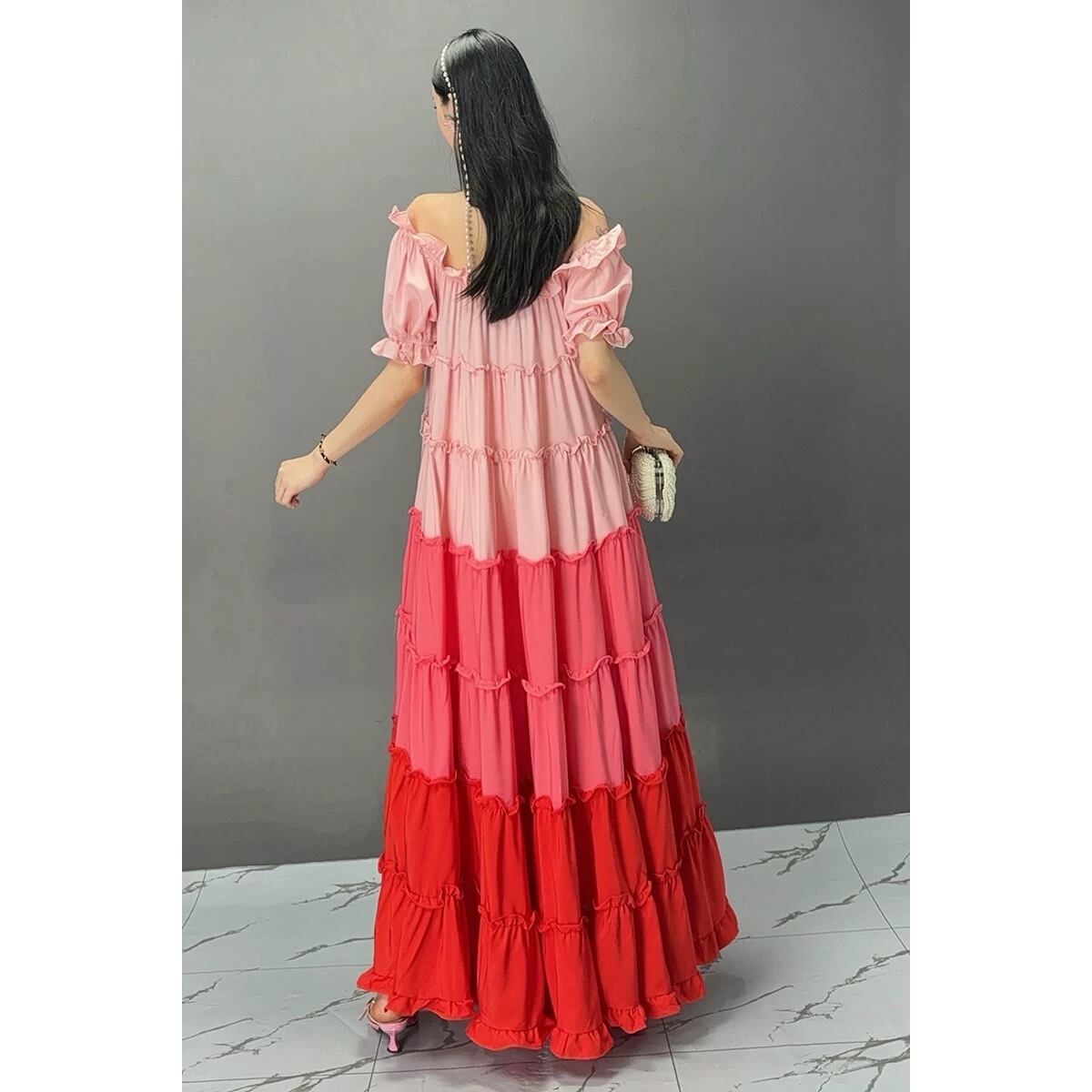 ピンク 水色 エスニック 可愛い エレガント オフショルダー ワンピース XL