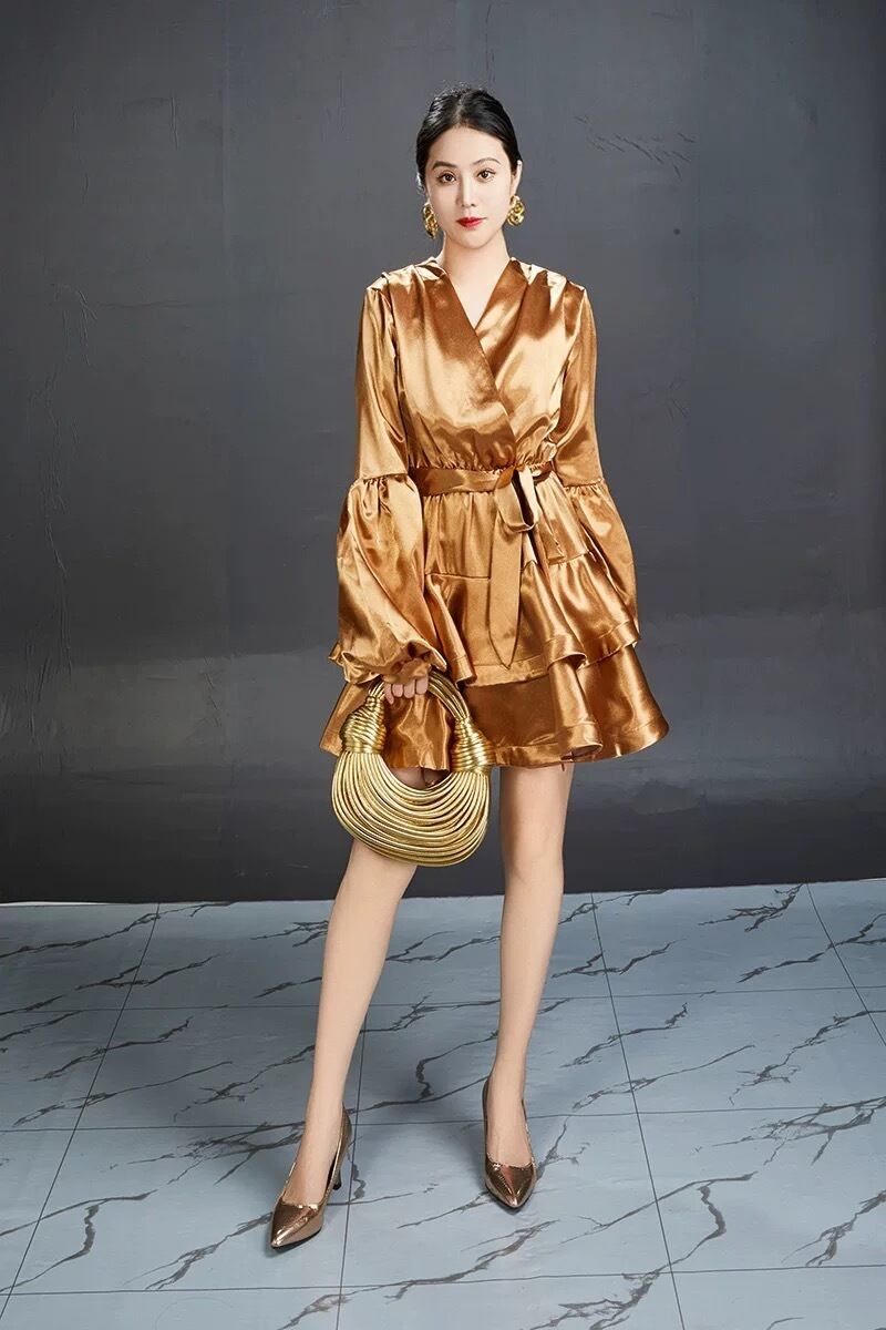 紫 金色 ゴールド 黒 ワンピース サテン カジュアル ドレス