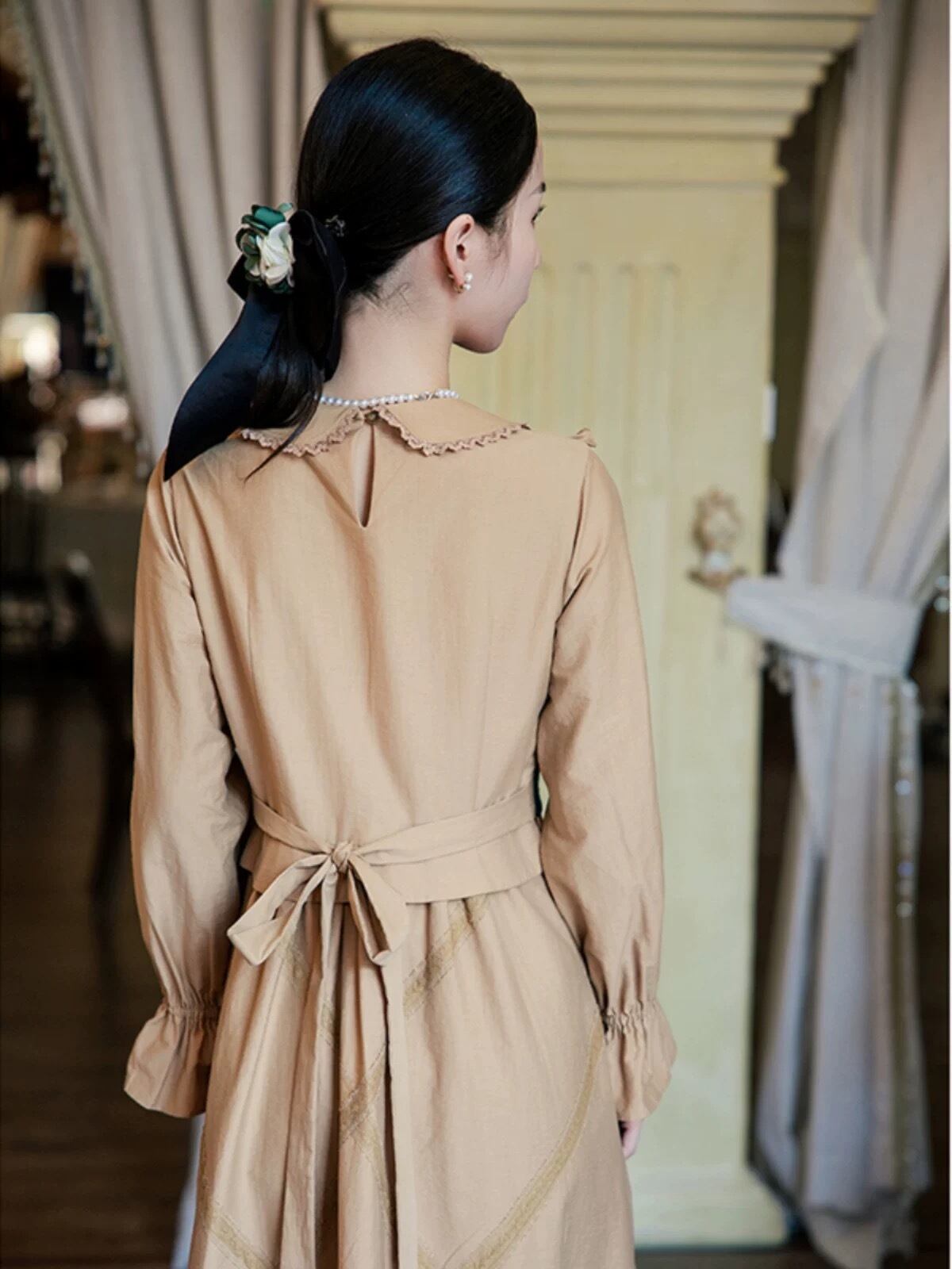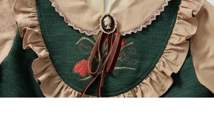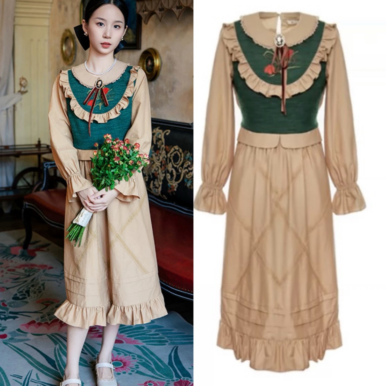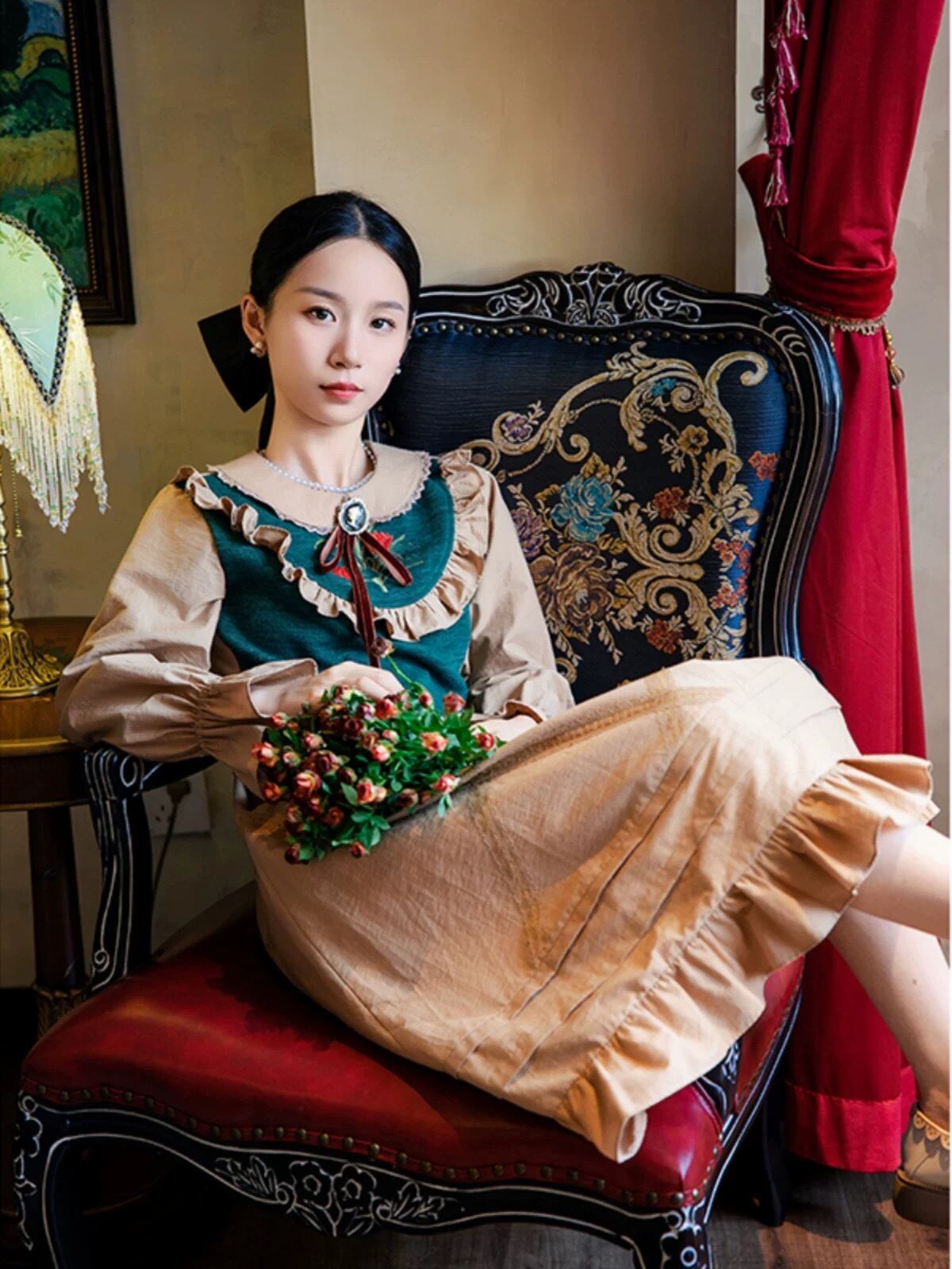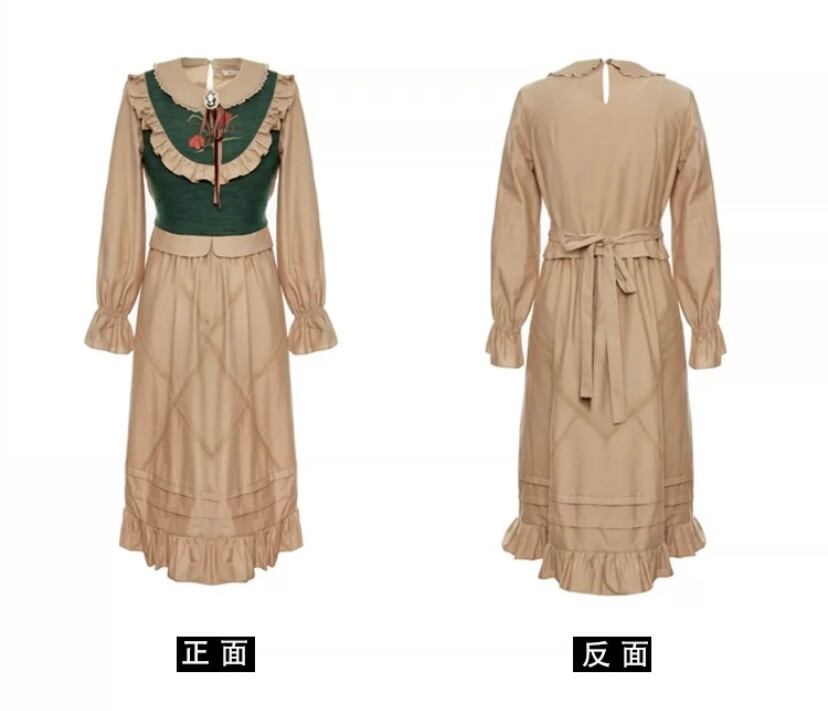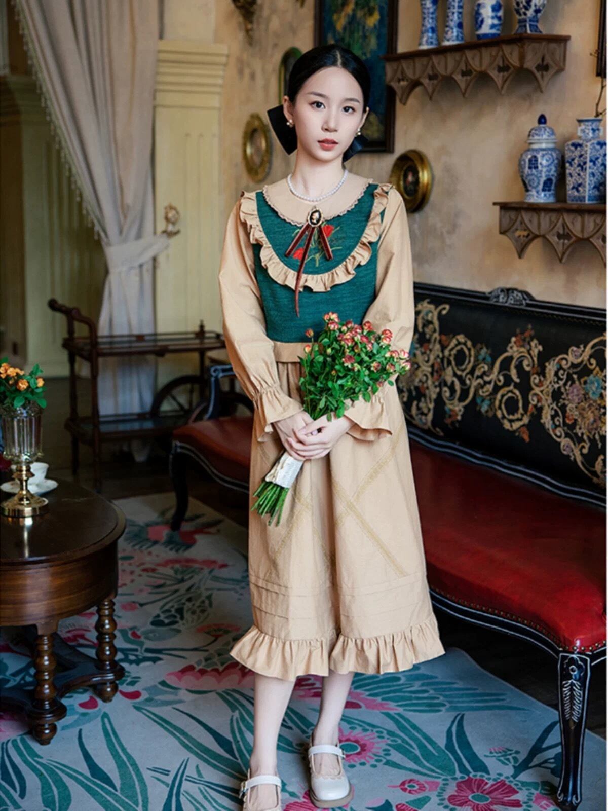 ベージュ ワンピース ブラウス 可愛い 緑 丸襟 ガーリー 原宿 森 姫 緑 赤 リボン XL XXL