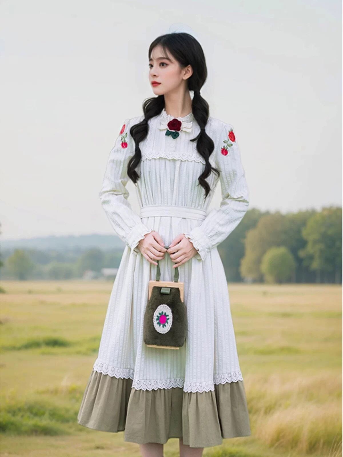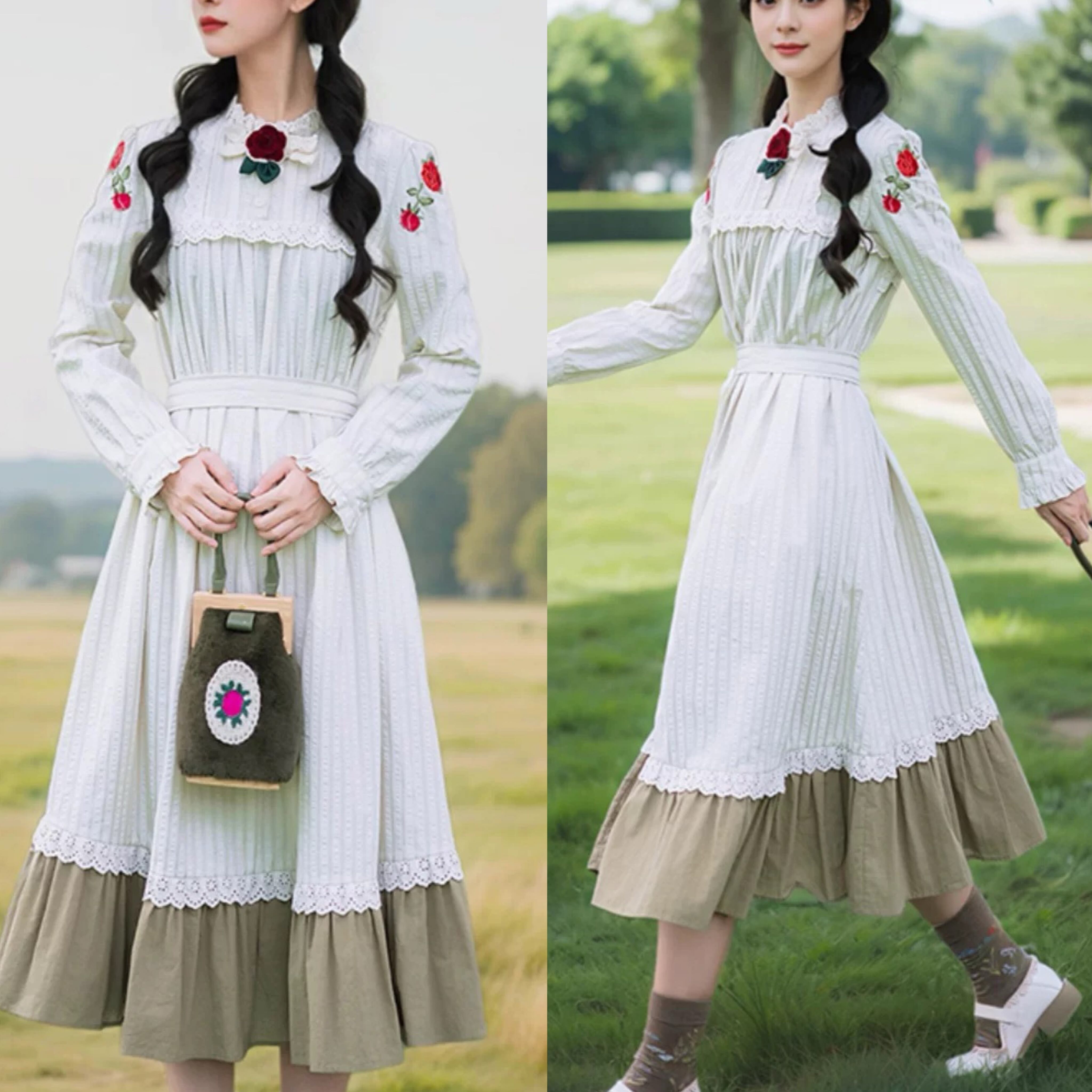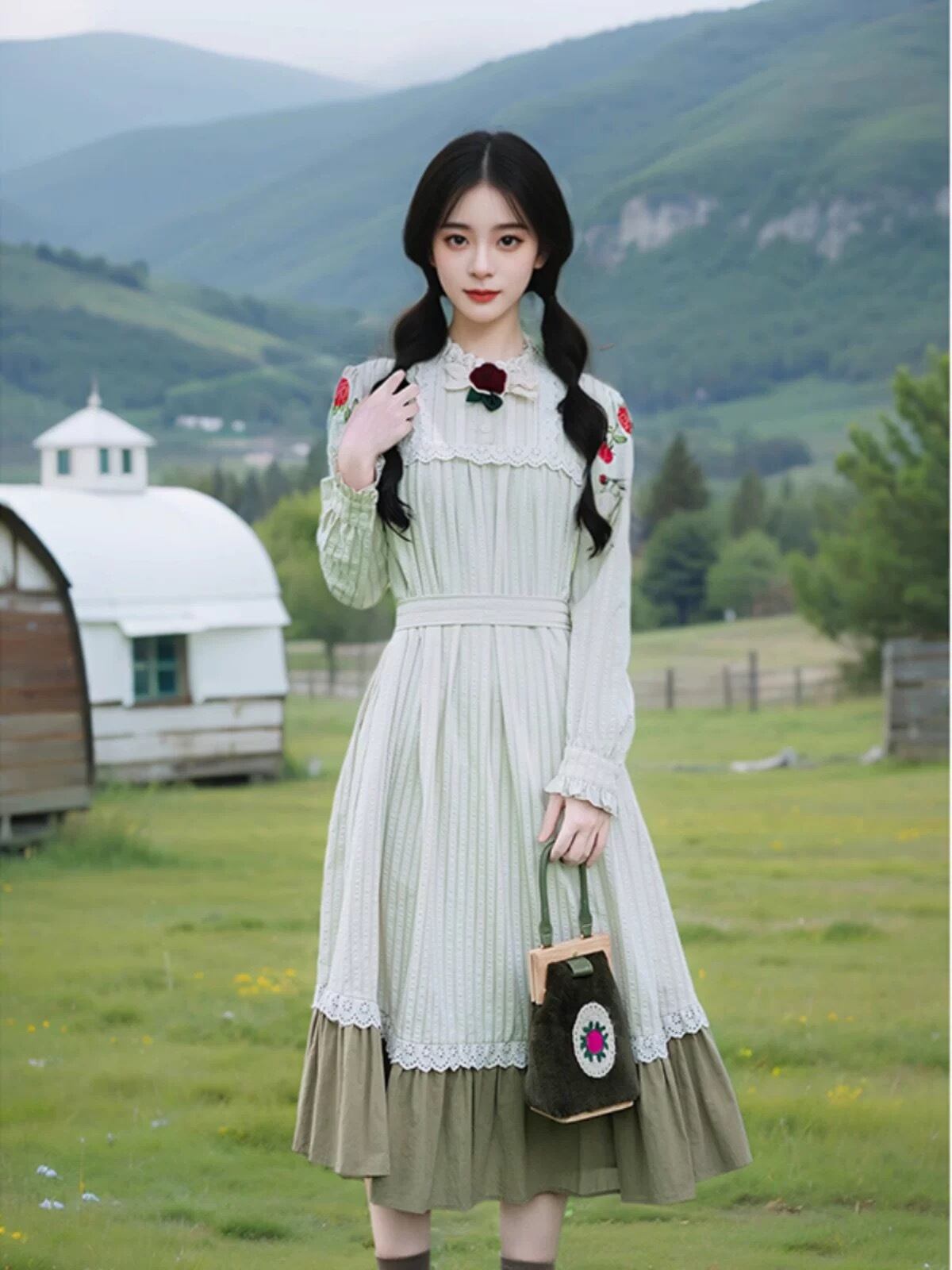 緑 ガーリー 可愛い ワンピース ゆったり 襟 セーラー 原宿 ブラウリボン 薔薇