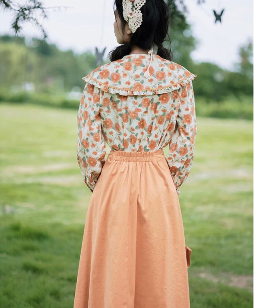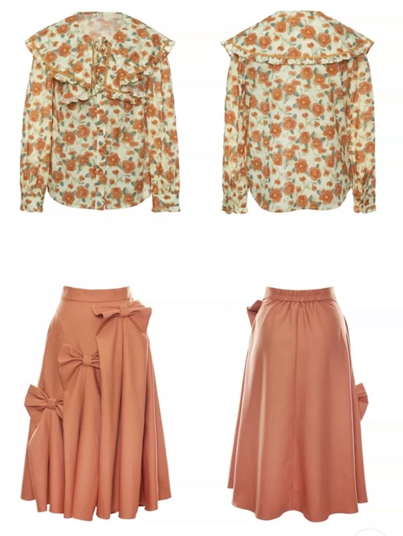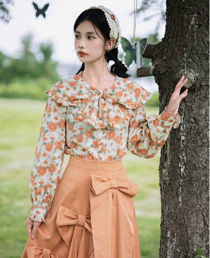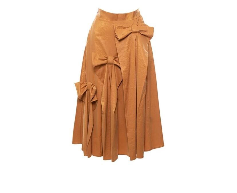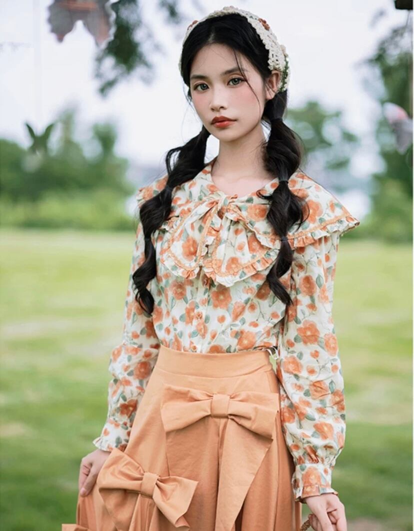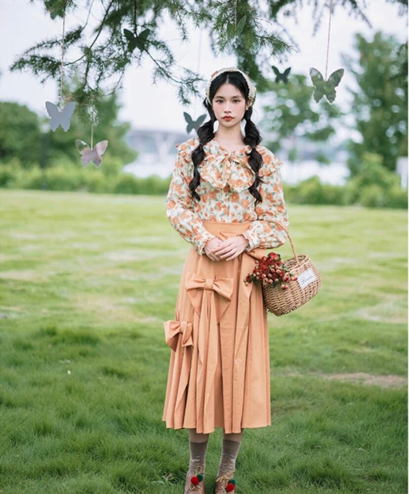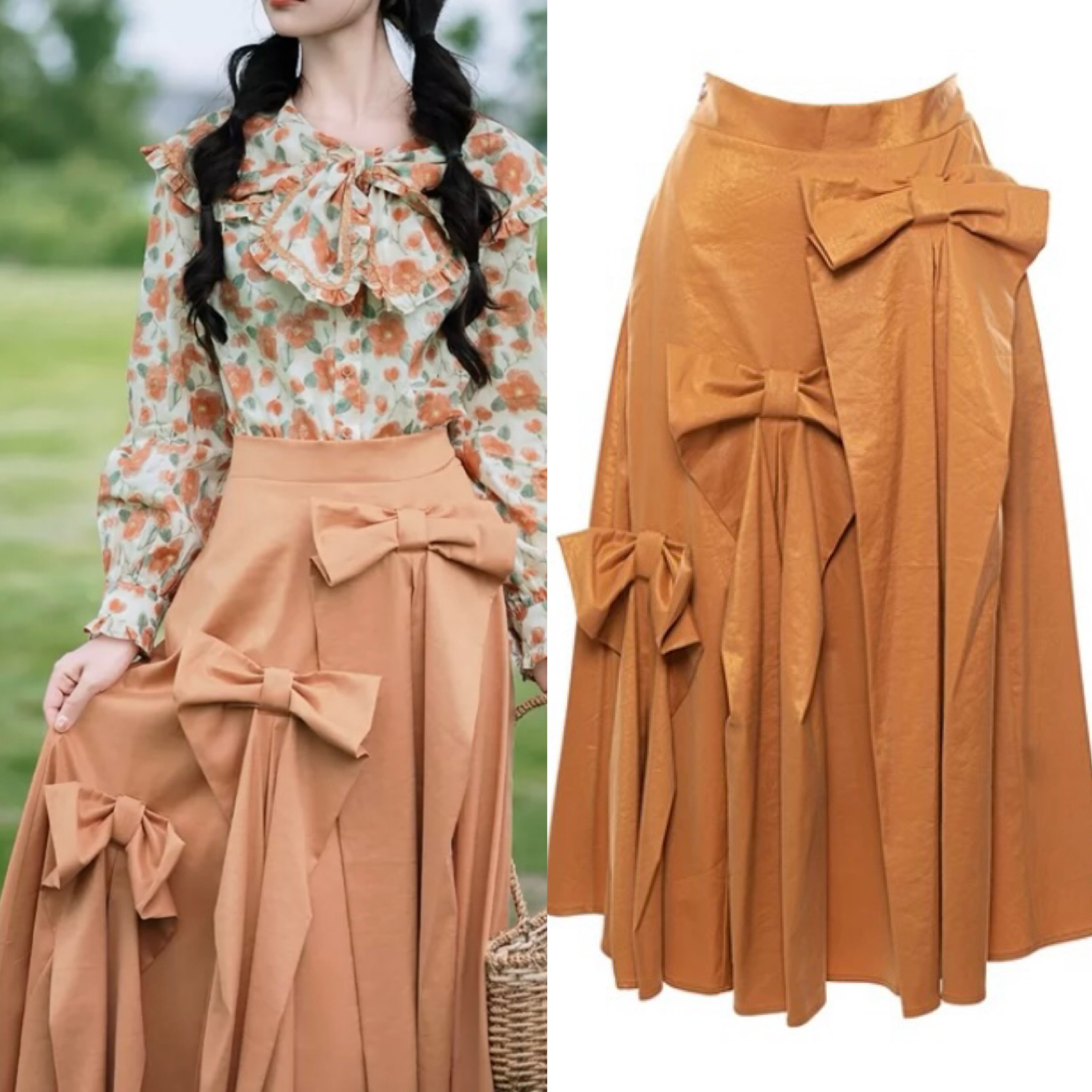 【スカート】オレンジ リボン ガーリー レトロ ボトムス 可愛い 姫 原宿 オレンジ