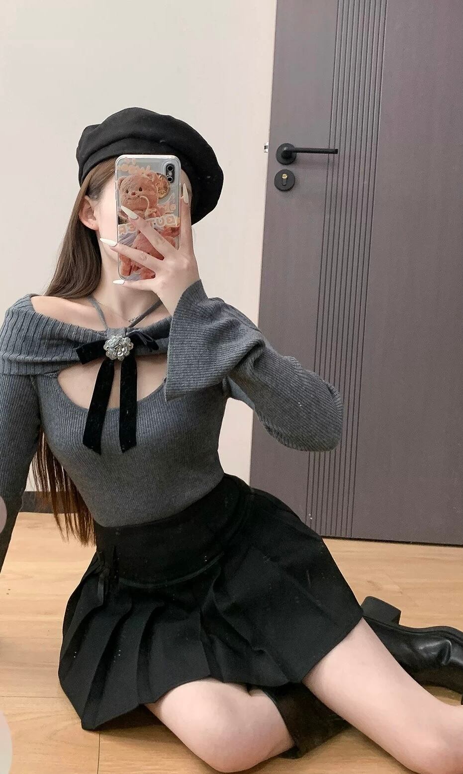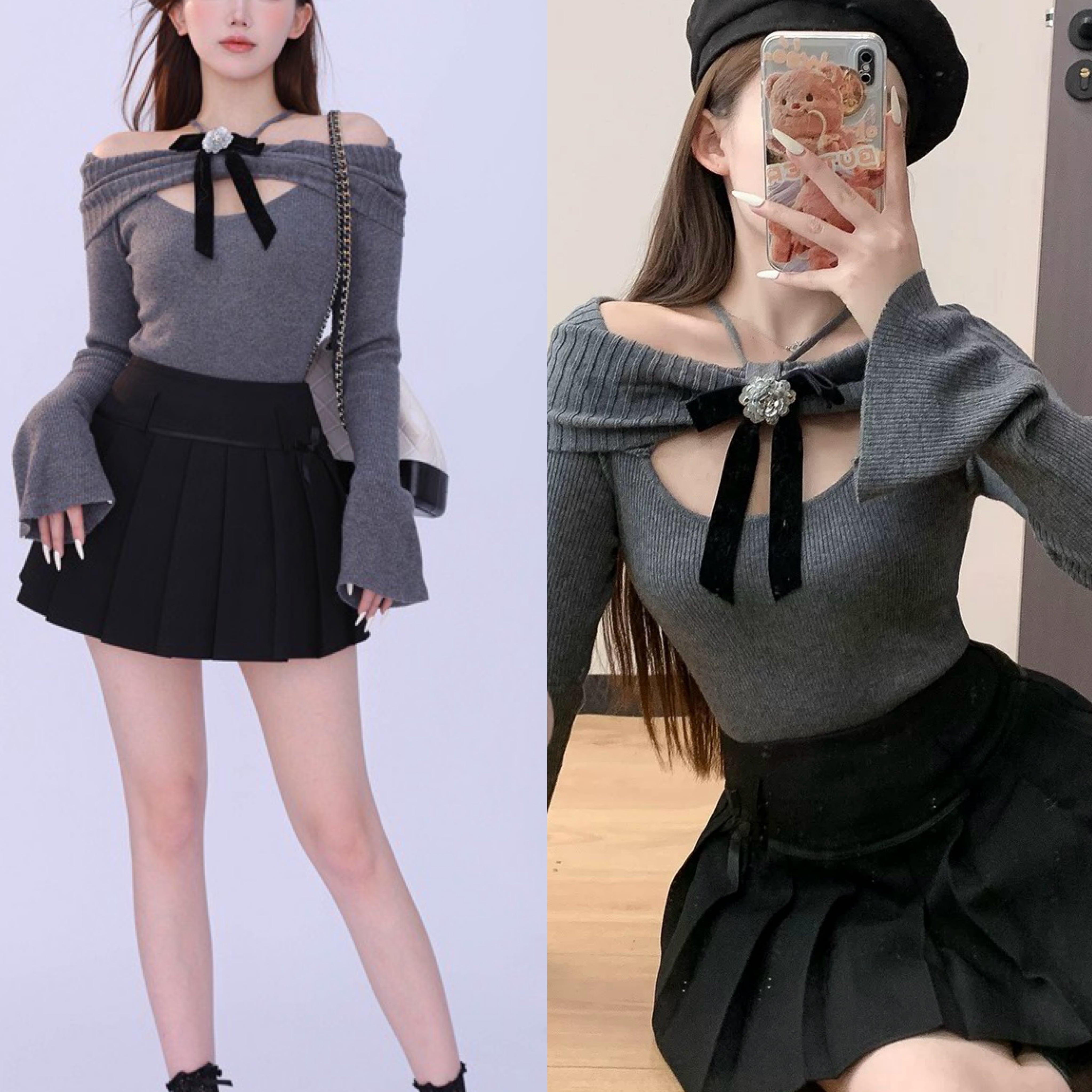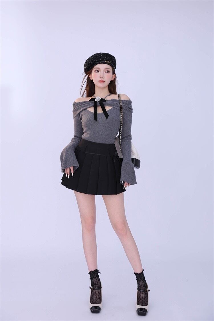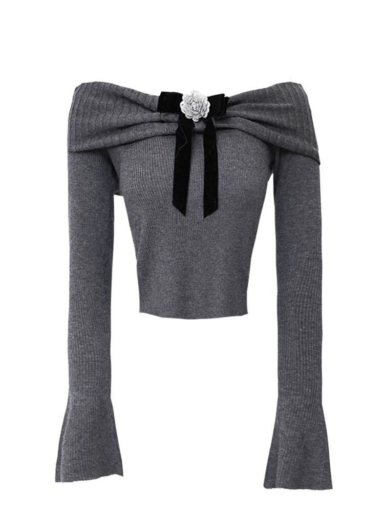 グレー 可愛い ガーリー セーター カーディガン ニット トップス カメリア リボン 原宿
