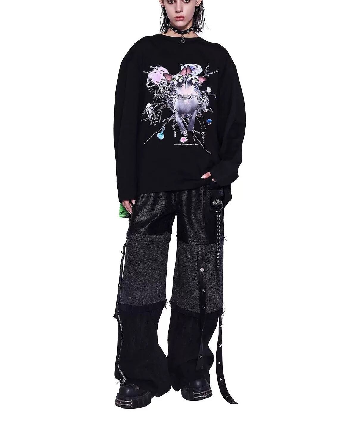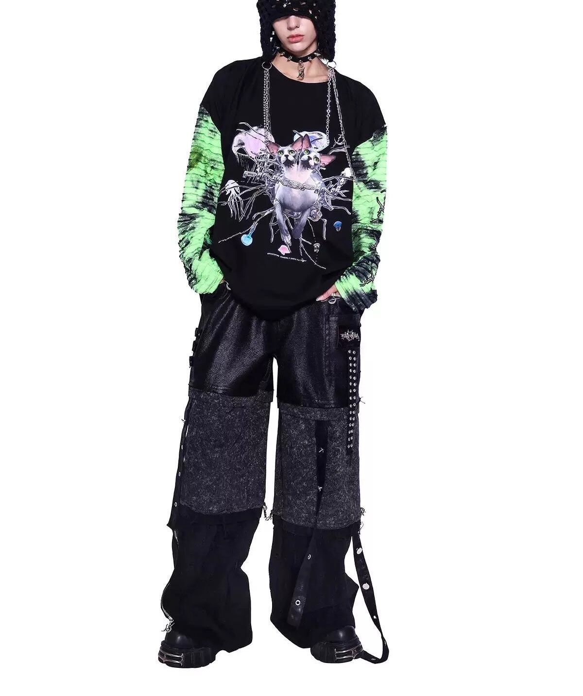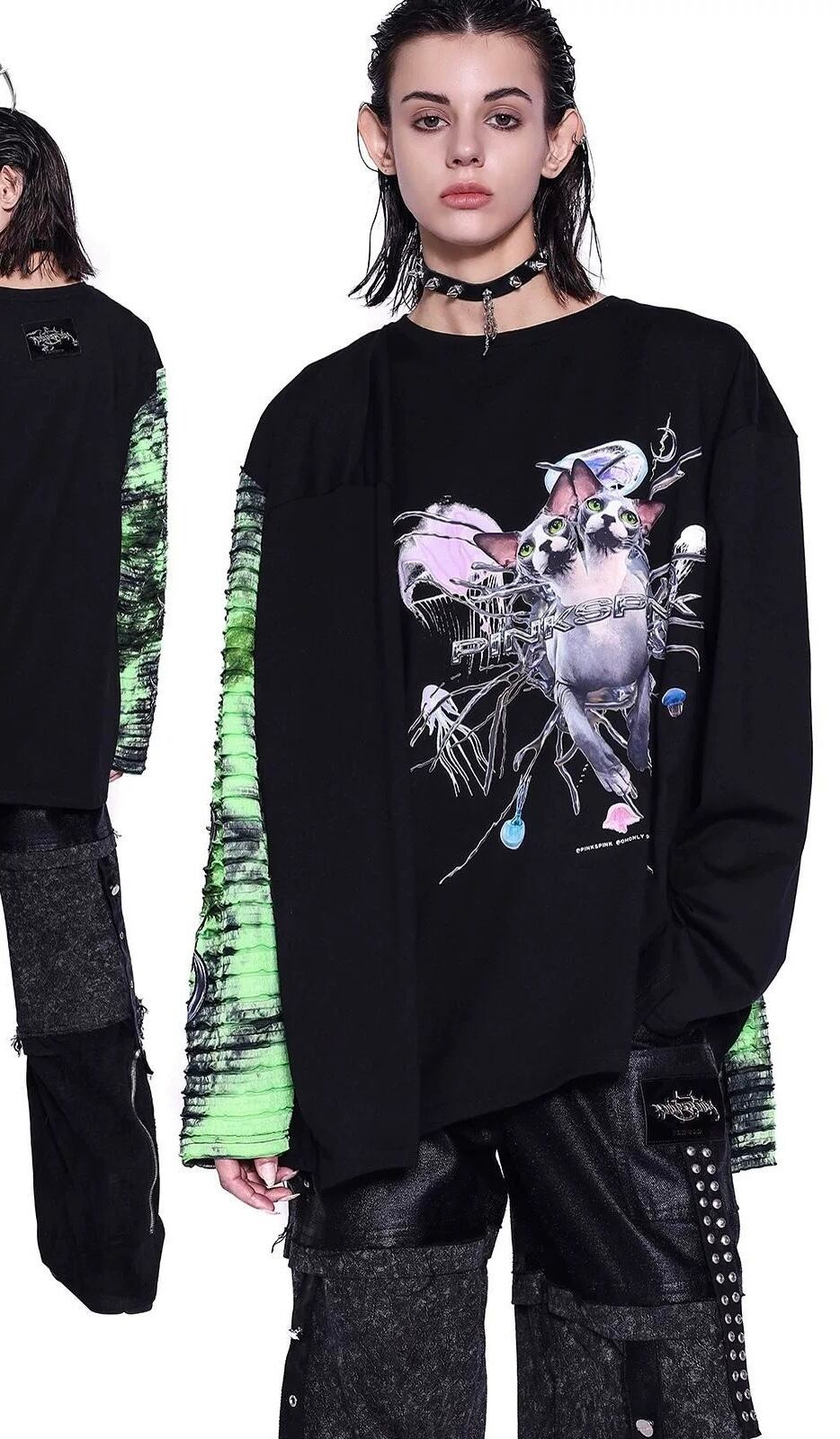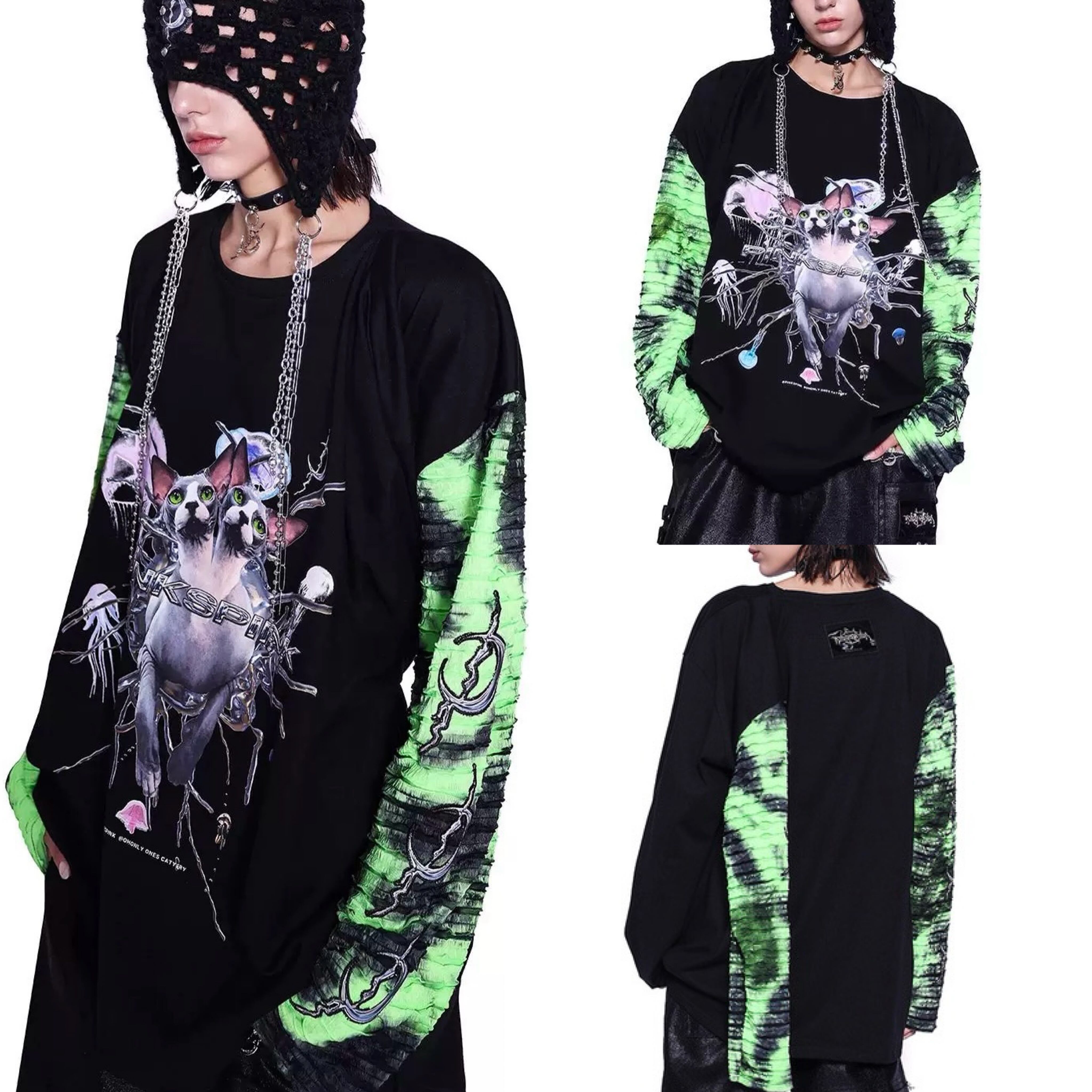 黒 緑 トップス Tシャツ ブラウス ボーダー ねこ ストリート 原宿