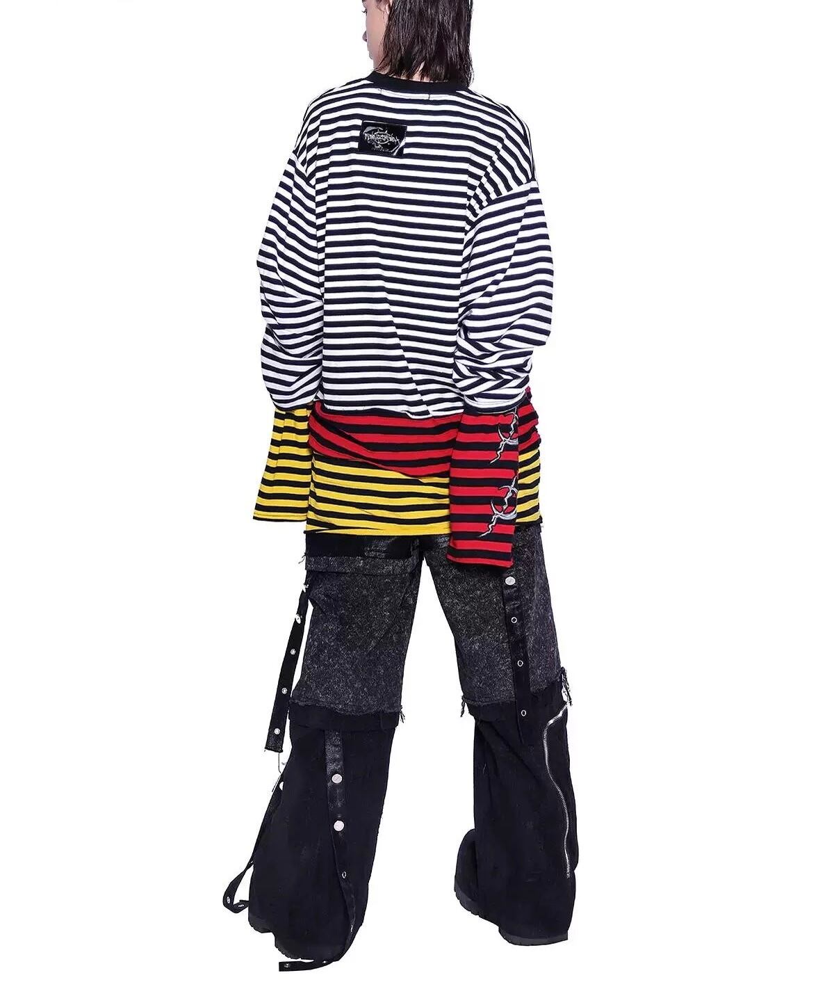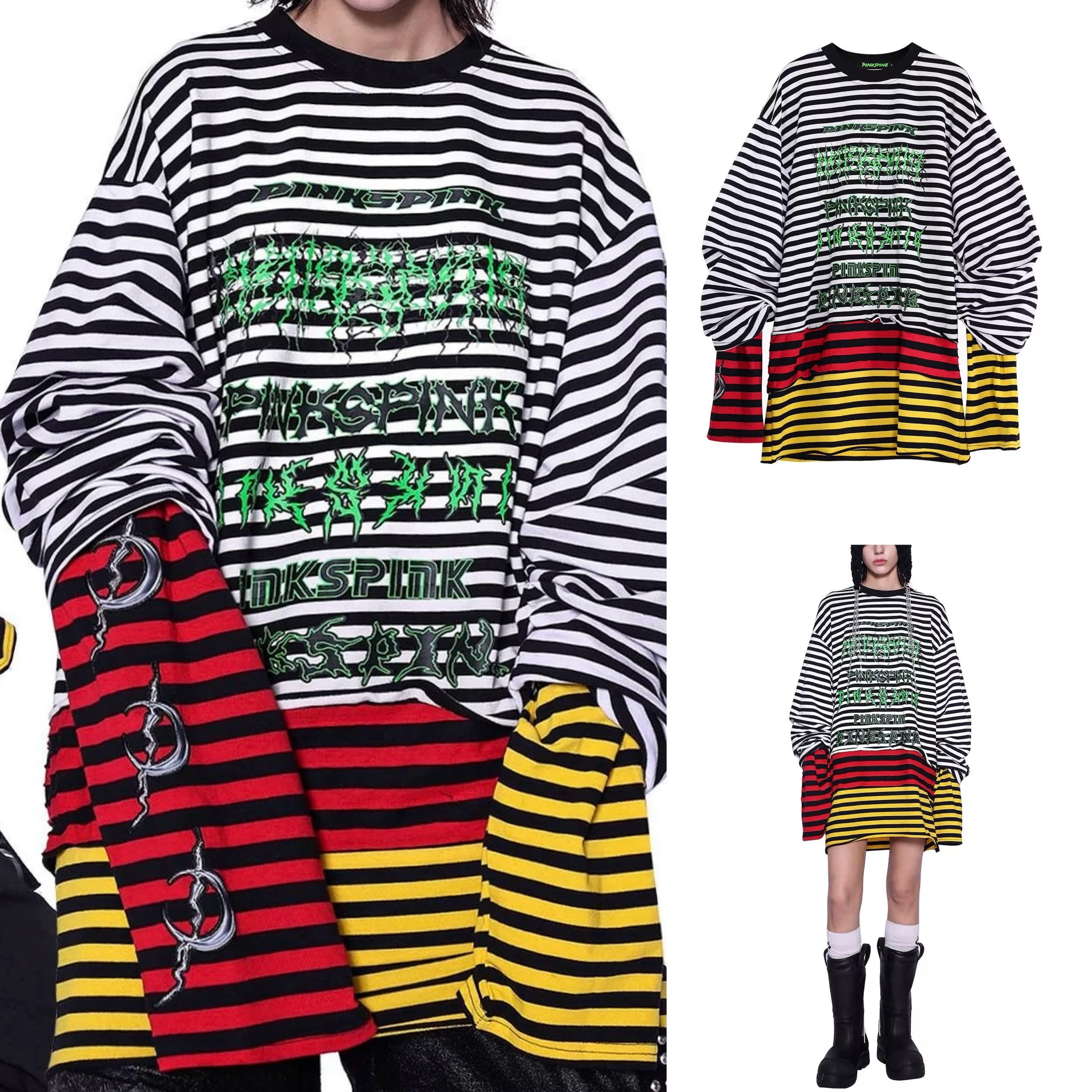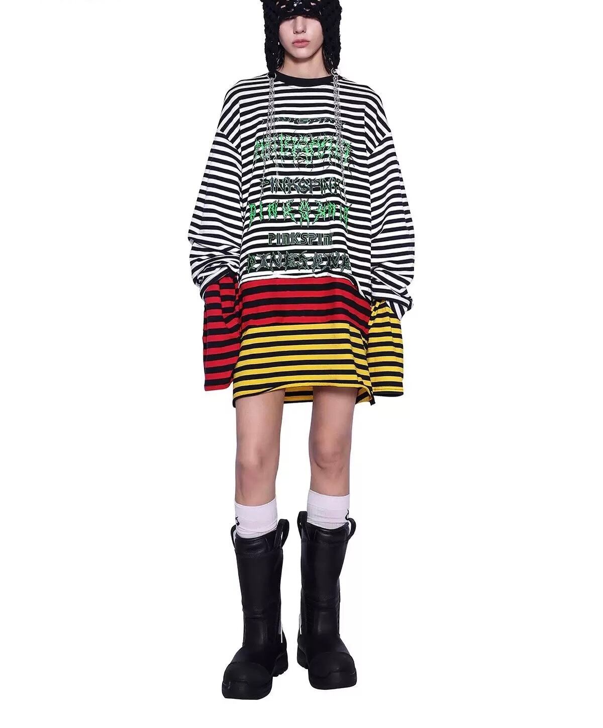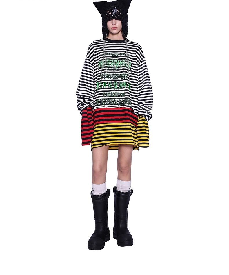 【2way】ボーダー チェック 黄色 赤 白 黒 トップス ワンピース 黒 Tシャツ スウェット トレーナー