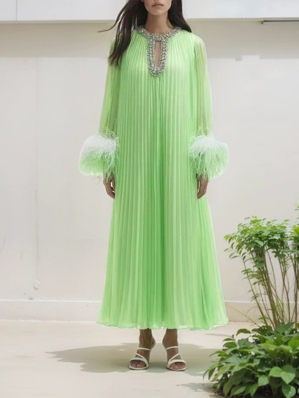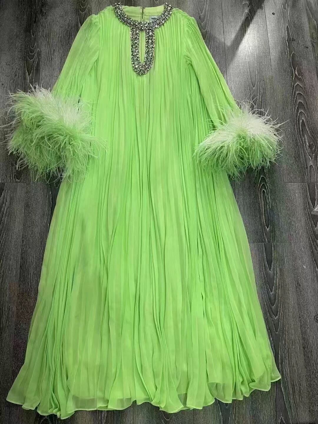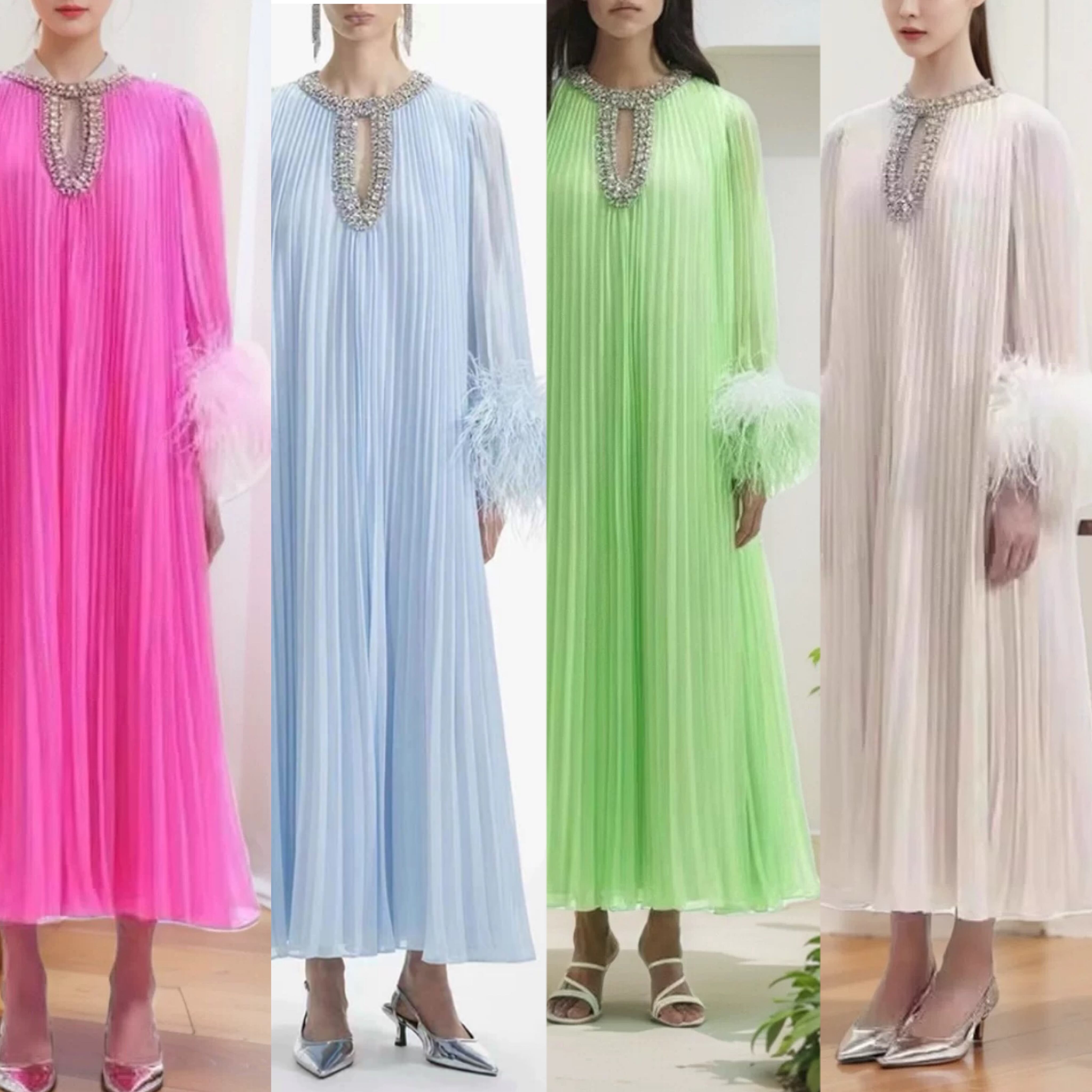 【XLまで】水色 白 ピンク プリーツ ワンピース ラインストーン ゆったり パーティー ドレス 緑