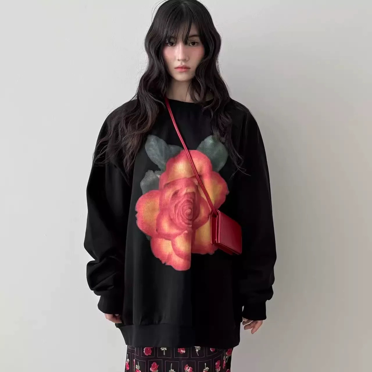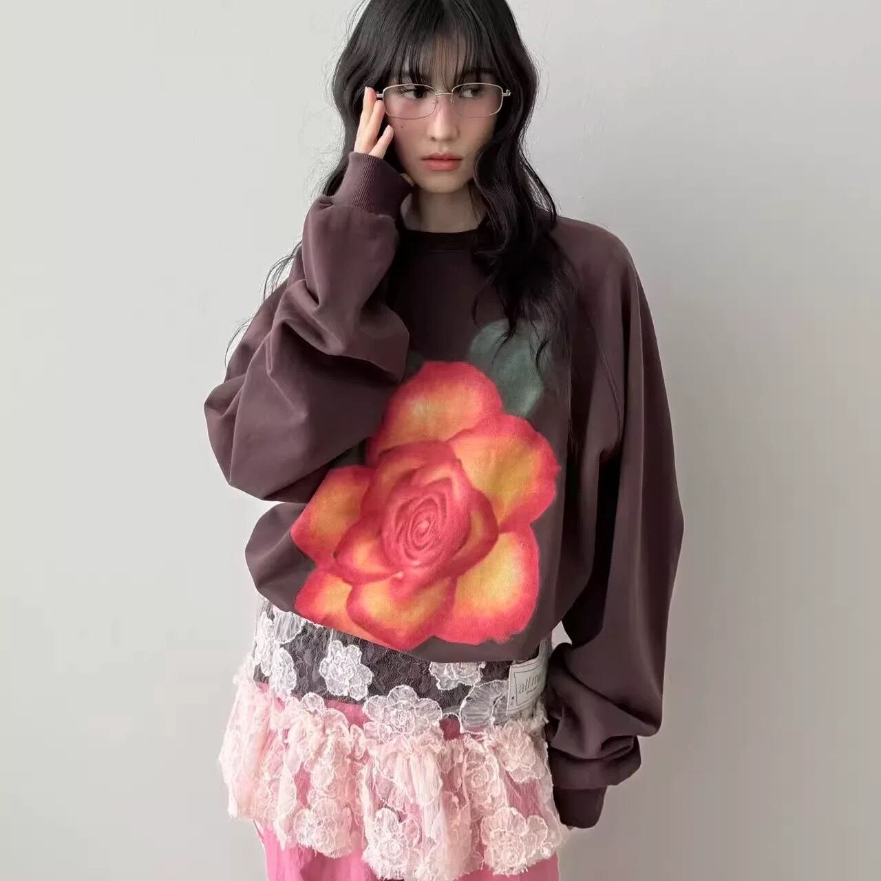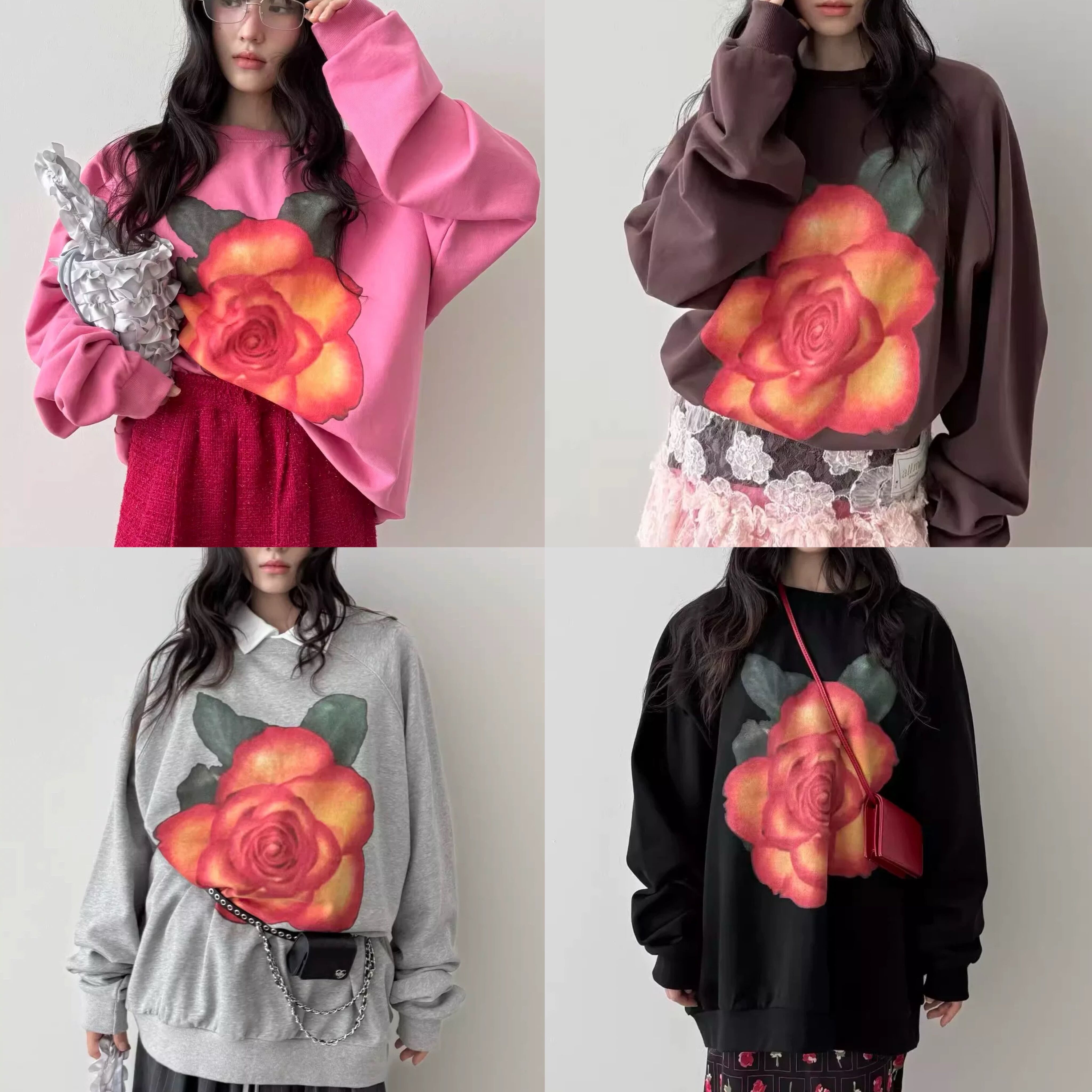 花柄 トレーナー ピンク 茶色 黒 グレー 薔薇 フラワー スウェット トレーナー カジュアル 可愛い