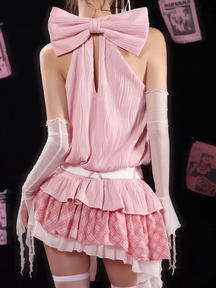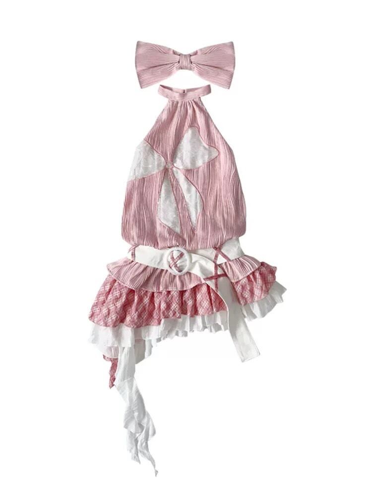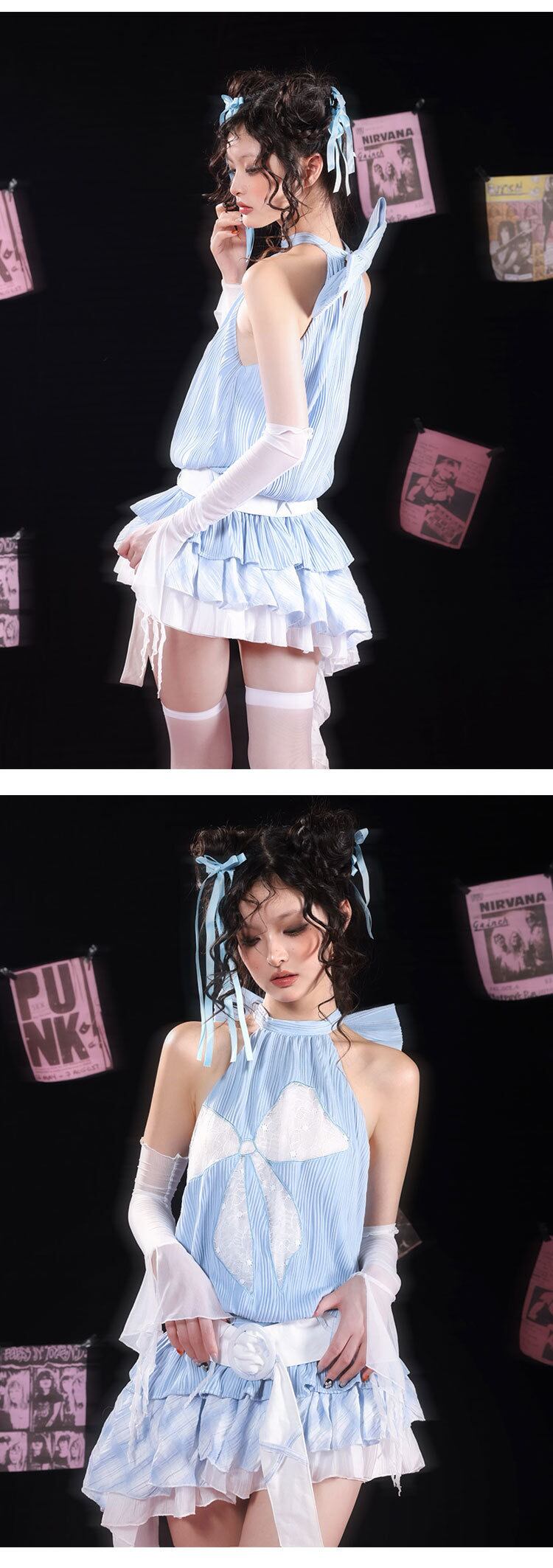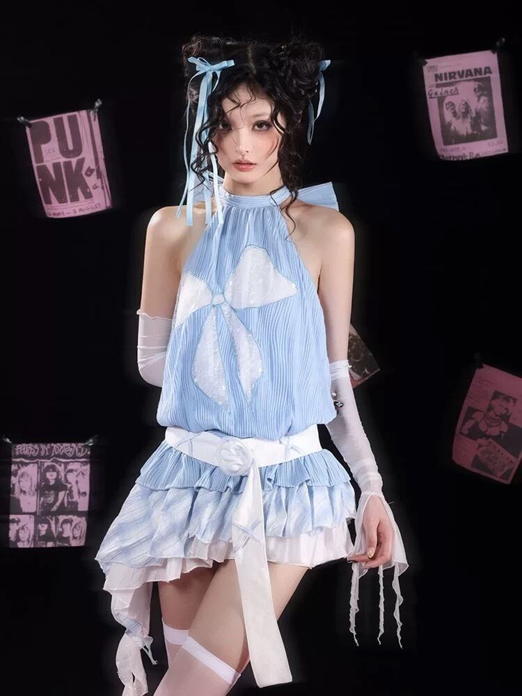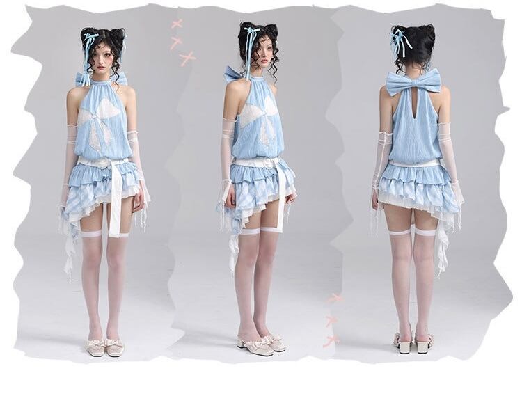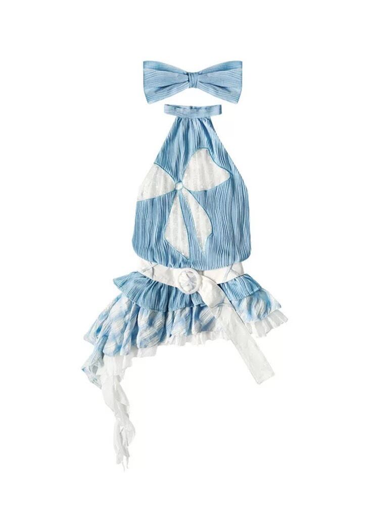 【水色】ベアトップ リボン ガーリー チュニック ワンピース 可愛い リボン ホルダーネック ブラウス 原宿