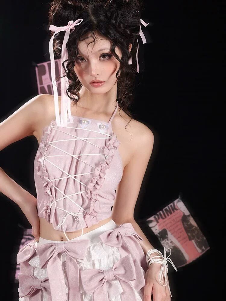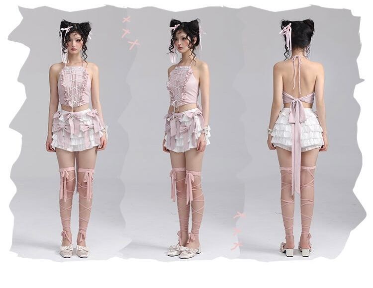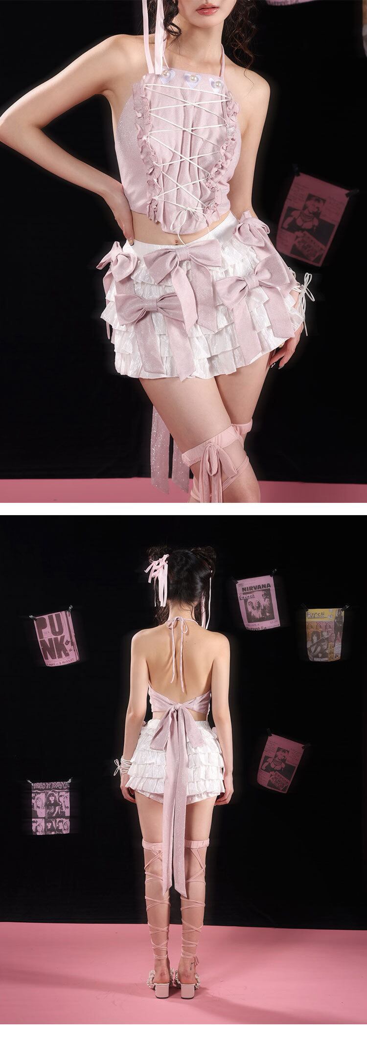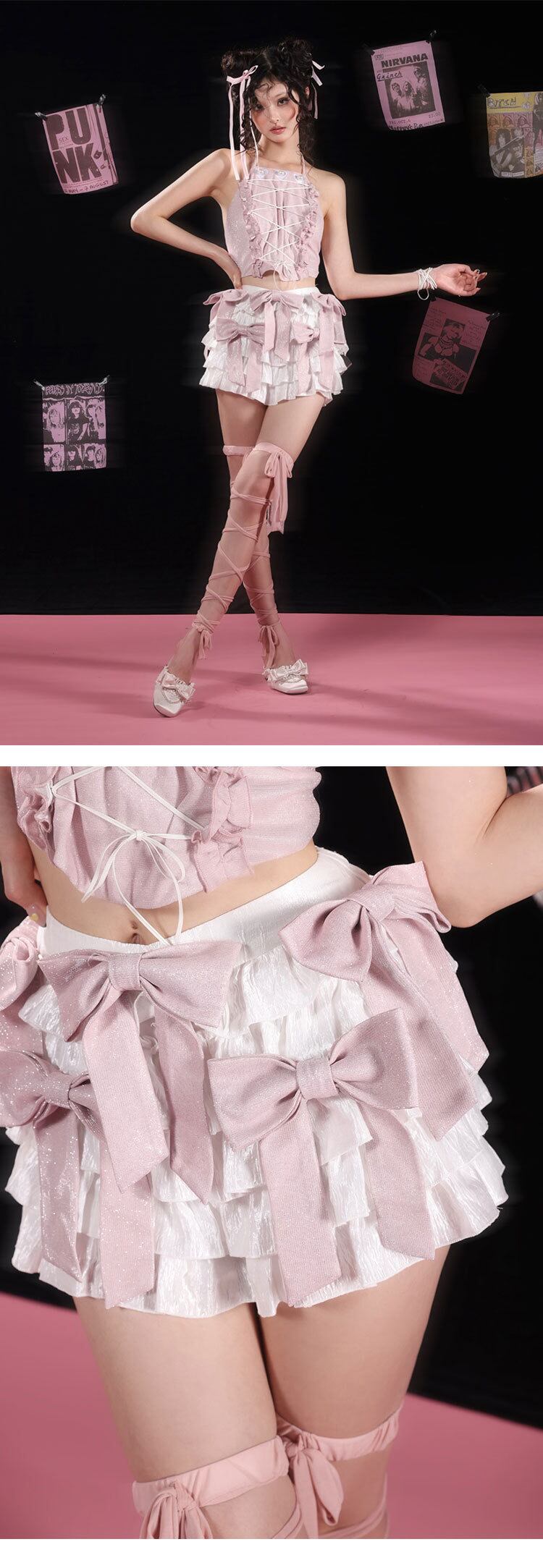 【セットアップ】ピンク リボン 白 可愛い ガーリー 女の子 原宿 ミニスカート ブラウス リボン スーツ 姫 衣装