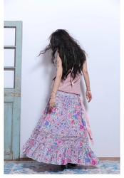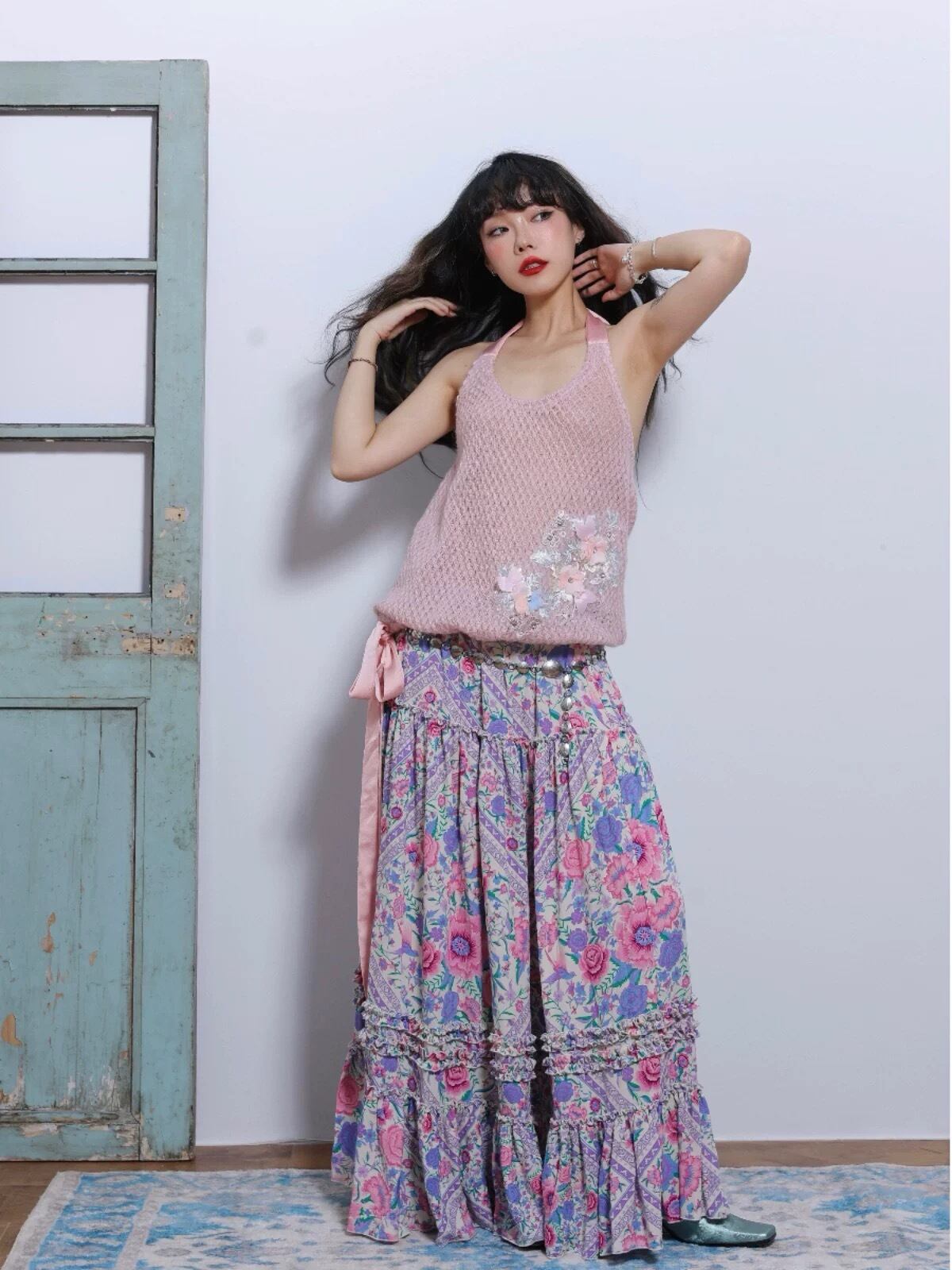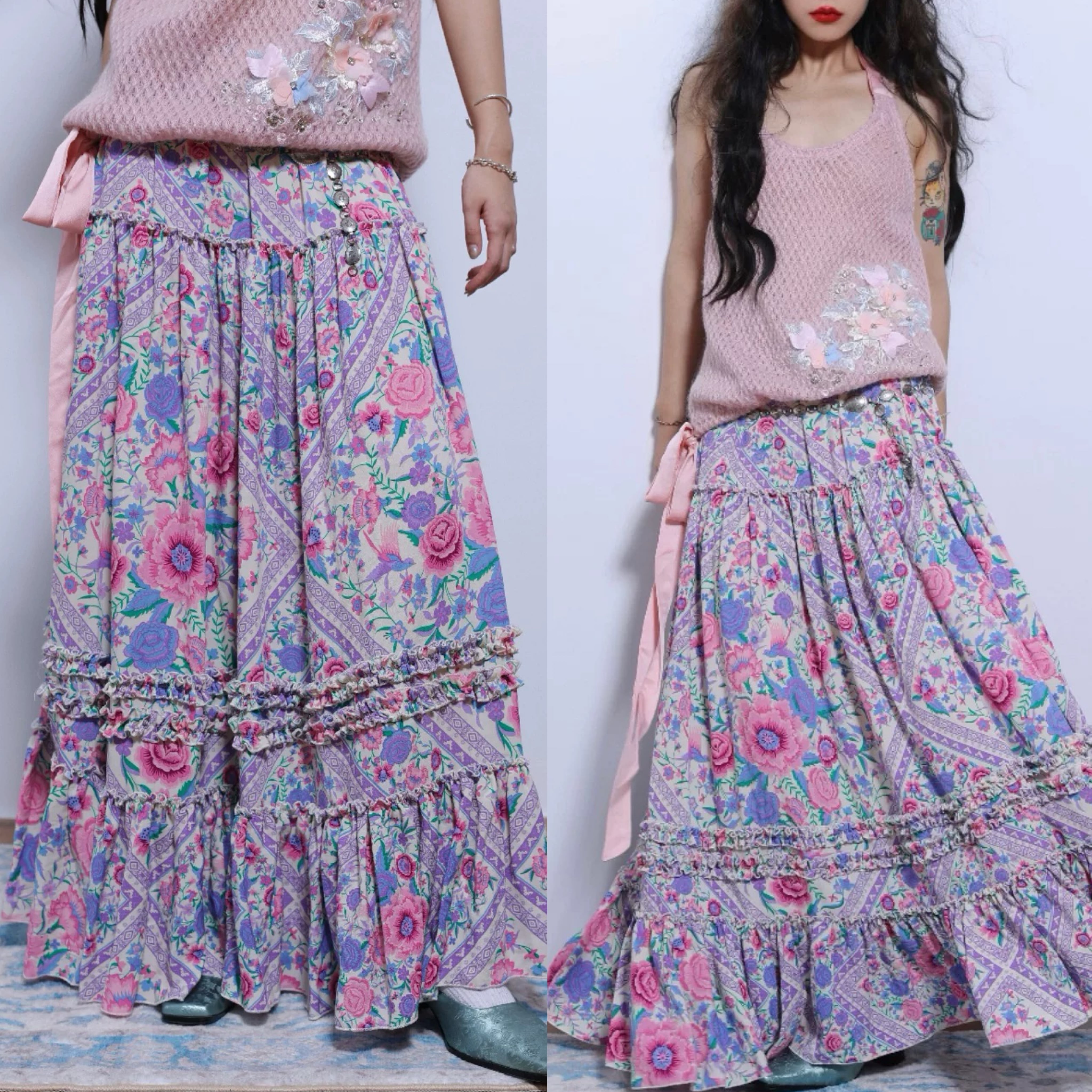 スカート 花柄 華やか フラワー ピンク 紫 リボン フレア ボトムス マキシ ロング