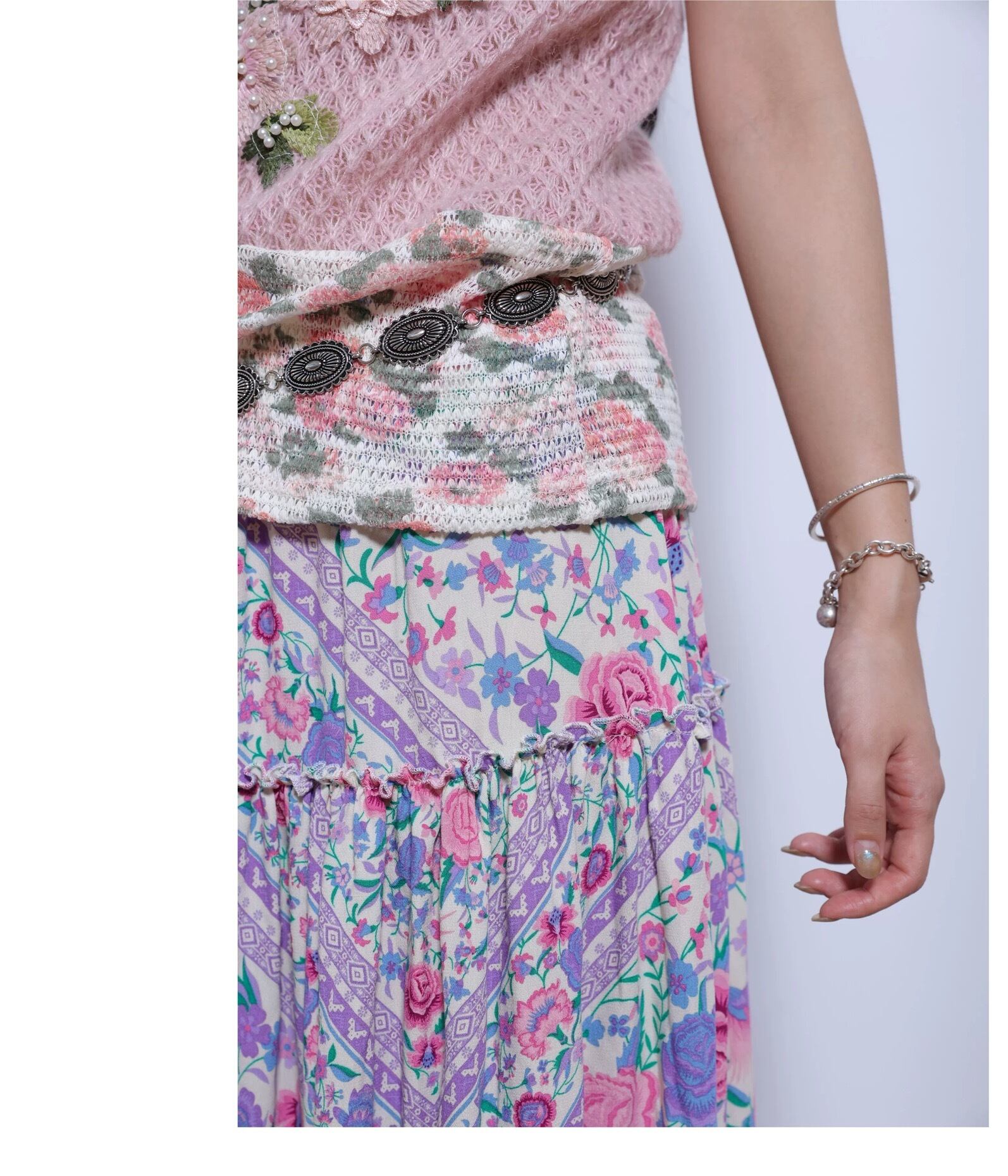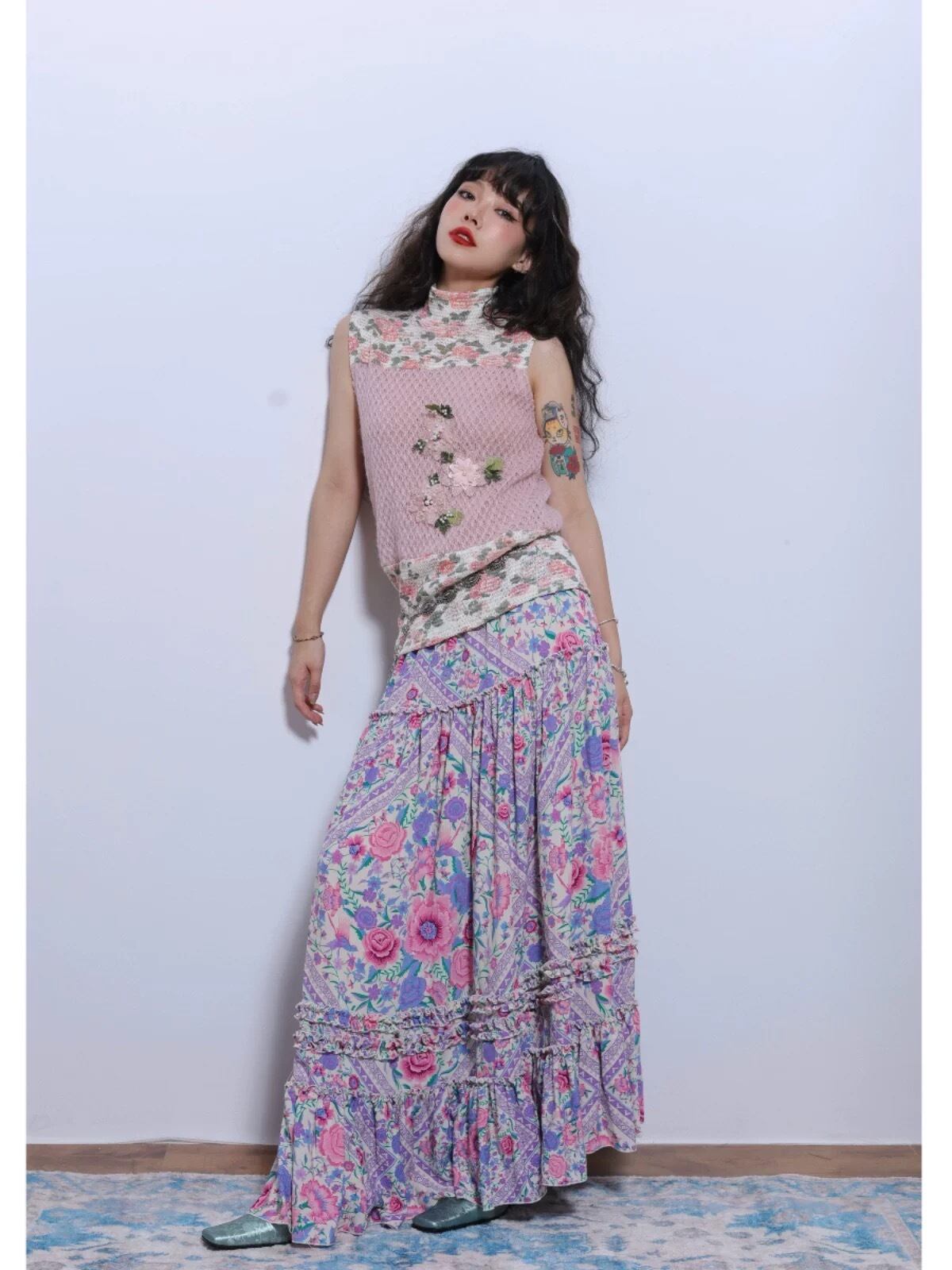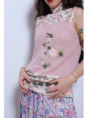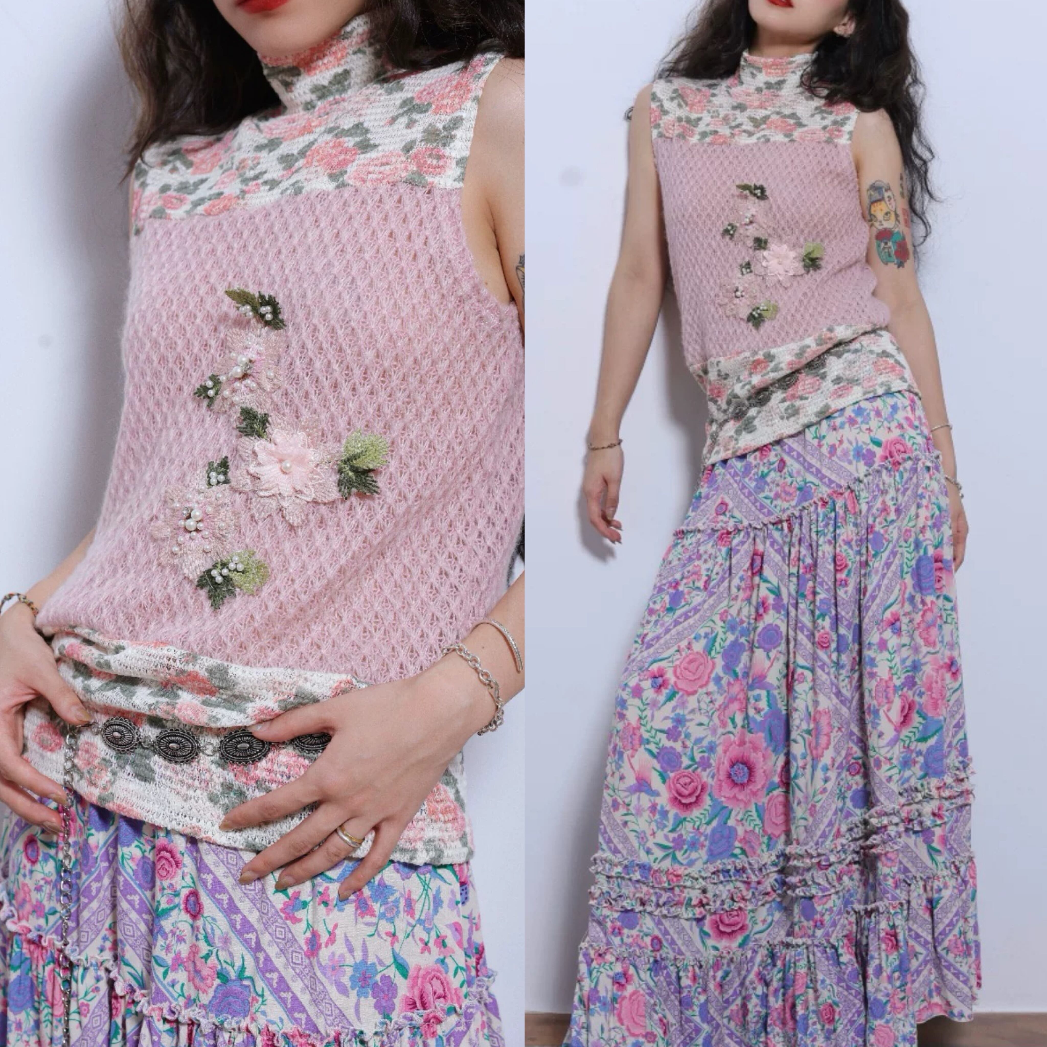ハイネック ノースリーブ 花柄 エスニック カーディガン セーター ピンク カーディガン ブラウス キャミソール 可愛い 古着 アジアン