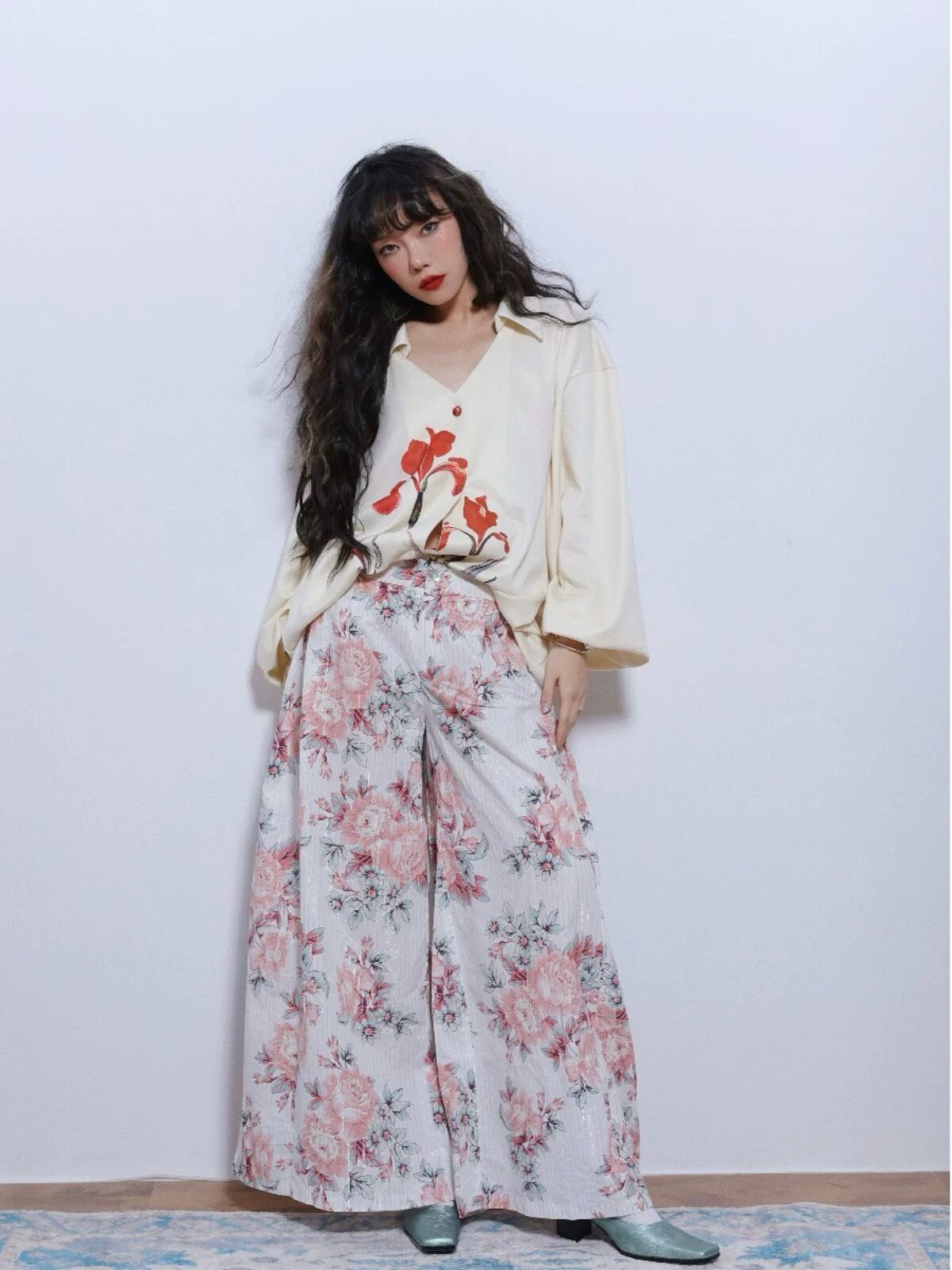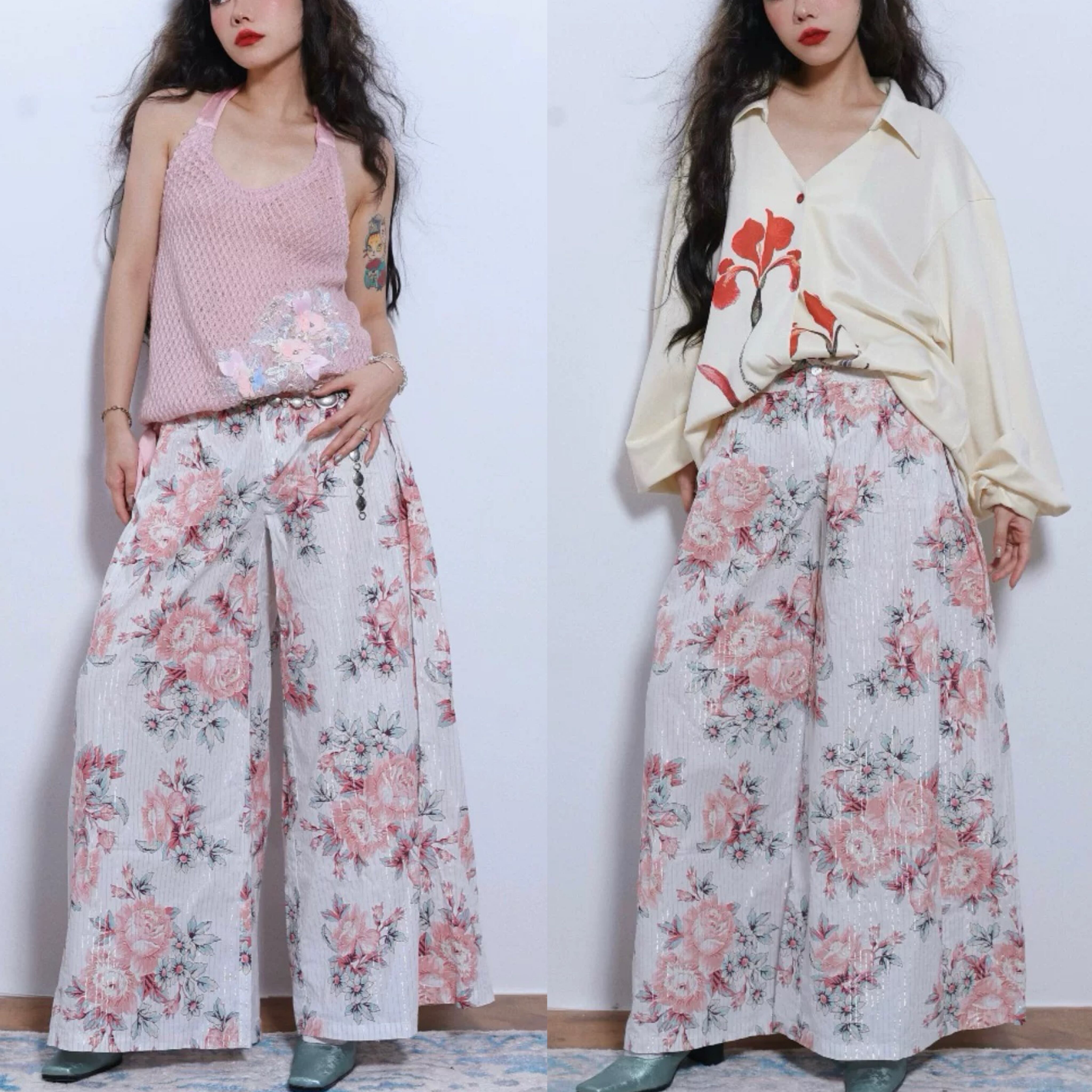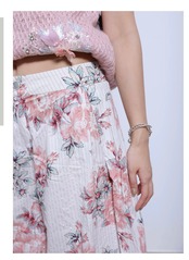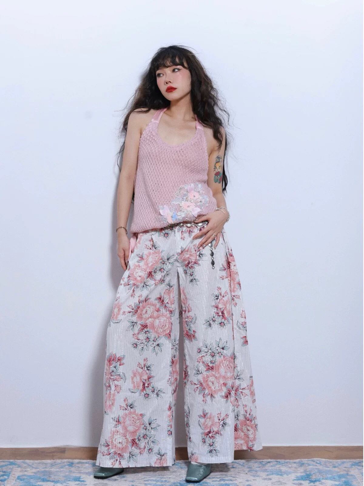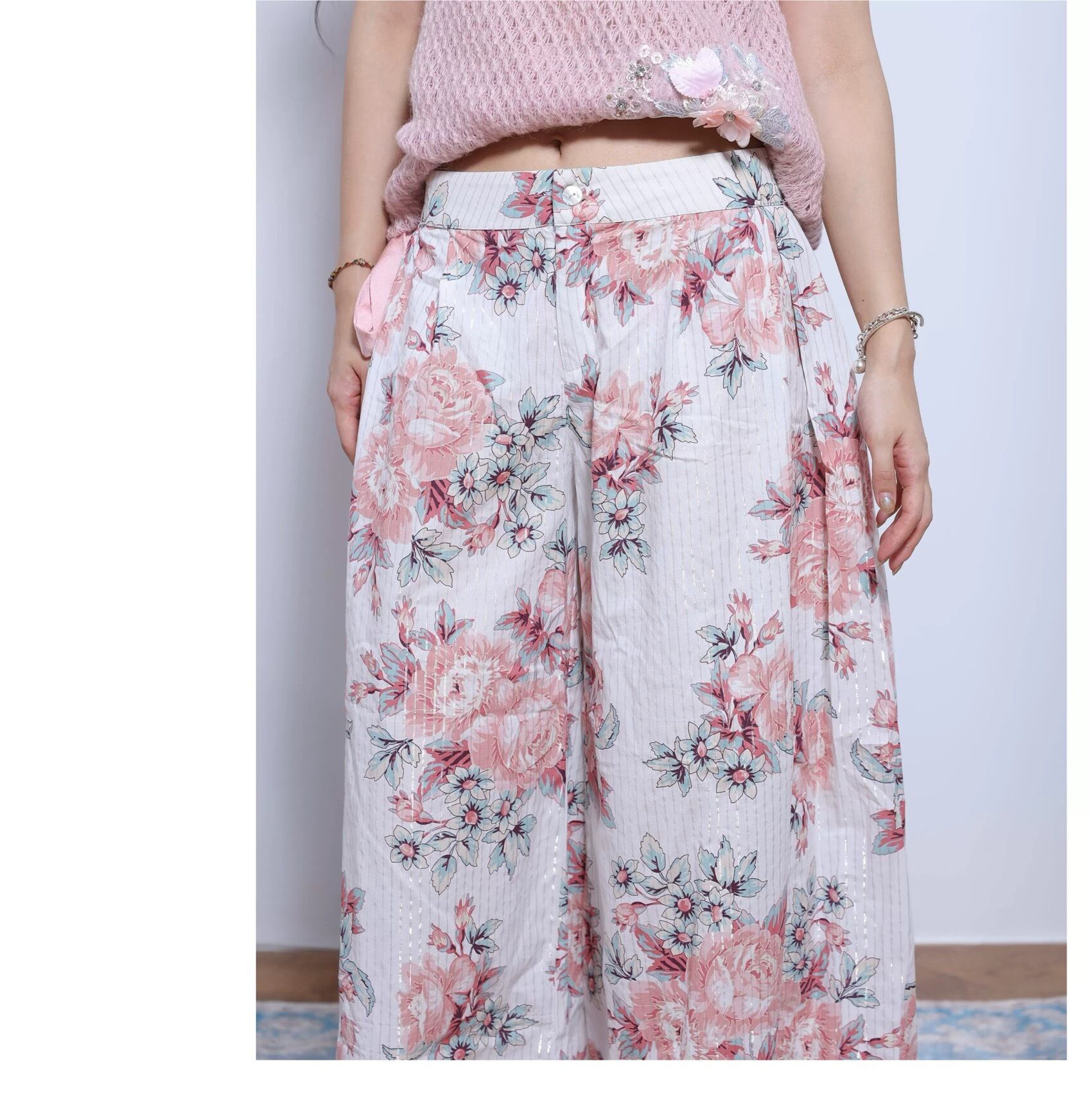 花柄 ピンク 白 パンツ 太め ボトムス ズボン ガーリー 可愛い