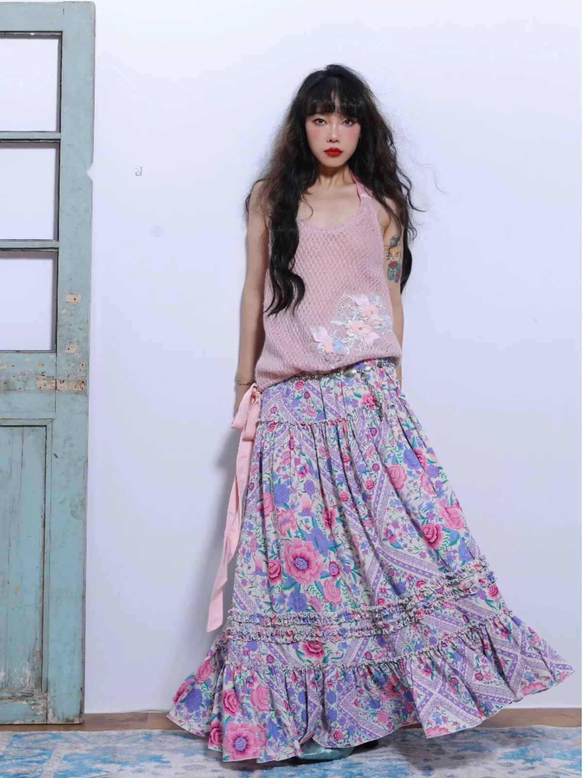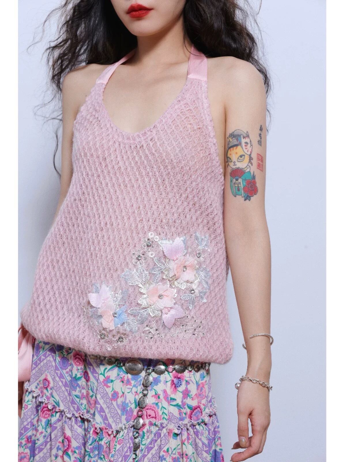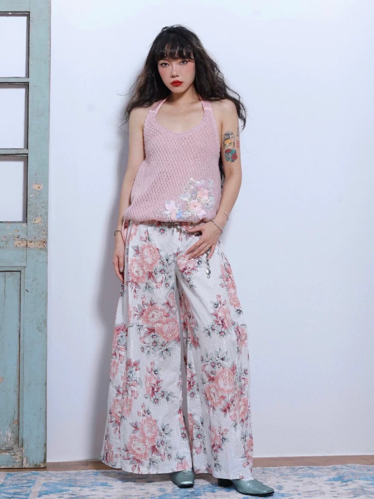ピンク トップス ホルダーネック 花柄 フラワー セーター ブラウス トップス カーディガン