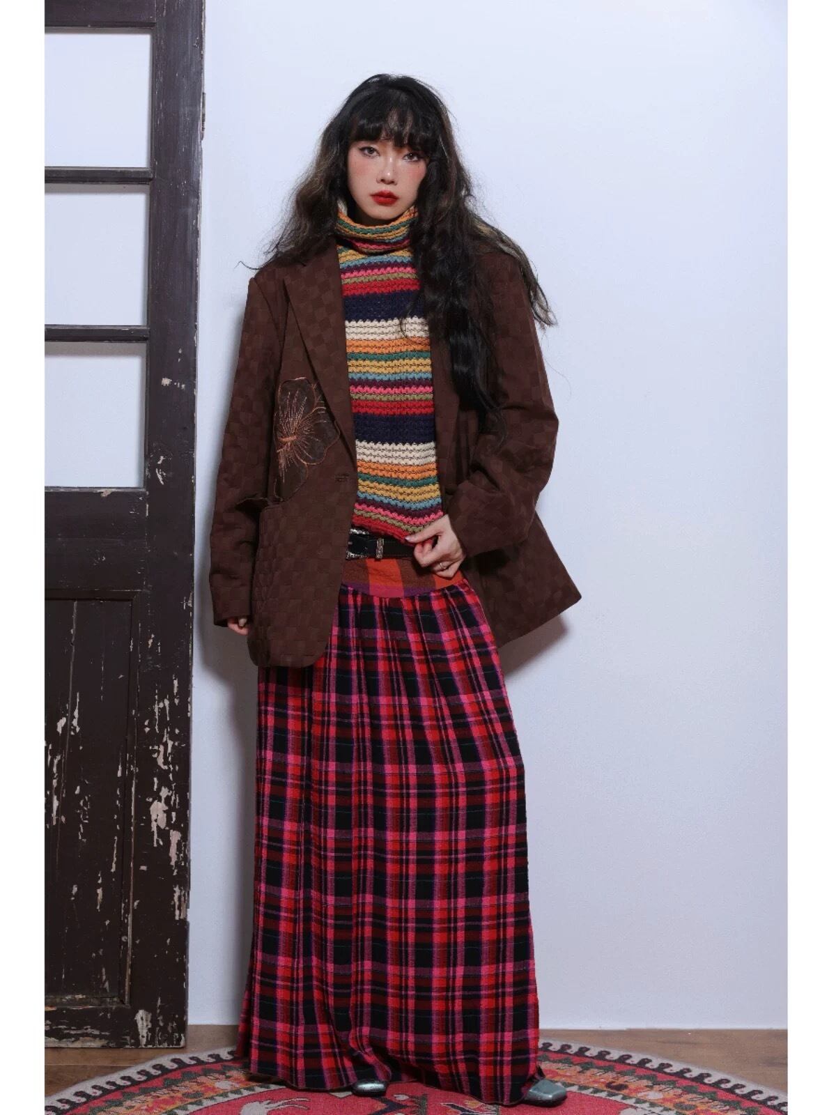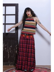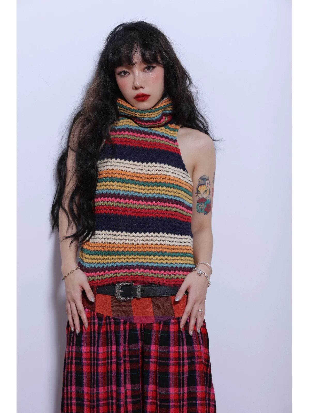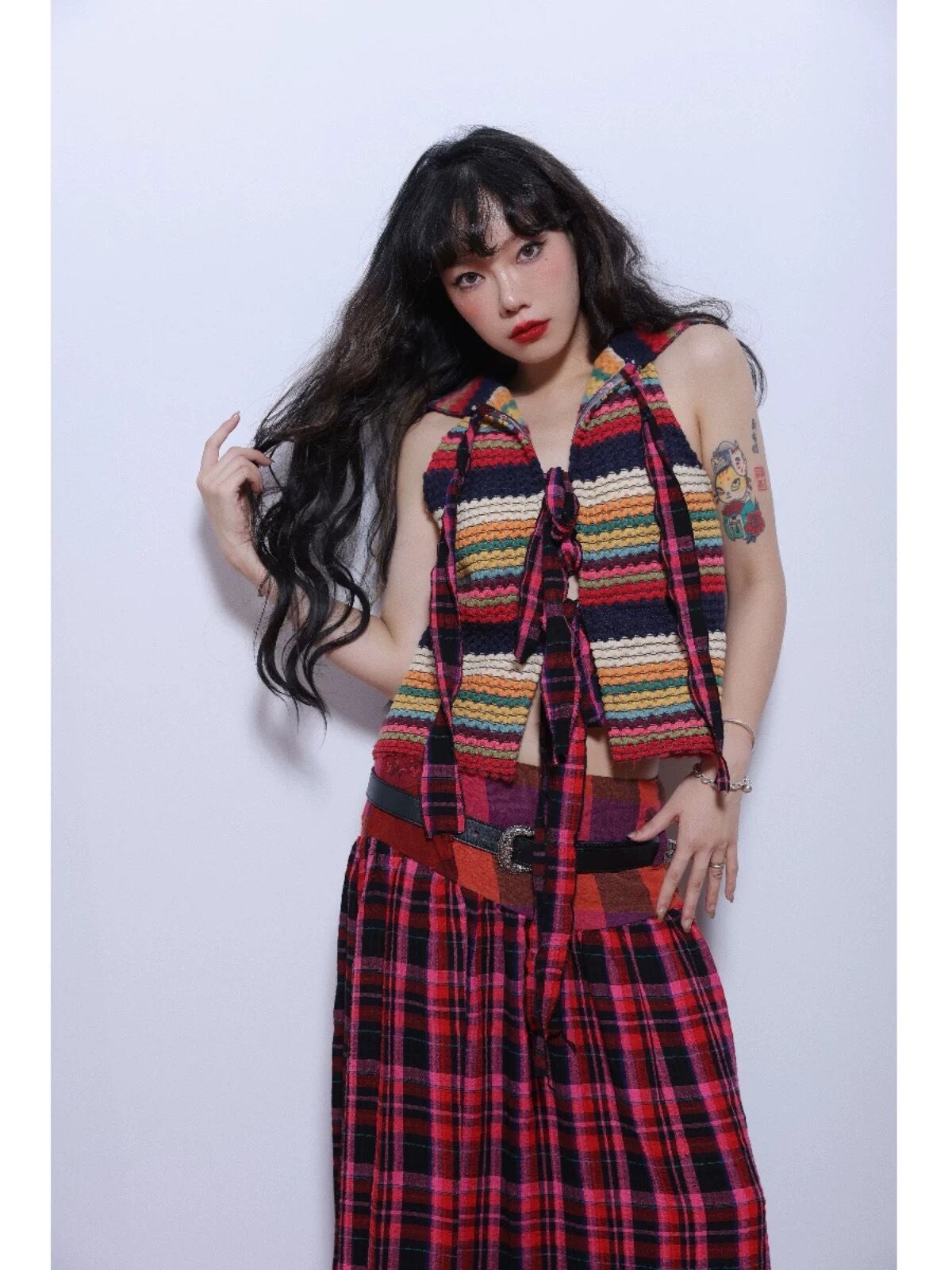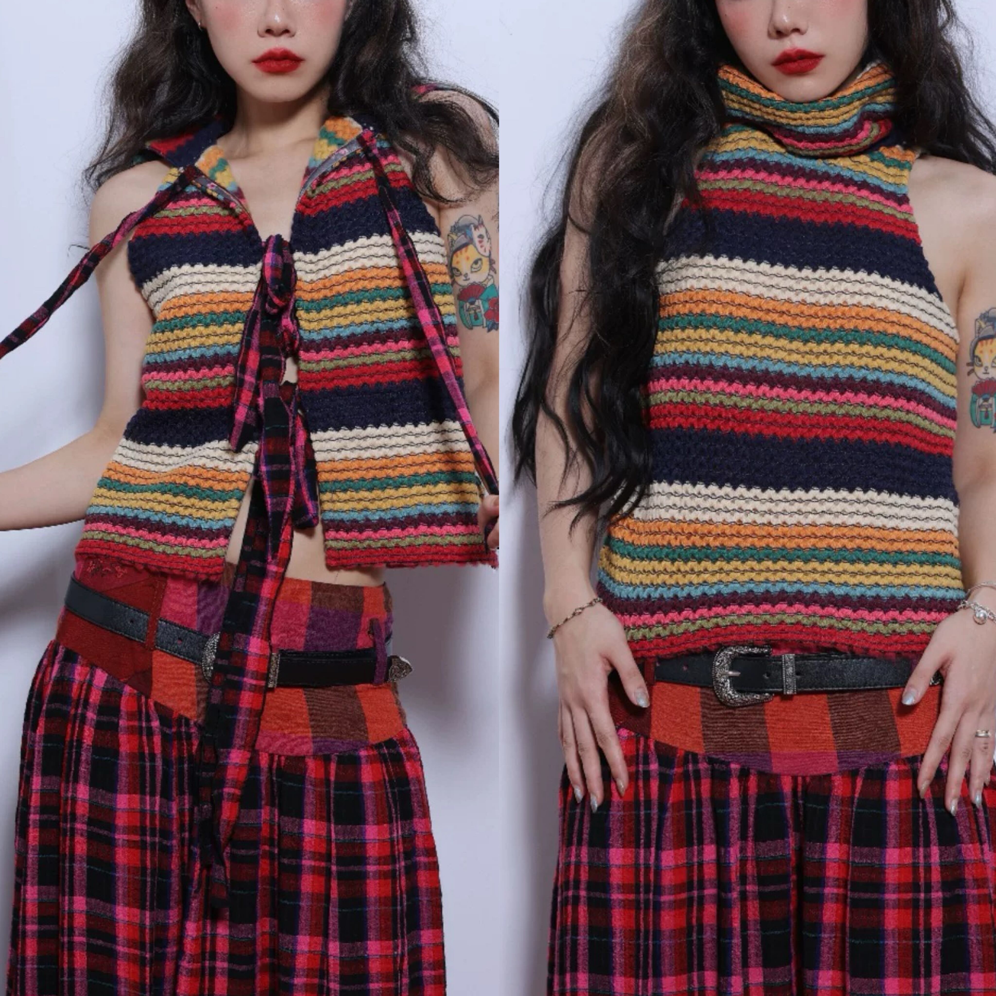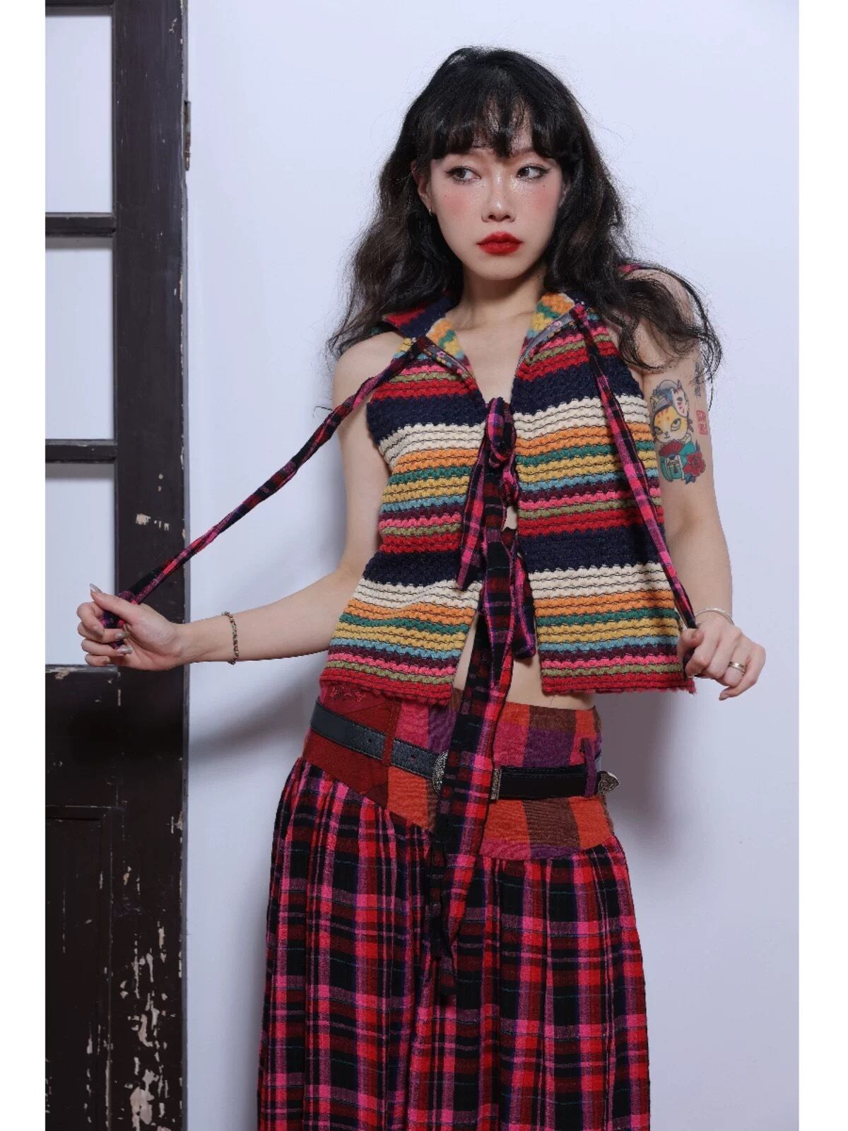ハイネック リボン ブラウス カラフル ボーダー カーディガン ブラウス エスニック リボン トップス