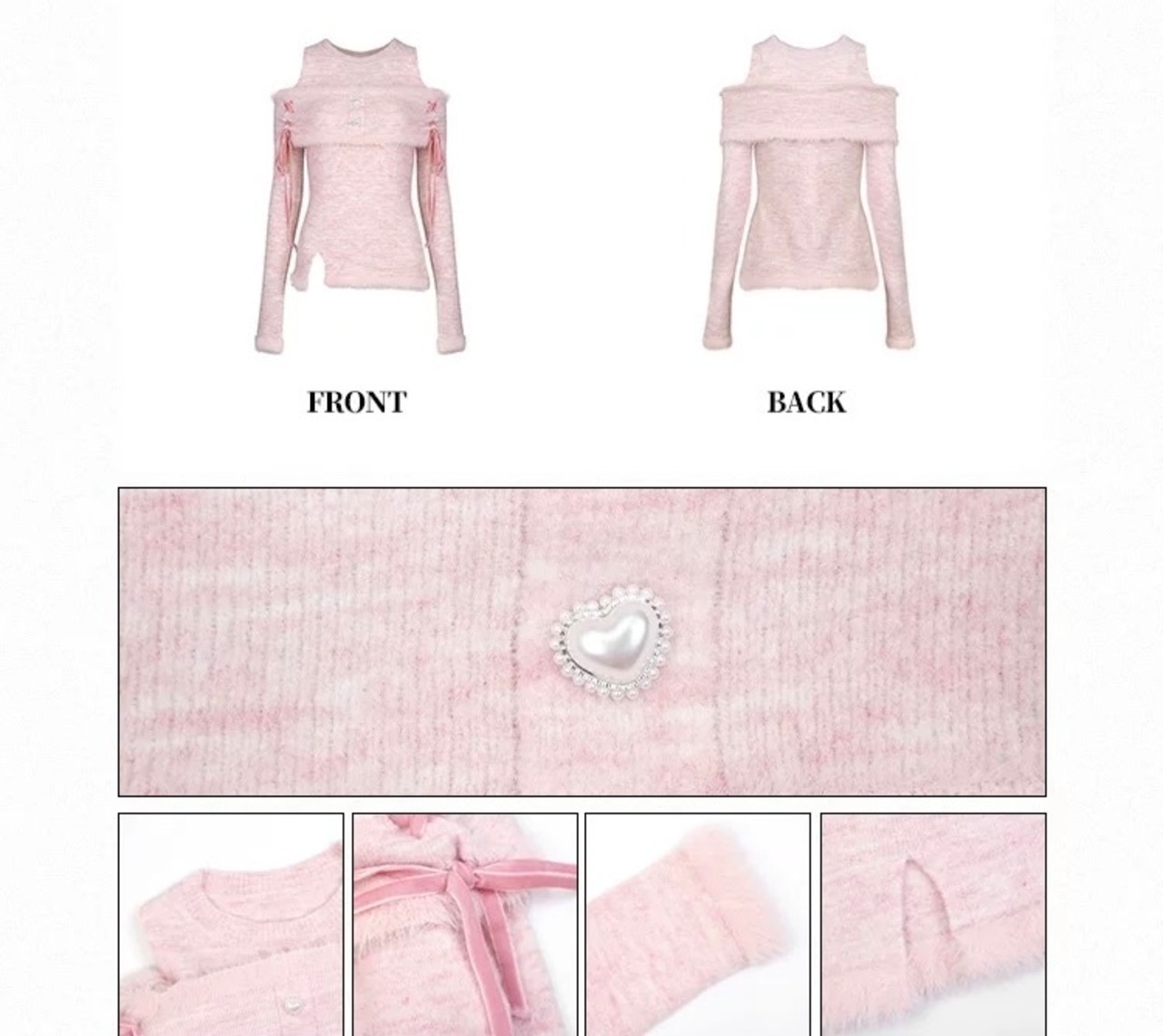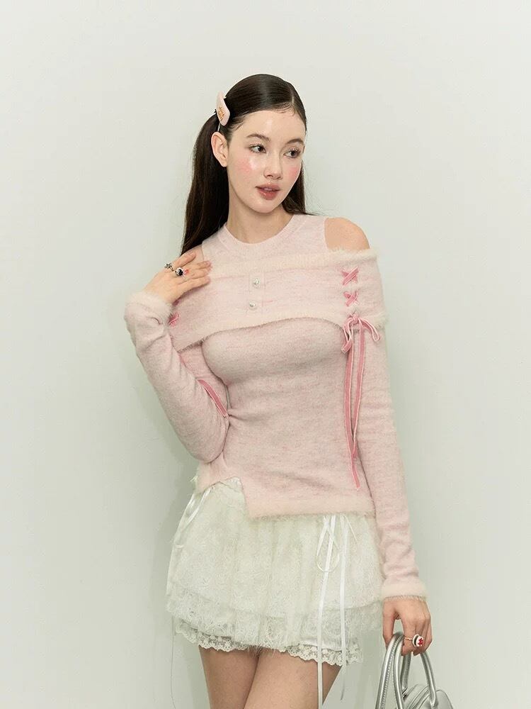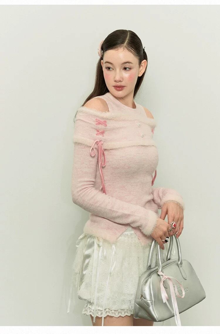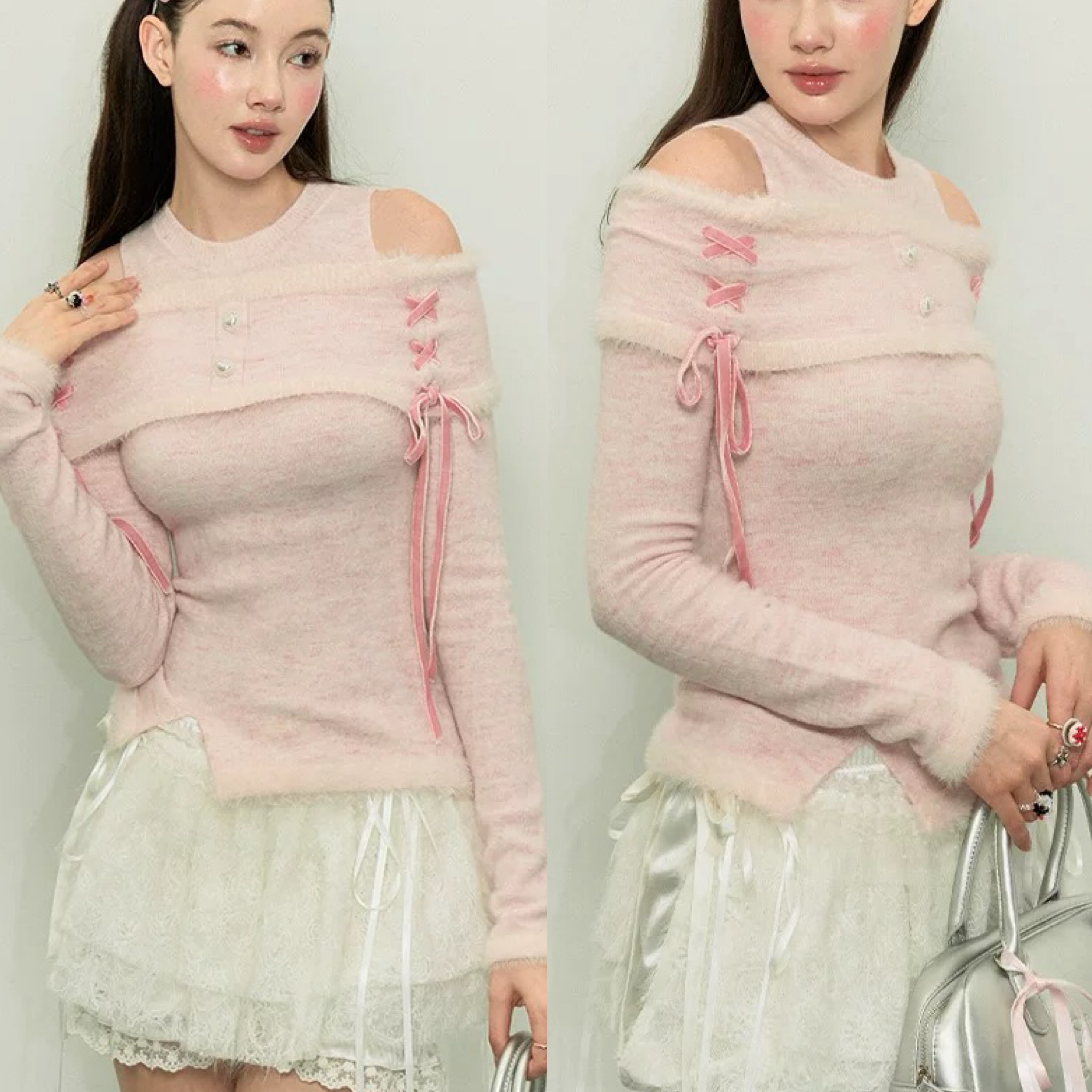 ピンク オフショルダー カーディガン セーター 可愛い リボン トップス ブラウス 原宿 ニット
