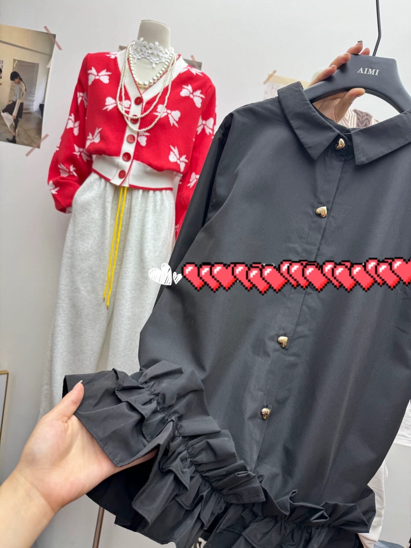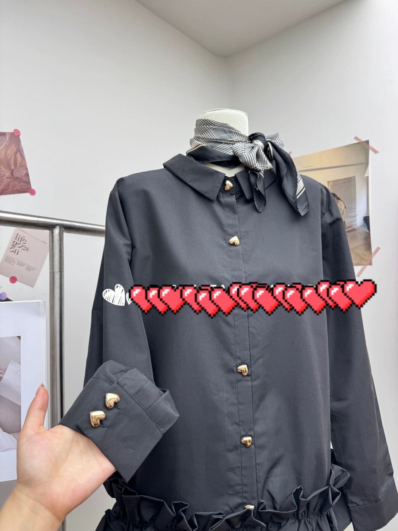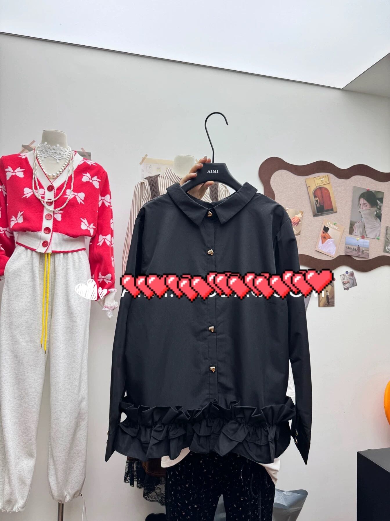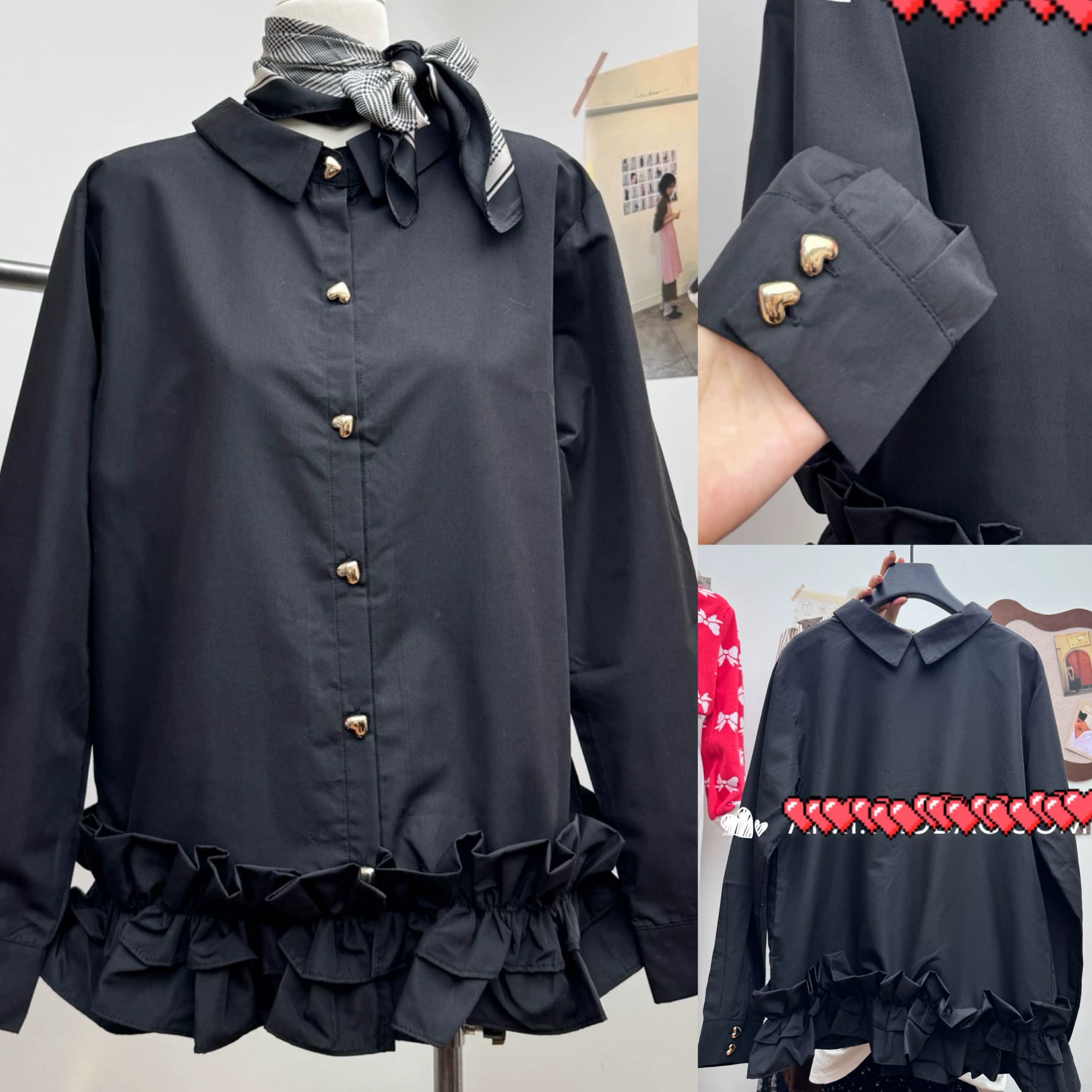 黒 ハート ボタン シャツ ブラウス シンプル カジュアル トップス ガーリー ジャケット