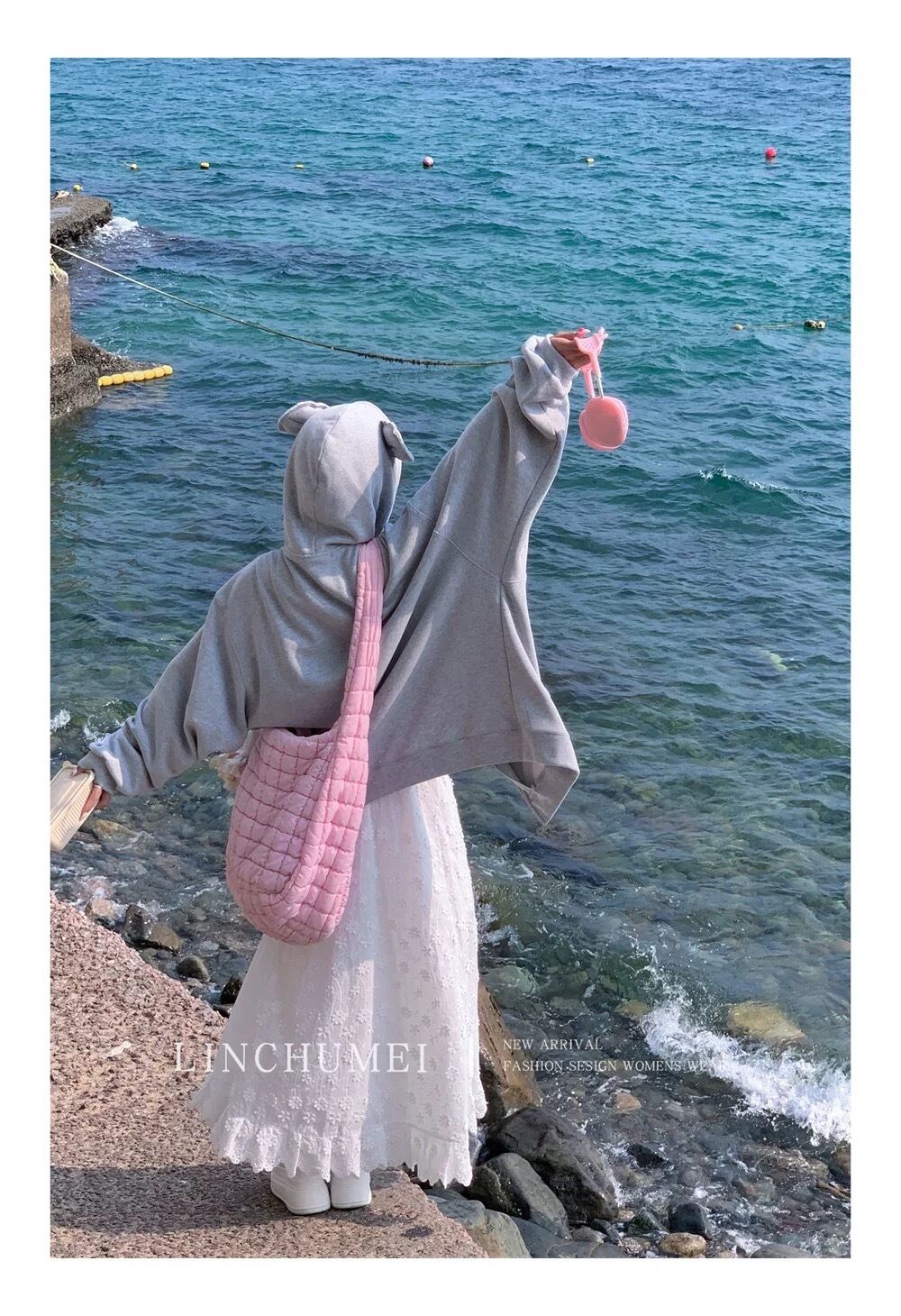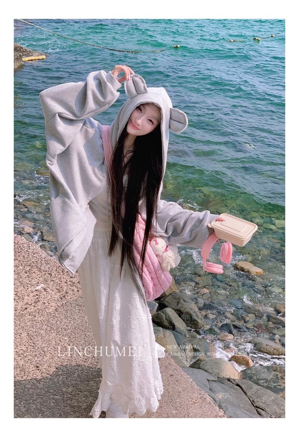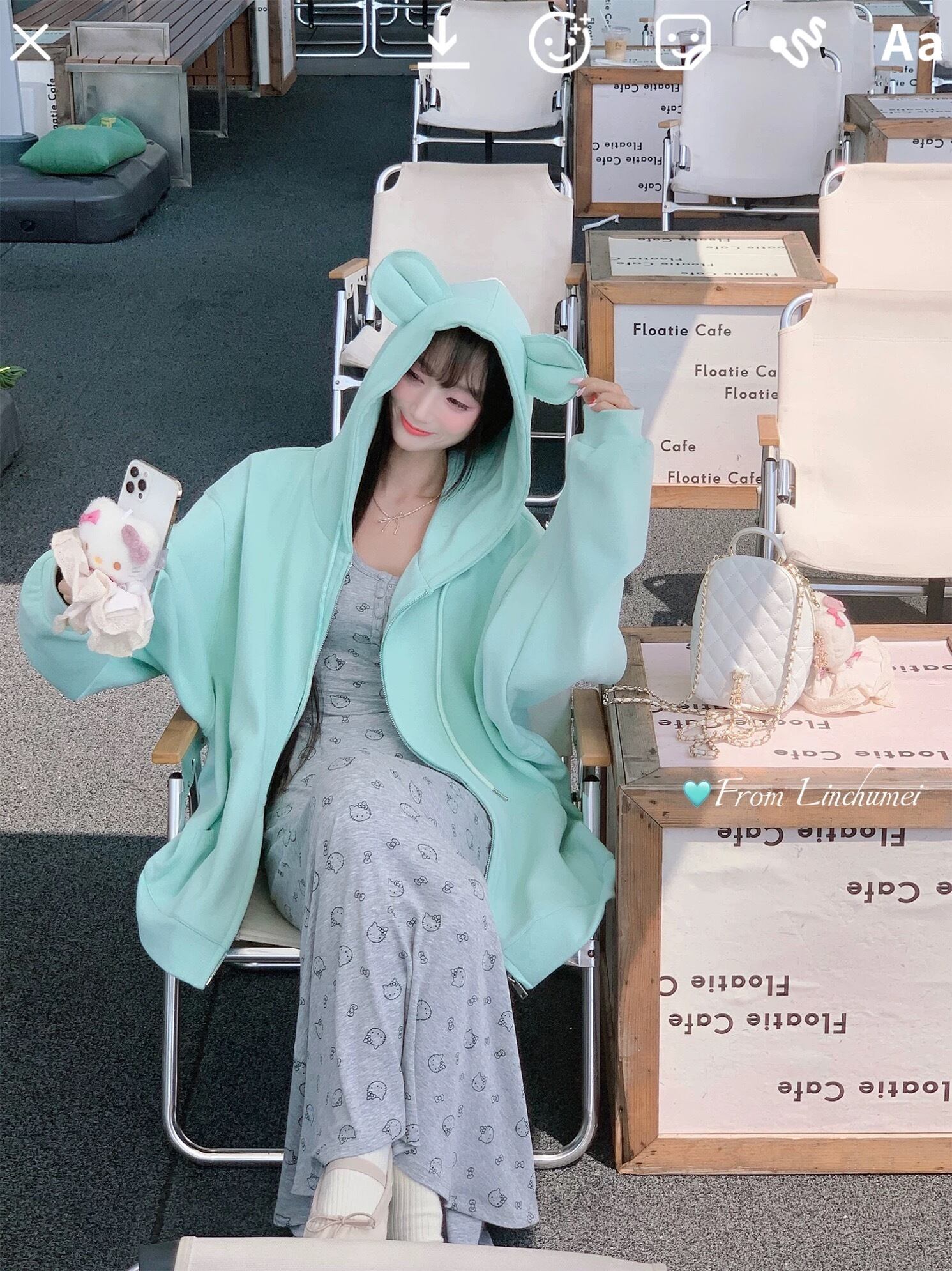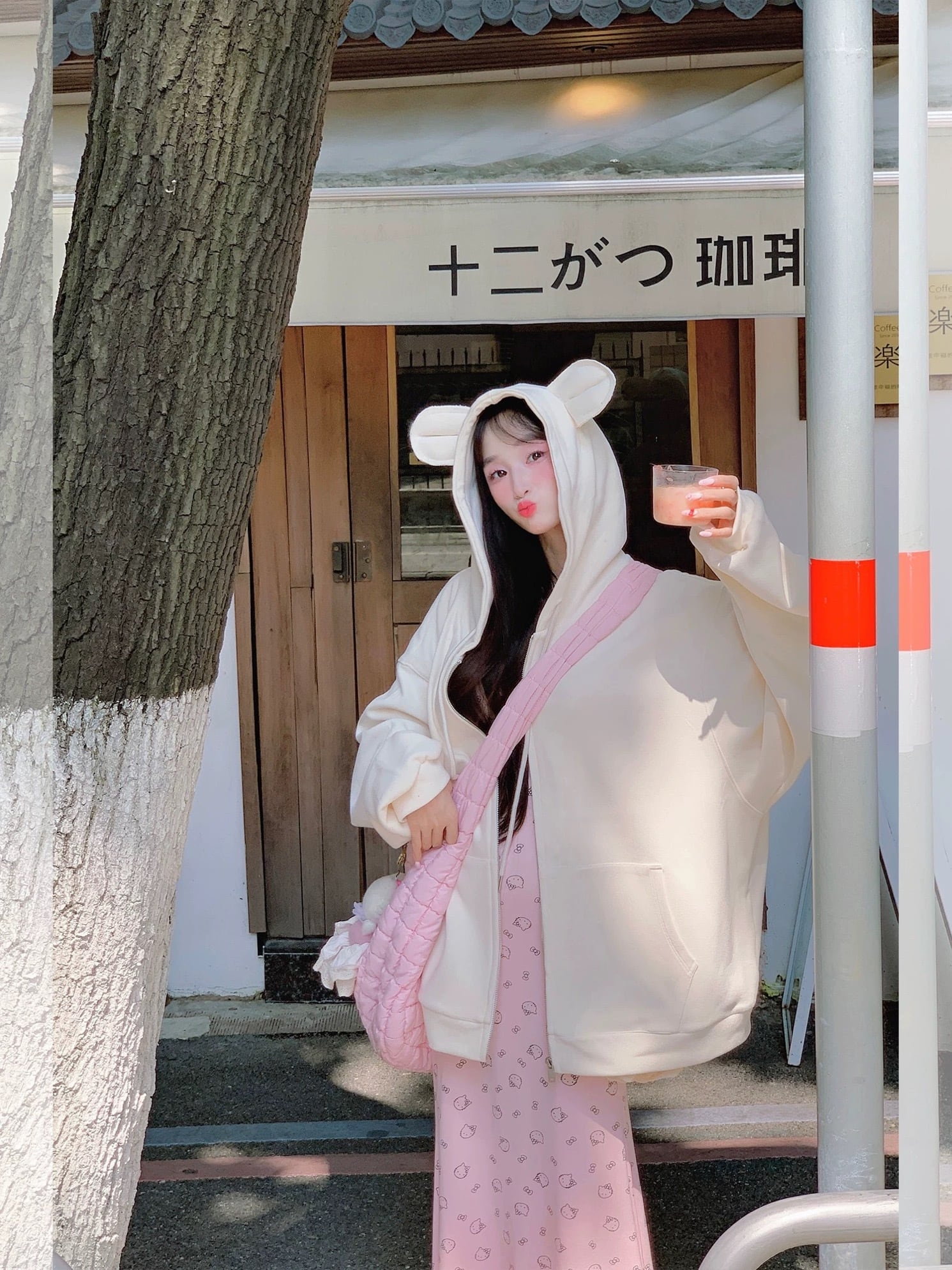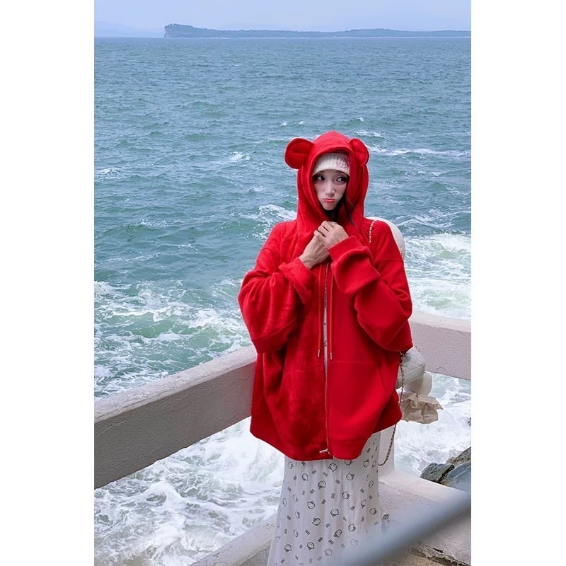 くまさん みみ パーカー グレー アイボリー 赤 緑 ピンク オーバーサイズ パーカー トレーナー スウェット シンプル カジュアル 可愛い 原宿