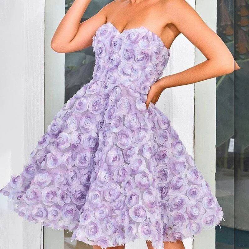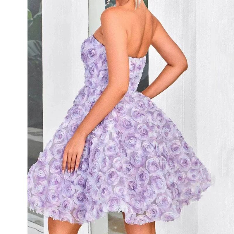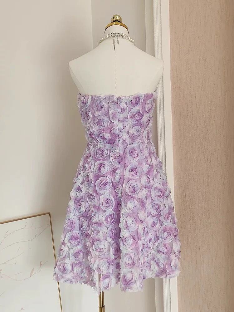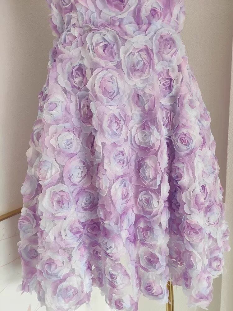フラワー ドレス 紫 薔薇 エレガント ワンピース カメリア ベアトップ パーティー