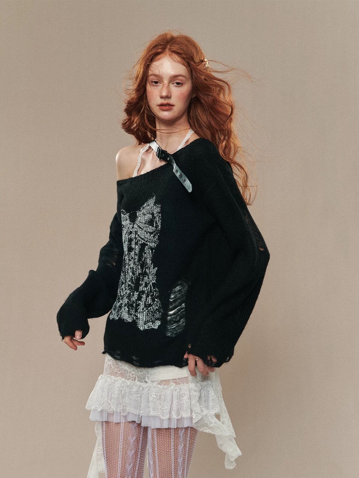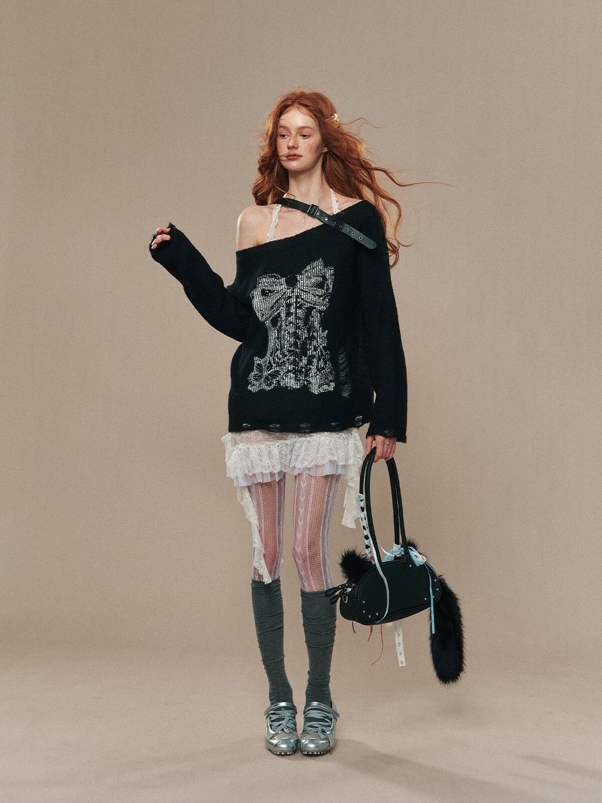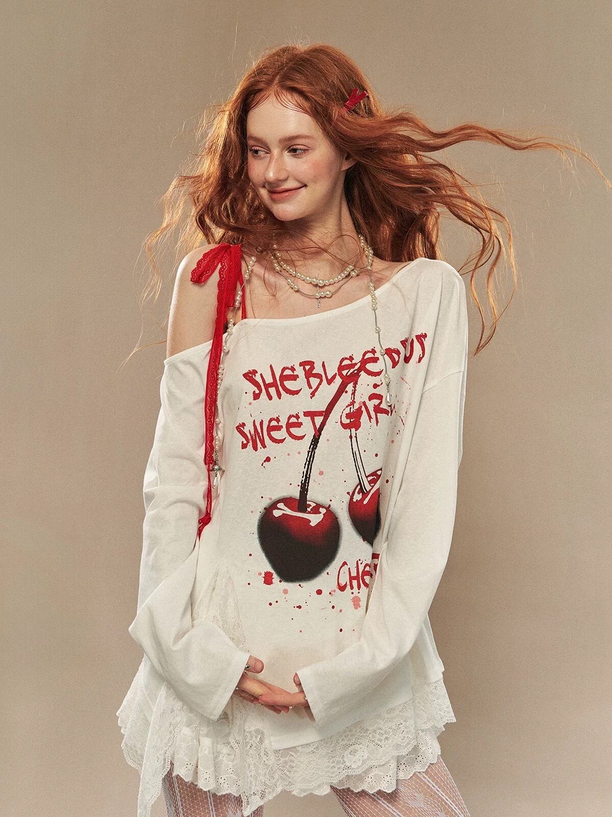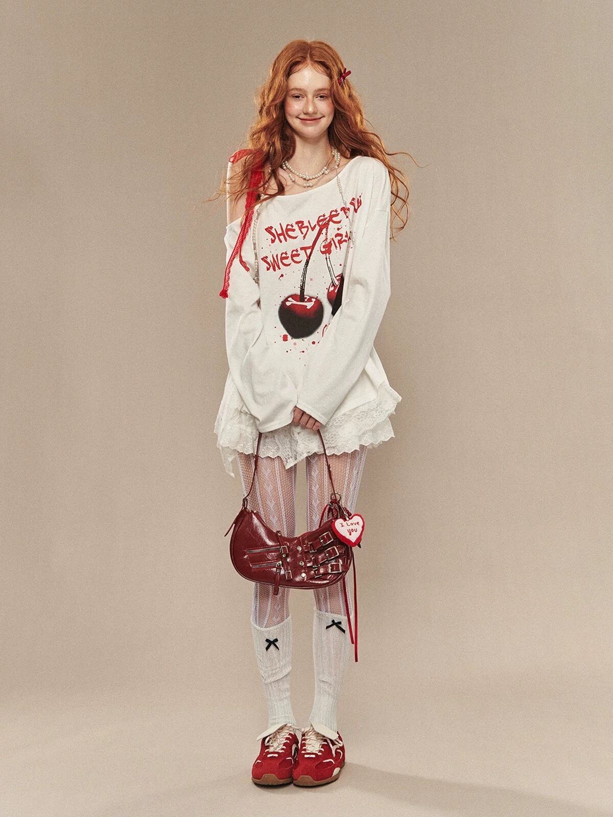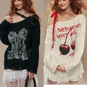 白 オフショルダー さくらんぼ 赤 黒 カーディガン セーター リボン ガーリー 原宿