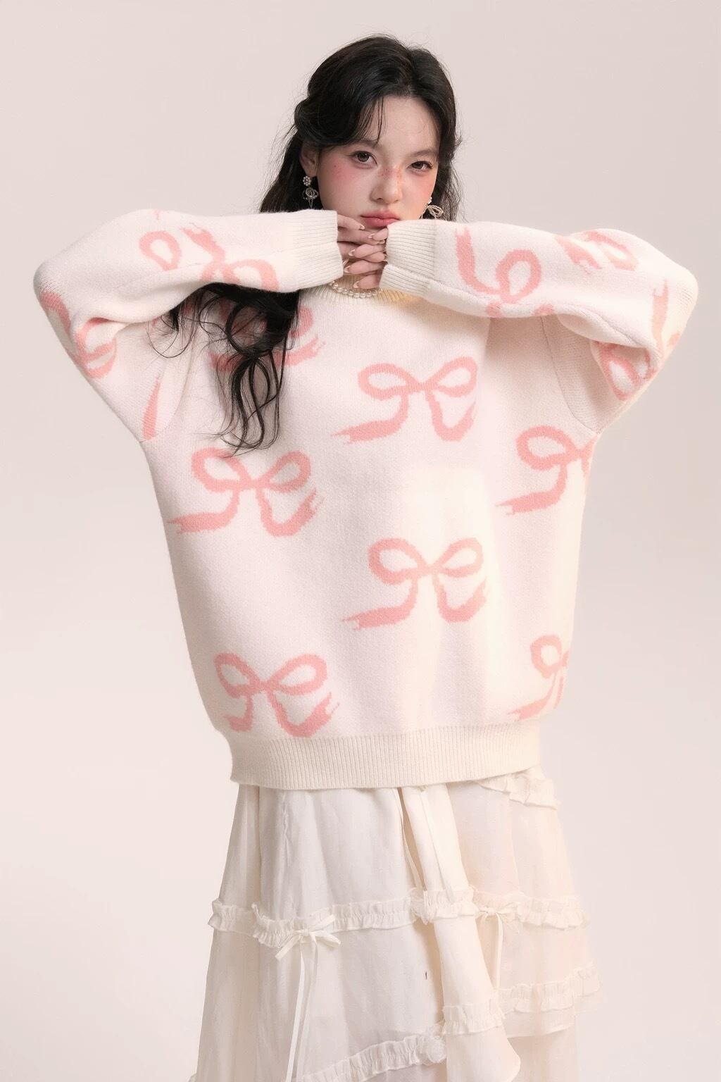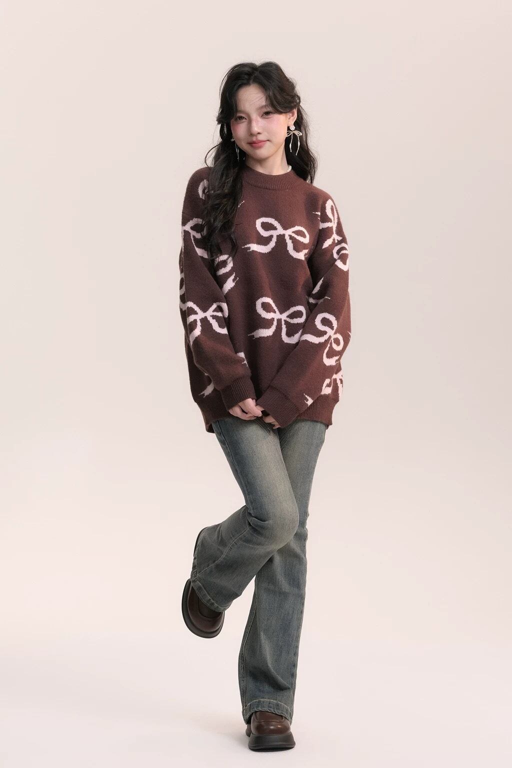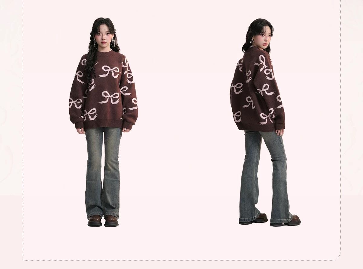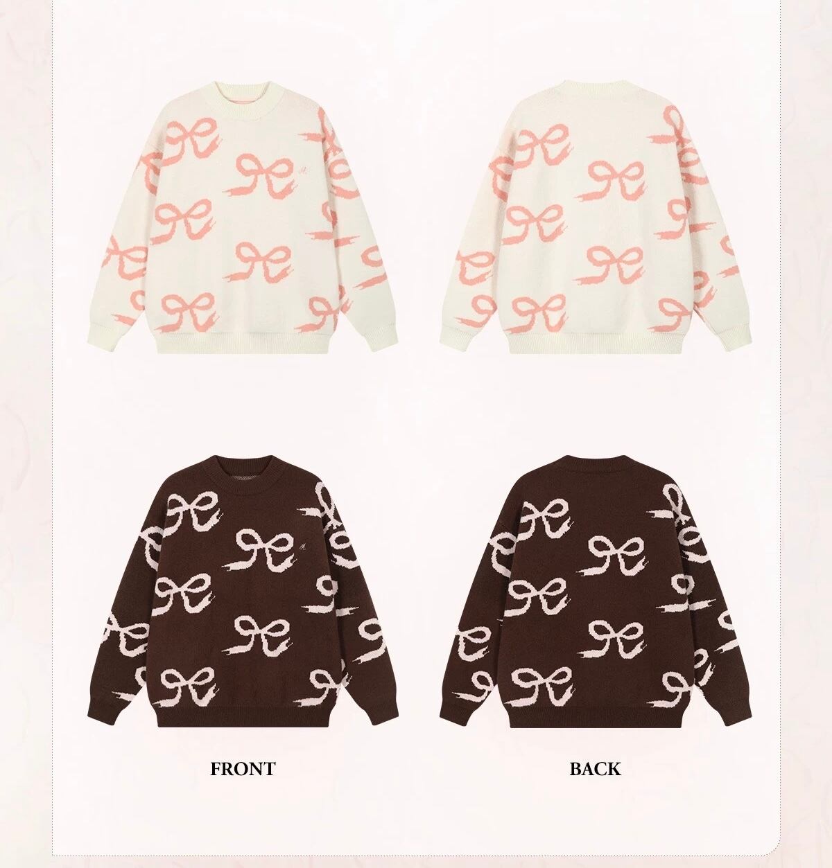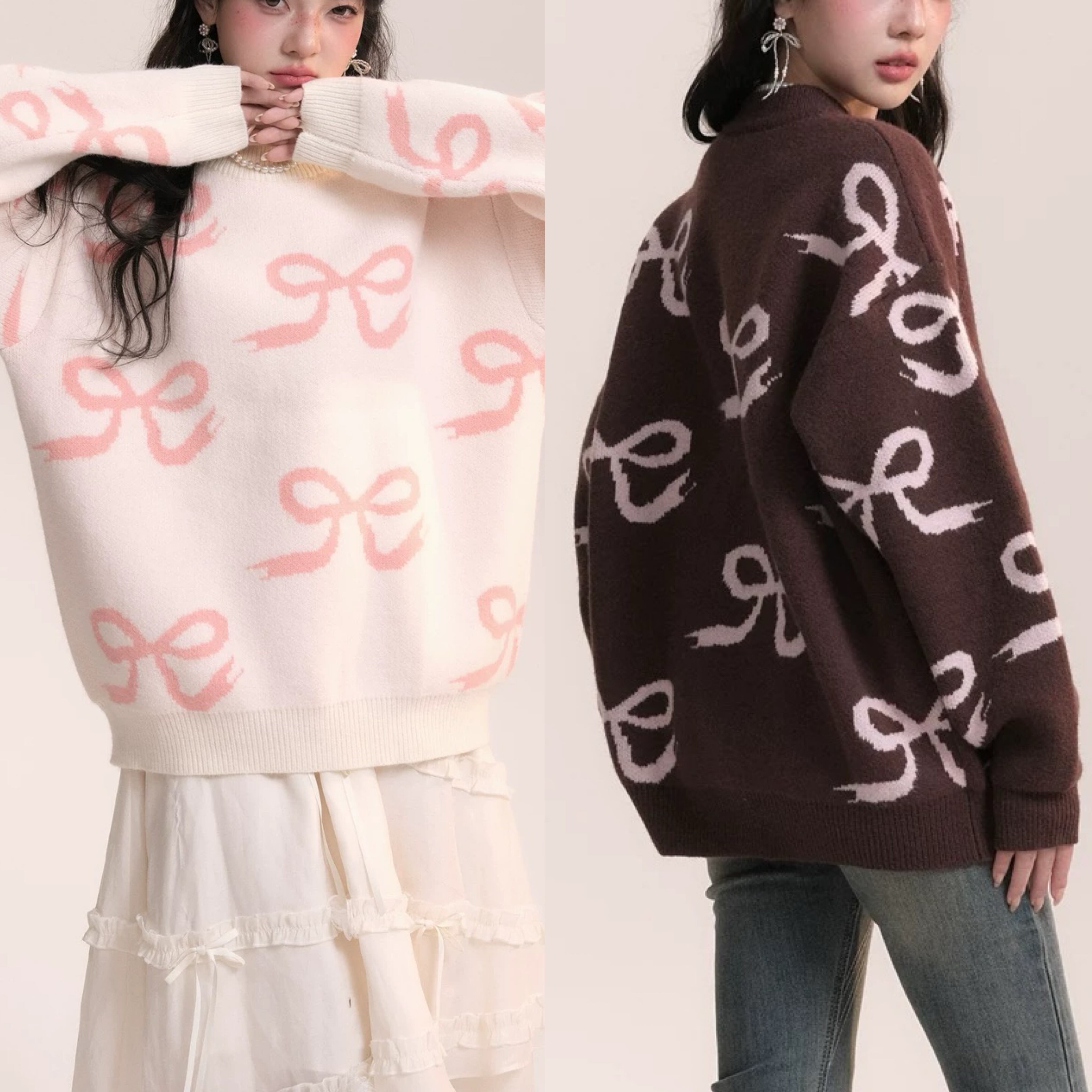 茶色 リボン ピンク 白 ニット セーター アウター カーディガン 可愛い 原宿