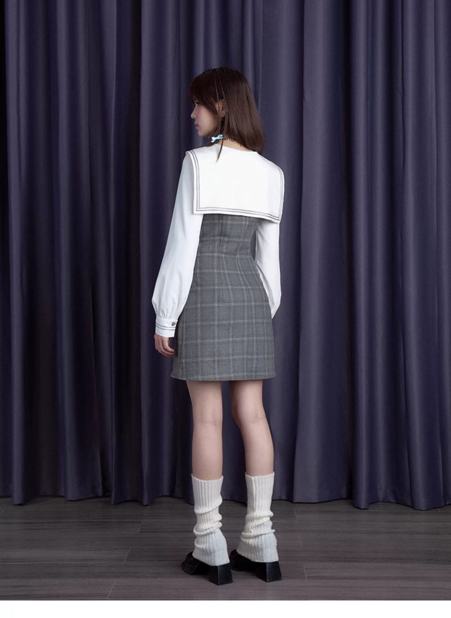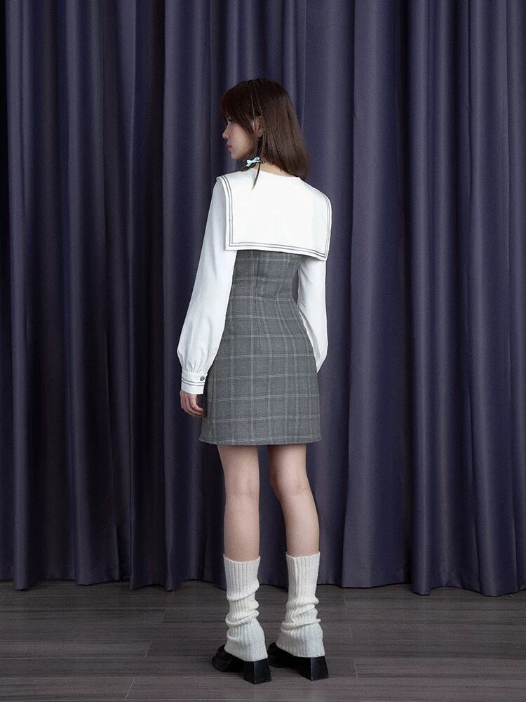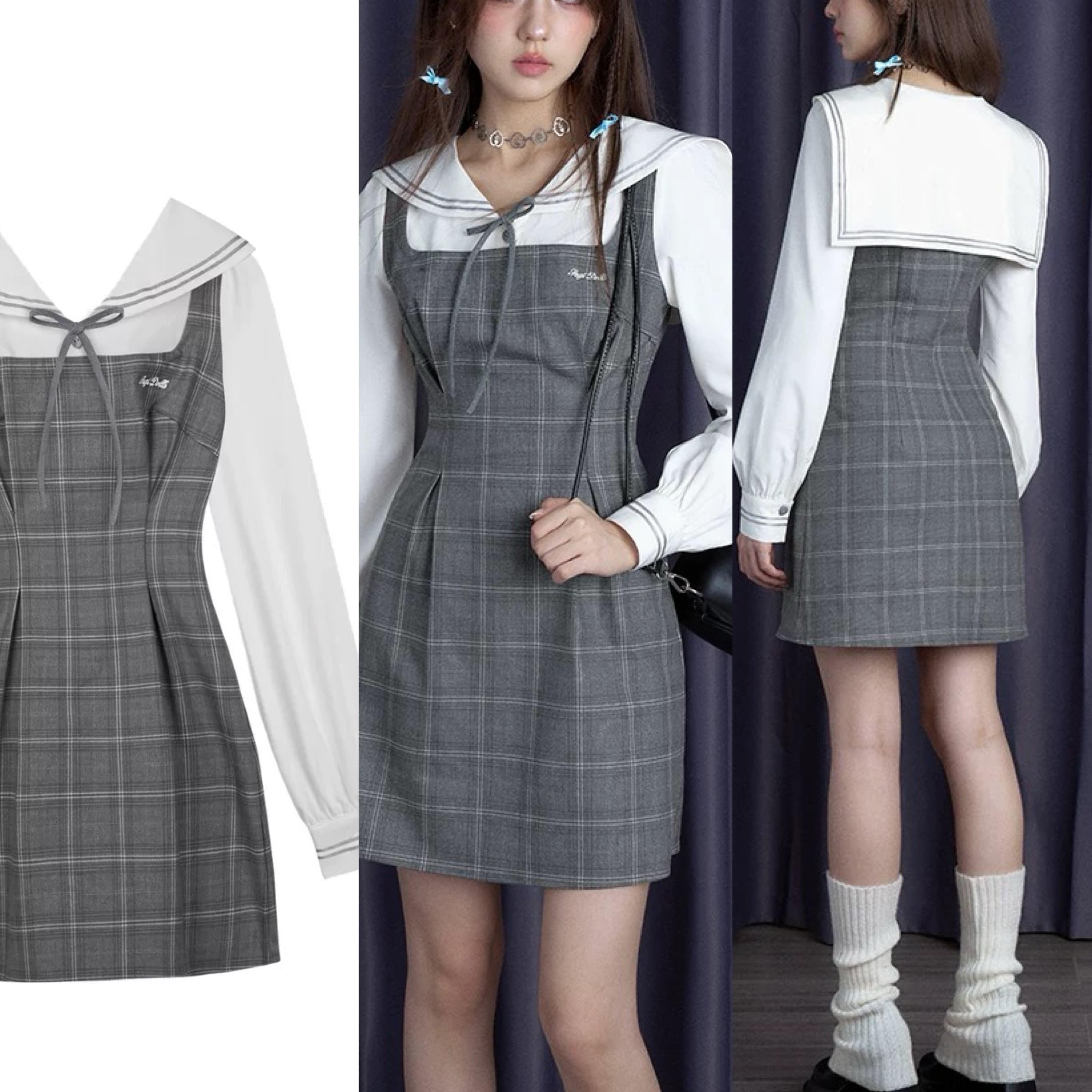 グレー ワンピース ガーリー チェック セーラー スクール 原宿 可愛い リボン