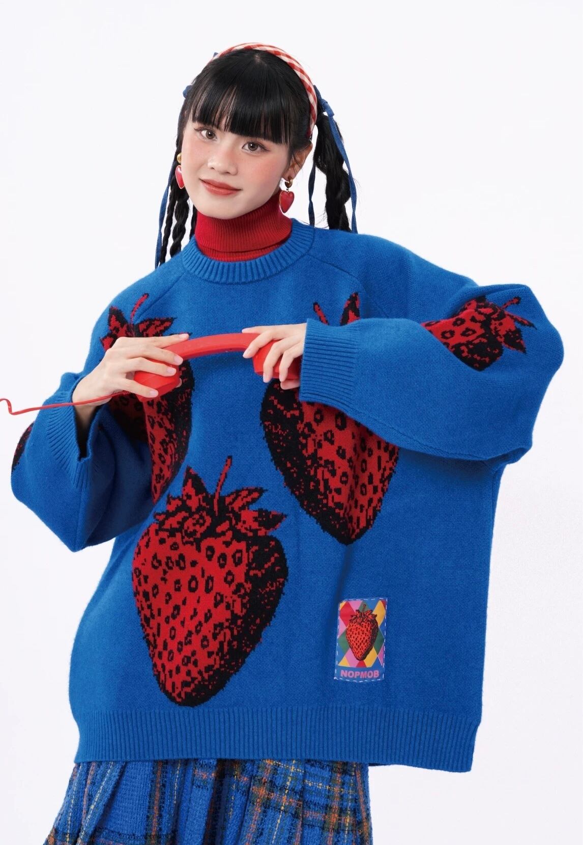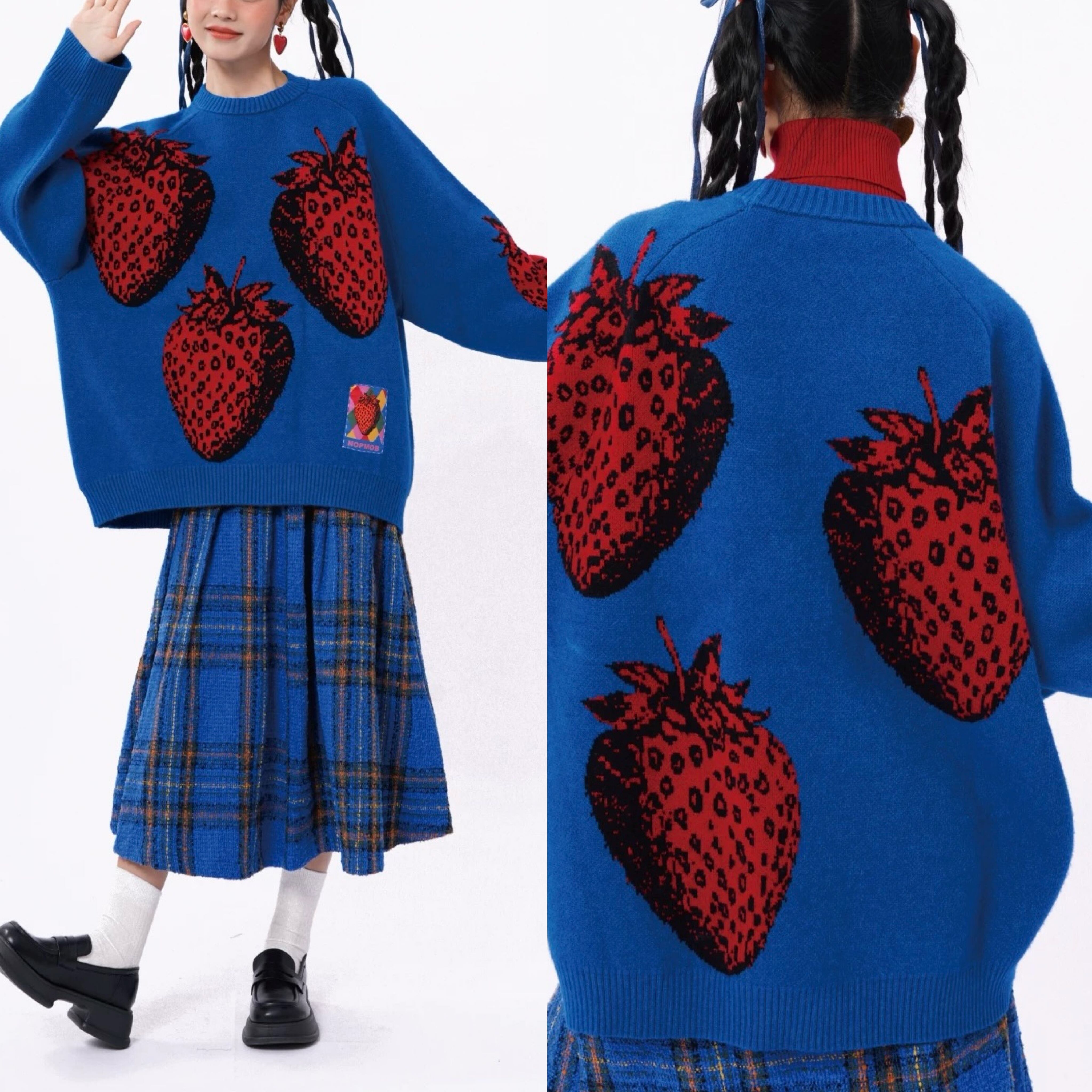 セーター ニット 水色 赤 いちご フルーツ オーバーサイズ ゆったり カーディガン